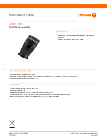 Karta katalogowa produktu SPOTLIGHT CROSSER | Latarki LED Obszar zastosowań _ Idealne dla czasu wolnego i aktywności fizycznej na zewnątrz _ W domu, w warsztacie lub na urlopie __ Korzyści ze stosowania produktu _ Antypoślizgowy, gumowany uchwyt _ Przylega do metalowych powierzchni dzięki wbudowanemu magnesowi (CROSSER Multifunction) _ Większa jasność dzięki technologii LED Cechy produktu _ Solidna jakość, wysoka jakość tworzywa _ Klasa ochronności: III _ Przedłużana główka (CROSSER Tube, CROSSER Multifunction) _ Ściemnialne aż do 50 % (CROSSER Tube, CROSSER Multifunction, CROSSER Spotlight) _ Funkcja migającego światła ostrzegawczego (CROSSER Multifunction) październik 22, 2014, 21:28:03 SPOTLIGHT OSRAM GmbH. Wszystkie prawa zastrzeżone. Strona 1 z 4 Karta katalogowa produktu Dane techniczne Dane elektryczne Moc znamionowy 3.3 W Napięcie znamionowy 6V Dane fotometryczne Temperatura barwowa 6500 K Strumień świetlny 241.95 lm Barwa światła zgodna z EN 12464-1 Cool white Dane świetlne Kąt rozsyłu światła 170 ° Wymiary i waga __ Długość 216.0 mm Szerokość 135.0 mm Średnica 133.0 mm Wysokość 135.0 mm Kolory i materiały Materiał plastic Kolor produktu Szary Materiał osłony plastic Temperatury Zakres temperatury otoczenia ≤ +25 °C Dodatkowe dane produktu Liczba źródeł światła 1 Wyposażenie LED Wyposażony w lampę Tak Możliwości Regulowany Nie Akcesoria Pas Certyfikaty i Normy Normy październik 22, 2014, 21:28:03 SPOTLIGHT CE OSRAM GmbH. Wszystkie prawa zastrzeżone. Strona 2 z 4 Karta katalogowa produktu Klasa ochronności III Kraj - specyficzna kategoryzacja Oznaczenie produktu 46650 __ październik 22, 2014, 21:28:03 SPOTLIGHT OSRAM GmbH. Wszystkie prawa zastrzeżone. Strona 3 z 4 Karta katalogowa produktu Wyposażenie / Akcesoria _ Bateria w zestawie (CROSSER Micro) _ Karabińczyk w zestawie (CROSSER Tube) Oświadczenie Zastrzega się możliwość zmian bez uprzedzenia. Błędy i ominięcia są możliwe. Należy zawsze upewnić się czy korzystasz z najnowszej wersji katalogu. __ październik 22, 2014, 21:28:03 SPOTLIGHT OSRAM GmbH. Wszystkie prawa zastrzeżone. Strona 4 z 4