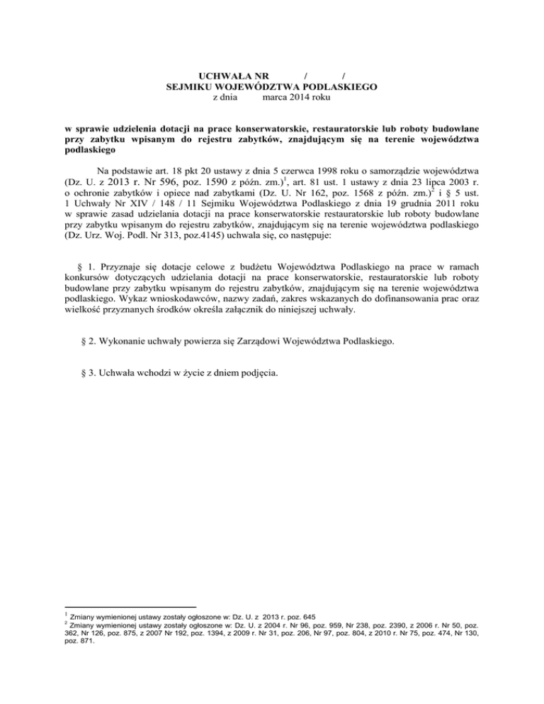 UCHWAŁA NR / / SEJMIKU WOJEWÓDZTWA PODLASKIEGO z dnia marca 2014 roku w sprawie udzielenia dotacji na prace konserwatorskie, restauratorskie lub roboty budowlane przy zabytku wpisanym do rejestru zabytków, znajdującym się na terenie województwa podlaskiego Na podstawie art. 18 pkt 20 ustawy z dnia 5 czerwca 1998 roku o samorządzie województwa (Dz. U. z 2013 r. Nr 596, poz. 1590 z późn. zm.)1, art. 81 ust. 1 ustawy z dnia 23 lipca 2003 r. o ochronie zabytków i opiece nad zabytkami (Dz. U. Nr 162, poz. 1568 z późn. zm.)2 i § 5 ust. 1 Uchwały Nr XIV / 148 / 11 Sejmiku Województwa Podlaskiego z dnia 19 grudnia 2011 roku w sprawie zasad udzielania dotacji na prace konserwatorskie restauratorskie lub roboty budowlane przy zabytku wpisanym do rejestru zabytków, znajdującym się na terenie województwa podlaskiego (Dz. Urz. Woj. Podl. Nr 313, poz.4145) uchwala się, co następuje: § 1. Przyznaje się dotacje celowe z budżetu Województwa Podlaskiego na prace w ramach konkursów dotyczących udzielania dotacji na prace konserwatorskie, restauratorskie lub roboty budowlane przy zabytku wpisanym do rejestru zabytków, znajdującym się na terenie województwa podlaskiego. Wykaz wnioskodawców, nazwy zadań, zakres wskazanych do dofinansowania prac oraz wielkość przyznanych środków określa załącznik do niniejszej uchwały. § 2. Wykonanie uchwały powierza się Zarządowi Województwa Podlaskiego. § 3. Uchwała wchodzi w życie z dniem podjęcia. 1 Zmiany wymienionej ustawy zostały ogłoszone w: Dz. U. z 2013 r. poz. 645 Zmiany wymienionej ustawy zostały ogłoszone w: Dz. U. z 2004 r. Nr 96, poz. 959, Nr 238, poz. 2390, z 2006 r. Nr 50, poz. 362, Nr 126, poz. 875, z 2007 Nr 192, poz. 1394, z 2009 r. Nr 31, poz. 206, Nr 97, poz. 804, z 2010 r. Nr 75, poz. 474, Nr 130, poz. 871. 2 Załącznik do Uchwały Nr / / Sejmiku Województwa Podlaskiego z dnia 2014r. L.p. Wnioskodawca Tytuł zadania Proponowana kwota dotacji 1. Parafia Prawosławna p.w. "Opieki Matki Bożej" w Zubaczach Uzupełnienie szalówki w głównej kopule cerkwi oraz częściowa wymiana w ołtarzu i części środkowej cerkwi, przedsionku i panamarkach 20 000 2. Parafia Rzymskokatolicka p.w. Ofiarowania NMP w Różanymstoku Konserwacja elementów płaskorzeźbionych, murowanych, tynkowanych, polichromowanych i złoconych ołtarza bocznego Serca Pana Jezusa znajdującego się w kościele parafialnym p.w. Ofiarowania NMP w Różanymstoku 25 000 3. Parafia Rzymskokatolicka p.w. Św. Jana Apostoła i Ewangelisty w Knyszynie Renowacja ołtarza bocznego "Św. Antoniego" w Kościele Parafialnym p.w. Św. Jana Apostoła i Ewangelisty w Knyszynie 15 000 4. Parafia Rzymskokatolicka Św. Trójcy w Jasionówce Przeprowadzenie prac konserwatorskich przy ołtarzu bocznym Św. Jana Nepomucena 25 000 5. Parafia Rzymskokatolicka p.w. Trójcy Przenajświętszej w Rudce Renowacja ołtarza głównego z II poł. XVIII w., barok, rokoko z kościoła parafialnego p.w. Trójcy Przenajświętszej w Rudce OSTATNI ETAP 28 000 6. Parafia Rzymskokatolicka p.w. Św. Jana Chrzciciela w Turośli Remont kościoła p.w. Św. Jana Chrzciciela w Turośli - III etap 30 000 7. Archidiecezja Białostocka Izolacja stropodachu i wymiana stolarki - II etap prac przy budynku dawnej plebanii przykościelnej 23 000 8. Parafia Rzymskokatolicka p.w. Przemienienia Pańskiego w Wasilkowie Restauracja i konserwacja krzyża zabytkowego z I poł. XVII w. 7 000 9. Staroobrzędowa Gmina Wyznaniowa Wschodniego Kościoła Staroobrzedowego Nieposiadającego Hierarchii Duchowej w Gabowych Grądach Remont Molenny Staroobrzędowej Gminy Wyznaniowej w Gabowych Grądach p.w. Zaśnięcia Najświętszej Matki Bożej - II etap 34 000 10. Klasztor Sióstr Benedyktynek w Drohiczynie Konserwacja rzeźby drewnianej polichromowej "Św. Scholastyka", XVIII w. z wyposażenia Klasztoru SS Benedyktynek, ul. Benedyktyńska 6 20 000 Zakres prac do dofinansowania 11. 12. 13. Parafia Rzymskokatolicka p.w. Św. Antoniego Padewskiego w Sokółce Konserwacja ołtarza bocznego p.w. Św. Michała Archanioła z wyposażenia kościoła parafialnego p.w. Św. Antoniego Padewskiego w Sokółce 25 000 Katolickie Gimnazjum im. Kardynała Stefana Wyszyńskiego w Łomży Remont holu wejściowego oraz klatek schodowych z odtworzeniem zabytkowego charakteru wnętrza obiektu w Katolickim Gimnazjum im. Kardynała Stefana Wyszyńskiego w Łomży, ul. Sadowa 12 - II etap 25 000 Remont zabytkowej elewacji budynku Katolicka Bursa Szkolna im. Katolickiej Bursy Szkolnej im. Księdza Kardynała Stefana Księdza Kardynała Stefana Wyszyńskiego w Łomży Wyszyńskiego przy placu Papieża Jana Pawła II 1 30 000 14. Parafia Rzymskokatolicka p.w. Imienia Najświętszej Maryi Panny w Szczuczynie Wykonanie projektu budowlanego odwodnienia zabytkowych obiektów klasztoru i kościoła p.w. Imienia Najświętszej Maryi Panny w Szczuczynie oraz zagospodarowania terenu przyległego 15. Parafia Prawosławna p.w. Św. Apostoła i Ewangelisty Łukasza w Tyniewiczach Dużych Remont Cerkwi Św. Apostoła i Ewangelisty Łukasza w Tyniewiczach Dużych - etap I 20 000 16. Parafia Prawosławna p.w. Św. Mikołaja Cudotwórcy w Kośnej Prace konserwatorskie przy zabytku ruchomym tj.: ikona - Św. Mikołaj Cudotwórca (I poł. XIX w.-ikona, 1934 r.-rama) z wyposażenia cerkwi parafialnej p.w. Św. Mikołaja Cudotwórcy w Kośnej 4 000 17. Parafia Prawosławna p.w. Przemienienia Pańskiego w Ploskach Malowanie wewnętrznych ścian i sufitu cerkwi prawosławnej p.w. Przemienienia Pańskiego w Ploskach 8 000 18. Matylda Wochniak Wymiana unikatowych okien skrzynkowych tzw. "Oślich Grzbietów" w elewacji frontowej - II etap prac konserwatorskich, restauratorskich i robót budowlanych kamienicy "Ośle Grzbiety" (18981899), Białystok, ul. Lipowa 28 18 000 19. Parafia Prawosławna p.w. Śww. App. Piotra i Pawła w Samogródzie Remont i konserwacja ścian zewnętrznych, szalówki i podwalin w cerkwi parafialnej p.w. Śww. App. Piotra i