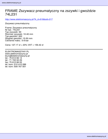 www.elektromaszyny.pl FRAME Zszywacz pneumatyczny na zszywki i gwoździe 74L231 http://www.elektromaszyny.pl/?k_d=618&sid=217 Zszywacz pneumatyczny. Frame: Zszywacz pneumatyczny Nr kat.: 74L231 Typ zszywek: 90 Rozmiar zszywek: 10-40 mm Typ gwoździ: 300 Długość gwoździ: 15-50 mm Ciśnienie maks.: 5-8 bar Cena: 127.17 zł + 23% VAT = 156.42 zł ELEKTROMASZYNY.PL www.elektromaszyny.pl [email protected] tel.: 75 612 66 14 tel.: 71 722 02 29 fax: 75 612 66 02 tel. kom: 510 410 288 tel. kom: 509 767 001 www.elektromaszyny.pl