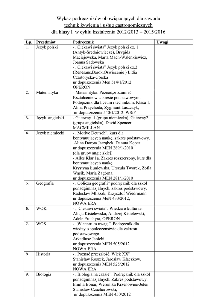 Wykaz podręczników obowiązujących dla zawodu technik żywienia i usług gastronomicznych dla klasy I w cyklu kształcenia 2012/2013 – 2015/2016 Lp. Przedmiot 1. Język polski 2. Matematyka 3. Język angielski 4. Język niemiecki 5. Geografia 6. WOK 7. WOS 8. Historia 9. Biologia Podręcznik - „Ciekawi świata” Język polski cz. 1 (Antyk-Średniowiecze), Brygida Maciejewska, Marta Mach-Walenkiewicz, Joanna Sadowska - „Ciekawi świata” Język polski cz.2 (Renesans,Barok,Oświecenie ) Lidia Czartoryska-Górska nr dopuszczenia Men 514/1/2012 OPERON - Mateamtyka. Poznać,zrozumieć. Kształcenie w zakresie podstawowym. Podręcznik dla liceum i technikum. Klasa 1. Alina Przychoda, Zygmunt Łaszczyk, nr dopuszczenia 540/1/2012. WSiP - Gateway 1 (grupa niemiecka), Gateway2 (grupa angielska), David Spencer. MACMILLAN - „Motive Deutsch”, kurs dla kontynuujących naukę, zakres podstawowy. Alina Dorota Jarząbek, Danuta Koper, nr dopuszczenia MEN 289/1/2010 (dla grupy angielskiej) - Alles Klar 1a. Zakres rozszerzony, kurs dla kontynuujących naukę. Krystyna Łuniewska, Urszula Tworek, Zofia Wąsik, Maria Zagórna, nr dopuszczenia MEN 281/1/2010 - „Oblicza geografii” podręcznik dla szkół ponadgimnazjalnych, zakres podstawowy. Radosław Mliszak, Krzysztof Wiedrmann. nr dopuszczenia MeN 433/2012, NOWA ERA - „ Ciekawi świata”. Wiedza o kulturze. Alicja Kisielewska, Andrzej Kisielewski, Adele Prochyra, OPERON - „W centrum uwagi”. Podręcznik dla wiedzy o społeczeństwie dla zakresu podstawowego. Arkadiusz Janicki, nr dopuszczenia MEN 505/2012 NOWA ERA - „Poznać przeszłość. Wiek XX” Stanisław Roszek, Jarosław Kłaczkow, nr dopuszczenia MEN 525/2012 NOWA ERA - „Biologia na czasie”. Podręcznik dla szkół ponadgimnazjalnych. Zakres podstawowy. Emilia Bonar, Weronika Krzenowiec-Jeleń , Stanisław Czachorowski, nr dopuszczenia MEN 450/2012 Uwagi 10. 11. 12. 13. 14. 15. 16. 17. 18. 19. 20. Podstawy - „Ciekawi świata” Piotr Krzyszczyk. przedsiębiorczości nr dopuszczenia MEN 465/2012 OPERON Chemia - „To jest chemia”. Podręcznik dla szkół ponadgimnazjalnych. Zakres podstawowy. Romuald Hassa, Aleksandra Mrzigod, Janusz Mrzigod, nr dopuszczenia MEN 438/2012, NOWA ERA Fizyka -„ Odkryć fizykę”. Podręcznik, zakres podstawowy. Marcin Braun, Weronika Śliwa, nr dopuszczenia MEN 447/2012 NOWA ERA Edukacja dla - Edukacja dla bezpieczeństwa – bezpieczeństwa „Odkrywamy na nowo”. Mariusz Goniewicz, Anna W. Nowak-Kowal, Zbigniew Smutek, nr dopuszczenia MEN 411/2012 OPERON Informatyka - Informatyka „ Odkrywamy na nowo” Zakres podstawowy. Arkadiusz Gawełek, nr dopuszczenia MEN 452/2012 OPERON Wychowanie - „Koncepcja edukacji fizycznejfizyczne zdrowie,sport,rekreacja” Urszula Kierczak IMPULS Urządzenia - Urządzenia zakładów gastronomicznych i zakładów gospodarstw domowych, W. Hoszek, gastronomicznych FORMAT-AB Podstawy - Podstawy żywienia człowieka, D. żywienia Czerwińska,A. Kołłajtis-Dołowy, K. Kozłowska, B. Pietruszka, FORMAT-AB Podstawy - Technologia gastronomiczna z technologii towaroznawstwem, cz. I-III. REA gastronomicznej Technologia - Technologia gastronomiczna z gastronomiczna z towaroznawstwem. Podręcznik do nauki towaroznawstwem zawodu kucharz w technikum i szkole policealnej, M. Konarzewska, REA Pracowania - Technologia gastronomiczna z gastronomiczna towaroznawstwem, M. Konarzewska,B. Zielonka, M. Konarzewska-Sokolowska, REA