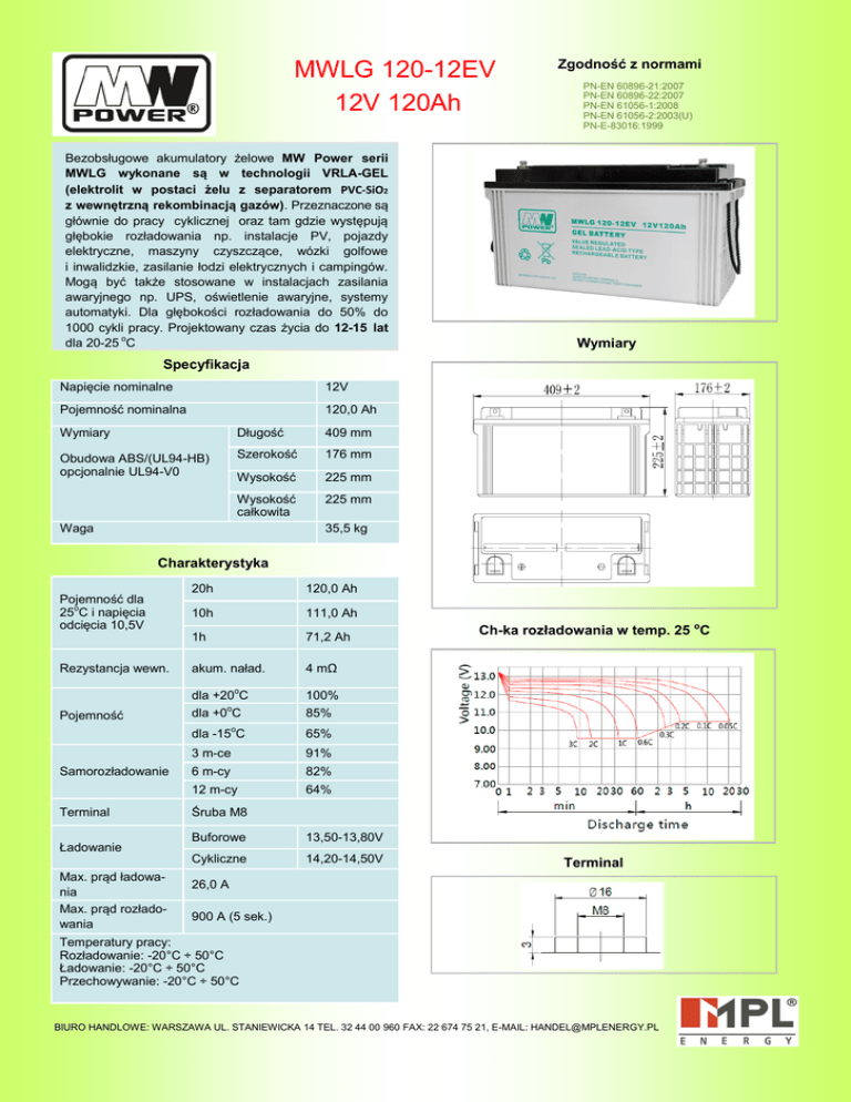 MWLG 120-12EV 12V 120Ah Bezobsługowe akumulatory żelowe MW Power serii MWLG wykonane są w technologii VRLA-GEL (elektrolit w postaci żelu z separatorem PVC-SiO2 z wewnętrzną rekombinacją gazów). Przeznaczone są głównie do pracy cyklicznej oraz tam gdzie występują głębokie rozładowania np. instalacje PV, pojazdy elektryczne, maszyny czyszczące, wózki golfowe i inwalidzkie, zasilanie łodzi elektrycznych i campingów. Mogą być także stosowane w instalacjach zasilania awaryjnego np. UPS, oświetlenie awaryjne, systemy automatyki. Dla głębokości rozładowania do 50% do 1000 cykli pracy. Projektowany czas życia do 12-15 lat dla 20-25 oC Zgodność z normami PN-EN 60896-21:2007 PN-EN 60896-22:2007 PN-EN 61056-1:2008 PN-EN 61056-2:2003(U) PN-E-83016:1999 Wymiary Specyfikacja Napięcie nominalne 12V Pojemność nominalna 120,0 Ah Wymiary Długość 409 mm Obudowa ABS/(UL94-HB) opcjonalnie UL94-V0 Szerokość 176 mm Wysokość 225 mm Wysokość całkowita 225 mm Waga 35,5 kg Charakterystyka Pojemność dla 25oC i napięcia odcięcia 10,5V Rezystancja wewn. Pojemność 20h 120,0 Ah 10h 111,0 Ah 1h 71,2 Ah akum. naład. 4 mΩ dla +20oC 100% dla +0oC 85% o Samorozładowanie Terminal Ładowanie Max. prąd ładowania Max. prąd rozładowania dla -15 C 65% 3 m-ce 91% 6 m-cy 82% 12 m-cy 64% Ch-ka rozładowania w temp. 25 oC Śruba M8 Buforowe 13,50-13,80V Cykliczne 14,20-14,50V Terminal 26,0 A 900 A (5 sek.) Temperatury pracy: Rozładowanie: -20°C ÷ 50°C Ładowanie: -20°C ÷ 50°C Przechowywanie: -20°C ÷ 50°C BIURO HANDLOWE: WARSZAWA UL. STANIEWICKA 14 TEL. 32 44 00 960 FAX: 22 674 75 21, E-MAIL: [email protected] Zależność ilości cykli do głębokości rozładowania Zależność lat życia od temperatury Charakterystyka napięcia ładowania względem temperatury Charakterystyka ładowania Stałoprądowa charakterystyka rozładowania (A, 25°C) Stałomocowa charakterystyka rozładowania (Watt, 25°C) BIURO HANDLOWE: WARSZAWA UL. STANIEWICKA 14 TEL. 32 44 00 960 FAX: 22 674 75 21, E-MAIL: [email protected]