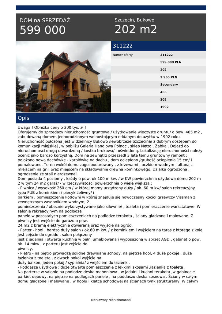 DOM na SPRZEDAŻ 599 000 Szczecin, Bukowo 202 m2 311222 Numer oferty 311222 599 000 PLN 202 2 965 PLN Secondary 465 202 1992 Opis Uwaga ! Obniżka ceny o 200 tys. zł ! Oferujemy do sprzedaży nieruchomość gruntową / użytkowanie wieczyste gruntu/ o pow. 465 m2 , zabudowaną domem jednorodzinnym wolnostojącym oddanym do użytku w 1992 roku. Nieruchomość położona jest w dzielnicy Bukowo /lewobrzeże Szczecina/ z dobrym dostępem do komunikacji miejskiej , w pobliżu Galeria Handlowa Północ , sklep Netto , Żabka . Dojazd do nieruchomości drogą utwardzoną / kostka brukowa/ i oświetloną. Lokalizację nieruchomości należy ocenić jako bardzo korzystną. Dom na zewnątrz przeszedł 3 lata temu gruntowny remont : położono nową dachówkę - karpiówkę na dachu , dom ocieplono /grubość ocieplenia 15 cm/ i pomalowano. Teren wokół domu zagospodarowany , z krzewami , oczkiem wodnym , altaną z miejscem na grill oraz miejscem na składowanie drewna kominkowego. Działka ogrodzona , ogrodzenie ze stali nierdzewnej. Dom posiada 4 poziomy , każdy o pow. ok 100 m kw. / w KW powierzchnia użytkowa domu 202 m 2 w tym 24 m2 garaż/ - w rzeczywistości powierzchnia o wiele większa : - Piwnica / wysokość 260 cm / w której mamy urządzony duży / ok. 60 m kw/ salon rekreacyjny typu PUB z kominkiem / piecyk żeliwny/ i barkiem , pomieszczenie kotłowni w której znajduje się nowoczesny kocioł grzewczy Vissman z zewnętrznym zasobnikiem wodnym, 2 pomieszczenia / obecnie wykorzystywane jako siłownie/ , toaleta i pomieszczenie warsztatowe. W salonie rekreacyjnym na podłodze panele w pozostałych pomieszczeniach na podłodze terakota , ściany gładzone i malowane. Z piwnicy jest wejście do garażu o pow. 24 m2 z bramą elektrycznie otwieraną oraz wyjście na ogród. - Parter - hool , bardzo duży salon / ok.60 m kw. / z kominkiem i wyjściem na taras z którego z kolei jest zejście do ogrodu , salon połączony jest z jadalnią i otwartą kuchnią w pełni umeblowaną i wyposażoną w sprzęt AGD , gabinet o pow. ok. 14 mkw , z parteru jest zejście do piwnicy, - Piętro - na piętro prowadzą solidne drewniane schody, na piętrze hool, 4 duże pokoje , duża łazienka z toaletą , z dwóch pokoi wyjście na duży balkon, jeden pokój / sypialnia/ z wejściem do łazienki, - Poddasze użytkowe : duże otwarte pomieszczenie z lekkimi skosami ,łazienka z toaletą . Na parterze w salonie na podłodze deska mahoniowa , w jadalni i kuchni terakota ,w gabinecie parkiet dębowy, na piętrze na podłogach panele , na poddaszu deska sosnowa . Ściany w całym domu gładzone i malowane , w hoolu i klatce schodowej na ścianach tynk strukturalny. W całym Markowscy Nieruchomości domu okna PCV , instalacja alarmowa , wideodomofon przy bramce wejściowej. Wszystkie okna na parterze wyposażone w żaluzje zewnętrzne sterowane elektrycznie , okna w piwnicy wyposażone w rolety zewnętrzne sterowane ręcznie. Dom idealny dla dużej rodziny, ewentualnie na prowadzenie działalności gospodarczej / dom opieki dziennej , przedszkole itp/. Polecamy i zapraszamy do osobistego zapoznania się z ofertą ! Właściciele są otwarci na konkretne propozycje !!! W rozliczeniu może być mieszkanie 2-3 pokojowe !!! MARKOWSCY NIERUCHOMOŚCI, rok zał. 1993 PROMOCJA: "Wycena nieruchomości do banku za 1 PLN" Kup nieruchomość z nami i skorzystaj z bezpłatnego doradztwa kredytowego, a wycenę nieruchomości do banku otrzymasz za 1 PLN. Regulamin promocji dostępny na stronie www.markowscy.pl Marcin Markowski tel. +48 790 333 444 email: [email protected] Markowscy Nieruchomości Powered by TCPDF (www.tcpdf.org)