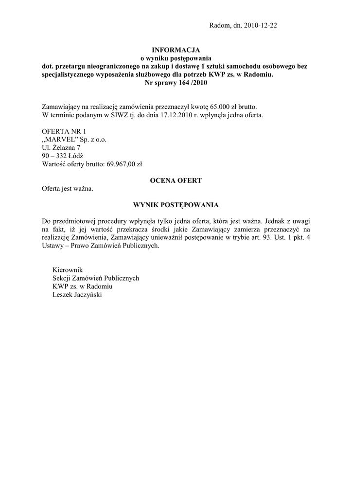 Radom, dn. 2010-12-22 INFORMACJA o wyniku postępowania dot. przetargu nieograniczonego na zakup i dostawę 1 sztuki samochodu osobowego bez specjalistycznego wyposaŜenia słuŜbowego dla potrzeb KWP zs. w Radomiu. Nr sprawy 164 /2010 Zamawiający na realizację zamówienia przeznaczył kwotę 65.000 zł brutto. W terminie podanym w SIWZ tj. do dnia 17.12.2010 r. wpłynęła jedna oferta. OFERTA NR 1 „MARVEL” Sp. z o.o. Ul. śelazna 7 90 – 332 Łódź Wartość oferty brutto: 69.967,00 zł OCENA OFERT Oferta jest waŜna. WYNIK POSTĘPOWANIA Do przedmiotowej procedury wpłynęła tylko jedna oferta, która jest waŜna. Jednak z uwagi na fakt, iŜ jej wartość przekracza środki jakie Zamawiający zamierza przeznaczyć na realizację Zamówienia, Zamawiający uniewaŜnił postępowanie w trybie art. 93. Ust. 1 pkt. 4 Ustawy – Prawo Zamówień Publicznych. Kierownik Sekcji Zamówień Publicznych KWP zs. w Radomiu Leszek Jaczyński