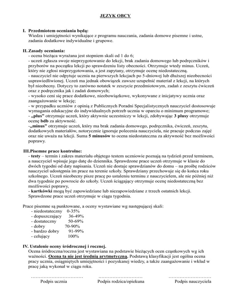 JĘZYK OBCY I. Przedmiotem oceniania będą: Wiedza i umiejętności wynikające z programu nauczania, zadania domowe pisemne i ustne, zadania dodatkowe indywidualne i grupowe. II. Zasady oceniania: - ocena bieżąca wyrażana jest stopniem skali od 1 do 6; - uczeń zgłasza swoje nieprzygotowanie do lekcji, brak zadania domowego lub podręczników i przyborów na początku lekcji po sprawdzeniu listy obecności. Otrzymuje wtedy minus. Uczeń, który nie zgłosi nieprzygotowania, a jest zapytany, otrzymuje ocenę niedostateczną. - nauczyciel nie odpytuje ucznia na pierwszych lekcjach po 5-dniowej lub dłuższej nieobecności usprawiedliwionej. Uczeń ma jednak obowiązek zawsze uzupełnić materiał z lekcji, na których był nieobecny. Dotyczy to zarówno notatek w zeszycie przedmiotowym, zadań z zeszytu ćwiczeń oraz z podręcznika jak i zadań domowych; - wysoko ceni się prace dodatkowe, nieobowiązkowe, wykonywane z inicjatywy ucznia oraz zaangażowanie w lekcję; - w przypadku uczniów z opinią z Publicznych Poradni Specjalistycznych nauczyciel dostosowuje wymagania edukacyjne do indywidualnych potrzeb ucznia w oparciu o minimum programowe; - „plus” otrzymuje uczeń, który aktywnie uczestniczy w lekcji, zdobywając 3 plusy otrzymuje ocenę bdb za aktywność. -„minus” otrzymuje uczeń, który ma brak zadania domowego, podręcznika, ćwiczeń, zeszytu, dodatkowych materiałów, notorycznie ignoruje polecenia nauczyciela, nie pracuje podczas zajęć oraz nie uważa na lekcji. Suma 5 minusów to ocena niedostateczna za aktywność bez możliwości poprawy. III.Pisemne prace kontrolne: - testy – termin i zakres materiału objętego testem uczniowie poznają na tydzień przed terminem, a nauczyciel wpisuje jego datę do dziennika. Sprawdzone prace uczeń otrzymuje w klasie do dwóch tygodni od daty napisania. Uczeń nie dostaje sprawdzianów do domu – na prośbę rodziców nauczyciel udostępnia im prace na terenie szkoły. Sprawdziany przechowuje się do końca roku szkolnego. Uczeń nieobecny pisze pracę po ustaleniu terminu z nauczycielem, ale nie później niż dwa tygodnie po powrocie do szkoły. Uczeń ściągający otrzymuje ocenę niedostateczną bez możliwości poprawy, - kartkówki mogą być zapowiedziane lub niezapowiedziane z trzech ostatnich lekcji. Sprawdzone prace uczeń otrzymuje w ciągu tygodnia. Prace pisemne są punktowane, a oceny wystawiane wg następującej skali: - niedostateczny 0-35% - dopuszczający 36-49% - dostateczny 50-69% - dobry 70-90% - bardzo dobry 91-99% - celujący 100% IV. Ustalenie oceny śródrocznej i rocznej. Ocena śródroczna/roczna jest wystawiana na podstawie bieżących ocen cząstkowych wg ich ważności. Ocena ta nie jest średnią arytmetyczną. Podstawą klasyfikacji jest ogólna ocena pracy ucznia, osiągniętych umiejętności i pozyskanej wiedzy, a także zaangażowanie i wkład w pracę jaką wykonał w ciągu roku. …………………………… Podpis ucznia .……………………… Podpis rodzica/opiekuna ……………………… Podpis nauczyciela