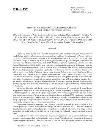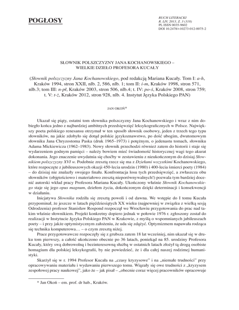 pogłosy RUCH LITERACKI R. LIV, 2013, Z. 3 (318) PL ISSN 0035-9602 DOI 10.2478/v10273-012-0075-2 SŁOWNIK POLSZCZYZNY JANA KOCHANOWSKIEGO – WIELKIE DZIEŁO PROFESORA KUCAŁY (Słownik polszczyzny Jana Kochanowskiego, pod redakcją Mariana Kucały. Tom I: a-h, Kraków 1994, stron XXII, nlb. 2, 586, nlb. 1; tom II: i-m, Kraków 1998, stron 571, nlb.3; tom III: n-pł, Kraków 2003, stron 506, nlb.4; t. IV: po-ś, Kraków 2008, stron 759; t. V: t-ż, Kraków 2012, stron 928, nlb. 4. Instytut Języka Polskiego PAN) JAN OKOŃ* Ukazał się piąty, ostatni tom słownika polszczyzny Jana Kochanowskiego i wraz z nim dobiegło końca jedno z najbardziej ambitnych przedsięwzięć leksykograficznych w Polsce. Największy poeta polskiego renesansu otrzymał w ten sposób słownik osobowy, jeden z trzech tego typu słowników, na jakie zdobyło się dotąd polskie językoznawstwo, po dość ubogim, dwutomowym słowniku Jana Chryzostoma Paska (druk 1965–1973) i potężnym, o jedenastu tomach, słowniku Adama Mickiewicza (1962–1983). Nowy słownik przechodzi również zatem do historii i staje się wydarzeniem godnym pamięci – należy bowiem mieć świadomość historycznej wagi tego akurat dokonania. Jego znaczenie uwydatnia się choćby w zestawieniu z nieukończonym do dzisiaj Słownikiem polszczyzny XVI w. Podobnie zresztą rzecz się ma z Dziełami wszystkimi Kochanowskiego, które rozpoczęte z jubileuszowych okazji 450-lecia urodzin (1980) i 400-lecia śmierci poety (1984) – do dzisiaj nie znalazły swojego finału. Konfrontacja losu tych przedsięwzięć, a zwłaszcza obu słowników (objętościowo i materiałowo zresztą nieporównywalnych!) pozwala tym bardziej docenić autorski wkład pracy Profesora Mariana Kucały. Ukończony właśnie Słownik Kochanowskiego staje się jego opus magnum, dziełem życia, dokończonym dzięki determinacji i konsekwencji w działaniu. Inicjatywa Słownika rodziła się zresztą powoli i od dawna. We wstępie do I tomu Kucała przypominał, że jeszcze w latach pięćdziesiątych XX wieku (najpewniej w związku z wielką sesją Odrodzenia) profesor Stanisław Rospond rozpoczął we Wrocławiu przygotowania do prac nad takim właśnie słownikiem. Projekt konkretny dopiero jednak w połowie 1976 r. zgłoszony został do realizacji w Instytucie Języka Polskiego PAN w Krakowie, z myślą o wspomnianych jubileuszach poety – i przy jakże optymistycznym założeniu, że uda się zdążyć. Optymizmem napawała rodząca się technika komputerowa… – o czym zresztą niżej. Prace przygotowawcze rozpoczęły się z grubsza zatem 18 lat wcześniej, nim ukazał się w druku tom pierwszy, a całość ukończono obecnie po 36 latach, poniekąd na 85. urodziny Profesora Kucały, który swą dobrowolną i bezinteresowną służbą w ostatnich latach złożył tą drogą osobiste homagium dla polskiej leksykografii, by nie powiedzieć, że i dla całej naszej rodzimej humanistyki. Skarżył się w r. 1994 Profesor Kucała na „czasy kryzysowe” i na „niemałe trudności” przy opracowywaniu materiału i wydawaniu pierwszego tomu. Wiązały się owe trudności z „kryzysem zespołowej pracy naukowej”, jako że – jak pisał – „obecnie coraz więcej pracowników opracowuje * Jan Okoń – em. prof. dr hab., Kraków. 366 Pogłosy wyłącznie tematy indywidualne”. W rezultacie przy pierwszym tomie Słownika członkowie zespołu pracowali przeważnie dorywczo, a na stałe – obok samego Kucały – „tylko jedna osoba”. Dzisiaj czasy się zmieniły i w ostatnim tomie cały nawet zespół redakcyjny Słownika z Instytutu Języka Polskiego PAN w Krakowie ujawnił się na stronie tytułowej i w pełnym składzie (w liczbie siedmiu osób) stanął obok zasłużonego Profesora-emeryta. W osobnym opracowaniu, przygotowanym przez część zespołu, znalazła się też wiadomość o dokończeniu prac. Autorki podkreślają, że Profesor „sprawował pieczę nad całością tego przedsięwzięcia”, i to „od początku aż do jego ukończenia”. I piszą dalej: „Był autorem koncepcji słownika i wnikliwym, wymagającym czytelnikiem k a ż d e g o hasła opracowanego przez członków zespołu – od etapu jego redagowania aż do ostatniej korekty”. Ile tego jest? – można spytać – jak dużo słownikowego materiału? Nawet z podanego tu na początku opisu bibliograficznego można łatwo wyliczyć, że w pięciu tomach zebrano materiał hasłowy na 3385 stronach (wliczając przy paginacji również antefolia, jak to ma miejsce konsekwentnie w Słowniku). Haseł (a zarazem artykułów hasłowych) jest natomiast 8807 (sam Kucała obliczał na początku o 500 mniej). Wyłowiono je spośród około 128 tysięcy słów, jakie spisał Kochanowski po polsku. Bo Słownik, o czym należy przypomnieć, obejmuje tylko dzieła poety w języku ojczystym – bez spuścizny pisanej po łacinie (tu księgi: Lyricorum, Elegiarum oraz Epigrammatum, czyli Foricoenia, drukowane w zbiorach w l. 1580–1584). Porównawczo: u Paska znalazło się 7786 haseł, natomiast u Mickiewicza jest ich aż 24 tysiące – w nieporównywalnie obszerniejszym jednak dorobku romantycznego wieszcza (po 16 tomów, analogicznie, w wydaniach: sejmowym, narodowym i rocznicowym, i w rezultacie 11 tomów słownika). Utwory polskie Kochanowskiego mieszczą się natomiast ledwie na 707 stronach formatu A5. Słusznie wskazują na to autorki-współpracownice Profesora i wyciągają trafny wniosek, że Kochanowski „posługiwał się bogatym słownictwem”. Spostrzeżenie to ogólne, a porównania bardziej konkretne mogłyby przynieść interesujące wnioski nie tylko o sile i źródłach językowego wyrazu poezji czarnoleskiej, ale i o systemowym rozwoju polszczyzny od XVI do XIX w. Koniecznie przy tym należałoby uwzględnić etap pośredni, przystając przy pamiętnikarzu Pasku, którego mowa codzienna, rdzennie polska, choć silnie makaronizowana (o czym, podziwiając ją, nie wied