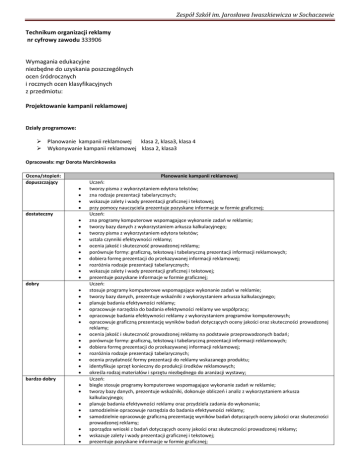 Zespół Szkół im Jarosława Iwaszkiewicza w Sochaczewie Technikum organizacji reklamy nr cyfrowy zawodu 333906 Wymagania edukacyjne n o i rocznych ocen klasyfikacyjnych z przedmiotu: Projektowanie kampanii reklamowej D programowe: Planowanie kampanii reklamowej klasa 2, klasa3, klasa 4 Wykonywanie kampanii reklamowej klasa 2, klasa3 O O D M : Planowanie kampanii reklamowej dostateczny dobry bardzo dobry U zna rodzaje prezentacji tabelarycznych; wskazuje zalety i wady prezentacji graficznej i tekstowej; przy pomocy nauczyciela prezentuje pozyskane informacje w formie graficznej; U reklamie; tworzy bazy danych z wykorzystaniem arkusza kalkulacyjnego; prezentacji informacji reklamowych; ; dobiera rodzaje prezentacji tabelarycznych; wskazuje zalety i wady prezentacji graficznej i tekstowej; prezentuje pozyskane informacje w formie graficznej; U stosuje tworzy bazy danych, prezentuje ; ; opracowuje opracowuje opracowuje reklamy; ocenia ; ; ; dobiera ; rodzaje prezentacji tabelarycznych; ocenia identyfikuje ; ; ; Ucz biegle stosuje kalkulacyjnego; planuje badania efekt samodzielnie opracowuje samodzielnie opracowuje prowadzonej reklamy; ; zadania do wykonania; ; wskazuje zalety i wady prezentacji graficznej i tekstowej; prezentuje pozyskane informacje w formie graficznej; Zespół Szkół im Jarosława Iwaszkiewicza w Sochaczewie ocenia ustala ne do pr s reklamowych; U biegle wykorzystuje sprawnie kalkulacyjnego; samodzielnie planuje badania efekty ; ; zadania do wykonania; ; samodzielnie s ; O : Wykonywanie kampanii reklamowej dostateczny U odpowiednie programy komputerowe do gromadzenia i przetwarzania informacji; wykorzystuje ; przy pomocy nauczyciela tworzy ; zna elementy systemu identyfikacji wizualnej; przy pomocy nauczyciela opracuje przy pomocy nauczyciela wykonuje U odpowiednie programy komputerowe do gromadzenia i przetwarzania informacji; program komputerowy stosowany do opracowania przekazu reklamowego; wykorzystuje ; dobiera wykonania reklamy; identyfikuje ; wykonuje formy reklamy telewizyjnej, prasowej i radiowej; elementy systemu identyfikacji wizualnej; przy pomocy nauczyciela projektuje elementy systemu identyfikacji wizualnej; symbol firmy, symbole dekoracyjne, tablice i tabliczki informacyjne, szyldy reklamowe; opracowuje wykonuje r U odpowiednie programy komputerowe do gromadzenia i przetwarzania informacji; wykorzystuje ; tworzy ; projektuje i wykonuje ; ; dobiera ; dokonuje dokonuje POS point of sale); wykonuje dobiera charakteryzuje wizerunek firmy; elementy systemu identyfikacji wizualnej; projektuje symbol firmy (znak i logotyp firmowy), kolory firmowe, symbole dekoracyjne, typografie dobry - bardzo dobry ia. Projektuje i wykonuje opracowuje wykonuje U odpowiednie programy komputerowe do gromadzenia i przetwarzania informacji; program komputerowy stosowany do opracowania przekazu reklamowego; Zespół Szkół im Jarosława Iwaszkiewicza w Sochaczewie dobiera dokonuje ustala dokonuje wykonuje znych; samodzielnie dobiera ; wym; POS point of sale); I wyszukiwarkach internetowych, reklama kontekstowa w wyszukiwarkach, reklama kontekstowa na stronach tematycznych); projektuje i wykonuje elementy systemu identyfikacji wizualnej: symbol firmy (znak i logotyp firmowy), kolory firmowe, symbole dekoracyjne, typografie dekoracyjne, druki firmowe (papier, koperty, dokumenty i - opakowania. samodzielnie opracowuje samodzielnie wykonuje U prezent tworzy wykonuje nowatorskie trafnie dobiera I wyszukiwarkach internetowych, reklama kontekstowa w wyszukiwarkach, reklama kontekstowa na stronach tematycznych); projektuje i wykonuje oryginalne elementy systemu identyfikacji wizualnej: symbol firmy (znak i logotyp firmowy), kolory firmowe, symbole dekoracyjne, typografie dekoracyjne, druki firmowe (papier, koperty, dokumenty i i zenia, tablice i tabliczki informacyjne, szyldy reklamowe, opakowania. Dodatkowe warunki: O U PPP