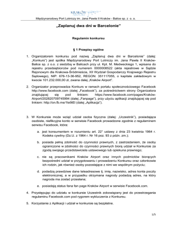 Międzynarodowy Port Lotniczy im. Jana Pawła II Kraków - Balice sp. z o. o. „Zaplanuj dwa dni w Barcelonie” Regulamin konkursu § 1 Przepisy ogólne 1. Organizatorem konkursu pod nazwą „Zaplanuj dwa dni w Barcelonie” (dalej: „Konkurs”) jest spółka Międzynarodowy Port Lotniczy im. Jana Pawła II KrakówBalice sp. z o.o. z siedzibą w Balicach przy ul. Kpt. M. Medweckiego 1, wpisana do rejestru przedsiębiorców pod numerem 0000008522 (akta rejestrowe w Sądzie Rejonowym dla Krakowa-Śródmieścia, XII Wydział Gospodarczy Krajowego Rejestru Sądowego), NIP: 676-13-36-952, REGON: 351117055, o kapitale zakładowym w kwocie 101.232.000,00 zł, zwana dalej „Kraków Airport”. 2. Organizator przeprowadza Konkurs w ramach portalu społecznościowego Facebook http://www.facebook.com (dalej „Facebook”), za pośrednictwem strony Organizatora znajdującej się pod linkiem: https://www.facebook.com/pages/KrakówAirport/202820709745994 (dalej „Fanpage”), przy użyciu aplikacji znajdującej się pod linkiem: http://on.fb.me/1le9iEl (dalej „Aplikacja”). 3. W Konkursie może wziąć udział osoba fizyczna (dalej: „Uczestnik”), posiadająca osobiste, niefikcyjne konto w serwisie Facebook prowadzone zgodnie z regulaminem serwisu Facebook, która: a. jest konsumentem w rozumieniu art. 221 ustawy z dnia 23 kwietnia 1964 r. Kodeks cywilny (Dz.U. z 1964 r. Nr 16 poz. 93 z późn. zm.); b. posiada pełną zdolność do czynności prawnych, z zastrzeżeniem, że osoby ograniczone w zdolności do czynności prawnych biorą udział w Konkursie za zgodą swojego przedstawiciela ustawowego lub opiekuna prawnego; c. nie są pracownikami Kraków Airport oraz innych podmiotów biorących bezpośredni udział w przygotowaniu i prowadzeniu Konkursu oraz członkowie ich rodzin, jak również osoby pozostające z nimi we wspólnym pożyciu; d. podadzą prawdziwe dane teleadresowe tj. imię, nazwisko, adres konta poczty elektronicznej, a w przypadku otrzymana nagrody podadzą adres, na który nagroda ma zostać przesłana; e. posiadają status fana fan page Kraków Airport w serwisie Facebook.com. 4. Przystępując do udziału w konkursie Uczestnik zobowiązany jest do przestrzegania regulaminu Facebook.com pod rygorem wykluczenia z Konkursu. 5. Korzystanie z Aplikacji i udział w konkursie są bezpłatne. 1/5 Międzynarodowy Port Lotniczy im. Jana Pawła II Kraków - Balice sp. z o. o. § 2 Przepisy dotyczące odpowiedzi 1. Zadaniem uczestników Konkursu jest opracowanie spędzenia dwóch dni w Barcelonie w Hiszpanii. propozycji kreatywnego 2. Każdy z uczestników może nadesłać jedną pracę zawierającą odpowiedź na zadanie z ust. 1. Treść odpowiedzi powinna zawierać maksymalnie 400 słów lub jedno zdjęcie lub grafikę w formacie .jpg lub .png. 3. Odpowiedzi w plikach, których rozmiar nie przekraczaj 2MB należy przesyłać pocztą elektroniczną na adres: [email protected]. 4. W treści maila należy podać: treść odpowiedzi na zadanie konkursowe oraz link do profilu uczestnika w serwisie Facebook.com. § 3 Zasady udziału w Konkursie 1. Uczestnicy mają prawo zgłaszać do Konkursu tylko i wyłącznie odpowiedzi (materiały tekstowe i graficzne) do których Uczestnicy posiadają wszelkie prawa autorskie. Zgłaszanie odpowiedzi wymyślonych, wykonanych lub przygotowanych przez inne osoby jest całkowicie zabronione. W przypadku przysłania materiałów graficznych Uczestnicy zobowiązani są do uzyskania zgody osób, które zostały utrwalone na zdjęciu, do wykorzystania ich wizerunku oraz do zaspokojenia wszelkich ewentualnych roszczeń z tym związanych. Uczestnicy Konkursu ponoszą pełną odpowiedzialność związaną z użyciem przesłanych przez siebie odpowiedzi, a w szczególności pełną odpowiedzialność za naruszenie praw osób trzecich. W przypadku wystąpienia przeciwko Kraków Airport przez osobę trzecią z roszczeniami wynikającymi z naruszenia jej praw, Uczestnik zobowiązany jest do ich zaspokojenia we własnym zakresie i zwolnienia Kraków Airport z wszelkich roszczeń. 2. W przypadku naruszenia przez uczestnika obowiązującego prawa, praw osób trzecich, a także prób oszustwa, Kraków Airport zastrzega sobie prawo do usunięcia odpowiedzi z postępowania konkursowego. Działania Kraków Airport nie wymagają dla swej ważności przesłania do Uczestnika jakiegokolwiek oświadczenia. Odpowiedzi zawierające treści obraźliwe, nawołujące do przemocy, odwołujące się do jakiejkolwiek dyskryminacji, itp. nie będą dopuszczone do udziału w Konkursie. 3. Przesłanie odpowiedzi na zadanie pytanie i wzięcie udziału w Konkursie oznacza akceptację postanowień niniejszego Regulaminu i udzielenie Kraków Airport, na czas nieoznaczony, niewyłącznej i nieodpłatnej licencji bez ograniczenia terytorium i ilości wykorzystania z odpowiedzi zgłoszonej do Konkursu na następujących polach eksploatacji: a. w zakresie rozpowszechniania – poprzez publiczne udostępnienie odpowiedzi w taki sposób, aby każdy mógł mieć do niej dostęp w miejscu i w czasie przez siebie wybranym, w tym publikację w Internecie, na stronie internetowej www.krakowairport.pl, profilu Kraków Airport w serwisie Facebook.com www.facebook.com/krakowairport; b. w zakresie utrwalania i zwielokrotniania – poprzez wytwarzanie egzemplarzy odpowiedzi lub jej części, przy użyciu wszelkich dostępnych technik, w tym 2/5 Międzynarodowy Port Lotniczy im. Jana Pawła II Kraków - Balice sp. z o. o. drukarskiej, reprograficznej, zapisu magnetycznego oraz techniką cyfrową, w tym publikację na wszelkich materiałach graficznych wydawanych przez Kraków Airport. c. w zakresie obrotu oryginałem albo egzemplarzami, na których utwór utrwalono – poprzez wprowadzanie do obrotu, użyczenie lub najem oryginału albo egzemplarzy 4. Kraków Airport zastrzega sobie prawo do wyłączenia z udziału odpowiedzi, które naruszają Regulamin Konkursu. § 4 Ochrona danych osobowych 1. U