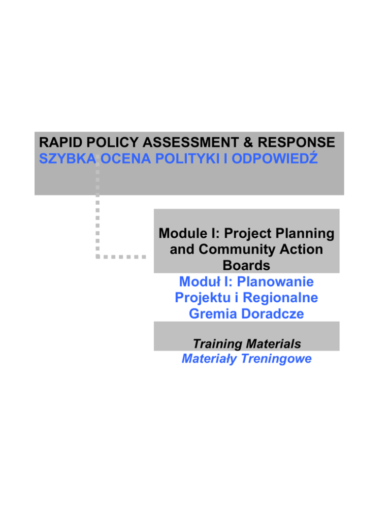RAPID POLICY ASSESSMENT & RESPONSE SZYBKA OCENA POLITYKI I ODPOWIEDŹ Module I: Project Planning and Community Action Boards Moduł I: Planowanie Projektu i Regionalne Gremia Doradcze Training Materials Materiały Treningowe The Goals of Rapid Policy Assessment and Response (RPAR) Cele Szybkiej Oceny Polityki i Odpowiedzi (RPAR) RPAR mobilizes local knowledge and capacity to fight HIV/AIDS among injection drug users (IDUs) in the site area. Some IDUs may be sex workers or gay men or members of other socially marginalized populations, and so sometimes policies relating to these groups will be included. The goal of RPAR is to identify ways in which policies and policy implementation increases or can reduce the risk of disease among IDUs, and to catalyze community action to bring about healthful change. RPAR mobilizuje lokalną wiedzę i możliwości do walki z HIV/AIDS pośród konsumentów dożylnych narkotyków (IDU) na terenie ośrodka. Niektórzy IDU mogą się prostytuować, być gejami lub członkami innych społecznie marginalizowanych grup, a zatem czasami wytyczne w odniesieniu do tych grup będą załączone. Celem RPAR-u jest określenie dróg jakimi wytyczne i wprowadzanie polityki w życie zwiększa lub może zmniejszyć ryzyko zakażenia pośród IDU, oraz katalizować działania społeczne mające przynieść zdrowe zmiany. Module I - Community Action Boards – Training Materials – Page 2 December 31, 2004 Project Flowchart Harmonogram Projektu When What Module Kiedy Co Moduł Before RPAR project begins Initial Consultation I Konsultacja początkowa I Zanim rozpocznie się projekt RPAR Week 0 (first day of training) PI Meeting I-V Spotkanie PI I-V Tydzień 0 (pierwszy dzień szkolenia) Local Team Training Week 1 Begin existing data collection modules II Tydzień 1 Rozpocznijcie moduły gromadzenia istniejących danych II Recruit CAB I Przeprowadźcie rekrutację CAB-u I Weeks 1 – 12 First CAB meeting I Tygodnie 1-12 Pierwsze spotkanie CAB-u (9 marca) I Collect existing data Gromadźcie istniejące dane (równolegle do spotkań CABu) II Prepare team for qualitative data collection III Przygotujcie zespół do gromadzenia danych jakościowych III Szkolenie Lokalnego Zespołu II Second CAB meeting I Drugie spotkanie CAB-u I Week 13 End existing data collection II Tydzień 13 Zakończcie gromadzenie istniejących danych II Week 14 Begin qualitative data collection III Tydzień 14 Rozpocznijcie gromadzenie danych jakościowych III Module I - Community Action Boards – Training Materials – Page 3 December 31, 2004 When What Module Kiedy Co Moduł Week 15-21 Conduct focus groups III Tygodnie 15-21 Poprowadźcie grupy robocze III Third CAB meeting Trzecie spotkanie CAB-u I I Conduct key informant interviews III Przeprowadźcie wywiady z kluczowymi informatorami III Weeks 23-26 Begin Analysis and Action Plan IV Tygodnie 23-26 Rozpocznijcie Analizę i Plan Działania IV Fourth CAB meeting I,IV Czwarte spotkanie CAB-u I,IV Week 25 Complete qualitative data collection III Tydzień 25 Zakończcie gromadzenie jakościowych danych III Week 27 CAB meeting 5 (Workshop) I, IV Tydzień 27 Piąte spotkanie CAB-u (Warsztaty) I, IV Continue drafting report Kontynuujcie szkicowanie raportu Week 29 CAB meeting 6 (Workshop) I, IV Tydzień 29 Szóste spotkanie CAB-u (Warsztaty) I, IV Week 32 CAB meeting 7 IV Tydzień 32 Siódme spotkanie CAB-u IV Week 36 End RPAR Tydzień 36 Koniec RPAR Module I - Community Action Boards – Training Materials – Page 4 December 31, 2004 Project Planning Planowanie Projektu The success of local rapid assessments can be defined by the extent to which they provide information of practical relevance for local interventions. It is necessary to conduct an Initial Consultation to make some initial judgments about the focus and parameters of the assessment. Sukces lokalnych szybkich ocen może być określony przez szerokość wachlarza informacji o praktycznym znaczeniu dla lokalnych interwencji, które one dostarczają. Konieczne jest przeprowadzenie Konsultacji Początkowej, aby wytworzyć wspólne wstępne zdanie o głównych celach i parametrach oceny. The Initial Consultation is a brief consultation which takes place prior to the rapid assessment. It provides an immediate overview of the local situation based on existing experts’ knowledge and experience in order to make initial judgments about how to plan the rapid assessment. The Initial Consultation will also assist sites in developing proposals for local rapid assessments using the methodology described in this guide. Początkowa Konsultacja jest zwięzłą konsultacją, która ma miejsce przed szybką oceną. Daje ona natychmiastowy ogląd na lokalną sytuację, bazujący na wiedzy i doświadczeniu istniejących ekspertów, a mający na celu wyrobienie początkowego zdania o tym jak zaplanować szybką ocenę. Początkowa Konsultacja będzie również pomagać placówkom w opracowaniu propozycji dla kokalnych szybkich ocen używając metodologii opisanej w tej instrukcji. Purpose Cel The purpose of preliminary planning is to determine whether the site city is suitable for a Rapid Policy Assessment and Response (RPAR) project, to acquaint the project leaders with the general situation in the site city, and to prepare for the development of funding proposals and research protocol for a local rapid assessment. Celem wstępnego planowania jest określenie czy miasto placówki jest odpowiednie dla projektu Szybkiej Oceny Polityki i Odpowiedzi (RPAR), zapoznanie kierowników projektu z ogólną sytuacją w mieście, oraz przygotowanie do opracowania propozycji finansowania i protokołu badawczego dla lokalnej szybkiej oceny. Guiding Principles of the Consultation Kierujące Pryncypia Konsultacji There are five principles which guide the Initial Consultation. These help to ensure that the Initial Consultation leads to rapid assessments that maintain their ‘investigative’ nature as well as their practical 