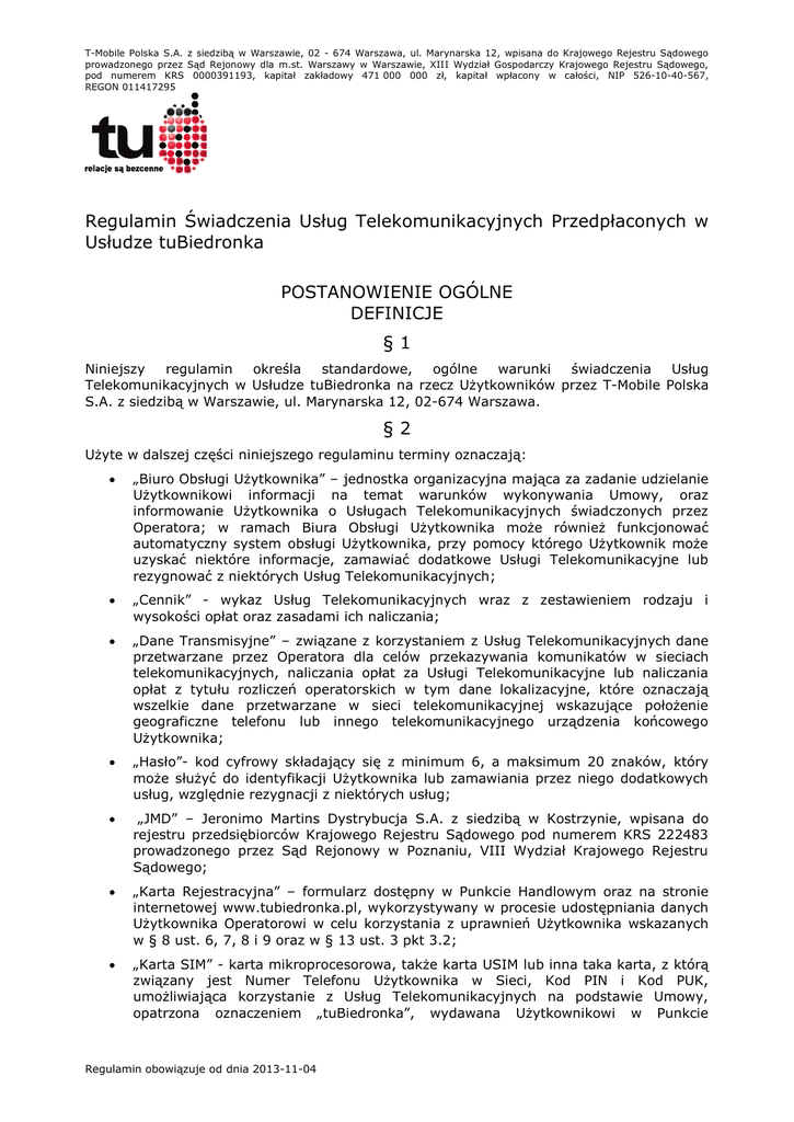 T-Mobile Polska S.A. z siedzibą w Warszawie, 02 - 674 Warszawa, ul. Marynarska 12, wpisana do Krajowego Rejestru Sądowego prowadzonego przez Sąd Rejonowy dla m.st. Warszawy w Warszawie, XIII Wydział Gospodarczy Krajowego Rejestru Sądowego, pod numerem KRS 0000391193, kapitał zakładowy 471 000 000 zł, kapitał wpłacony w całości, NIP 526-10-40-567, REGON 011417295 Regulamin Świadczenia Usług Telekomunikacyjnych Przedpłaconych w Usłudze tuBiedronka POSTANOWIENIE OGÓLNE DEFINICJE §1 Niniejszy regulamin określa standardowe, ogólne warunki świadczenia Usług Telekomunikacyjnych w Usłudze tuBiedronka na rzecz Użytkowników przez T-Mobile Polska S.A. z siedzibą w Warszawie, ul. Marynarska 12, 02-674 Warszawa. §2 Użyte w dalszej części niniejszego regulaminu terminy oznaczają: „Biuro Obsługi Użytkownika” – jednostka organizacyjna mająca za zadanie udzielanie Użytkownikowi informacji na temat warunków wykonywania Umowy, oraz informowanie Użytkownika o Usługach Telekomunikacyjnych świadczonych przez Operatora; w ramach Biura Obsługi Użytkownika może również funkcjonować automatyczny system obsługi Użytkownika, przy pomocy którego Użytkownik może uzyskać niektóre informacje, zamawiać dodatkowe Usługi Telekomunikacyjne lub rezygnować z niektórych Usług Telekomunikacyjnych; „Cennik” - wykaz Usług Telekomunikacyjnych wraz z zestawieniem rodzaju i wysokości opłat oraz zasadami ich naliczania; „Dane Transmisyjne” – związane z korzystaniem z Usług Telekomunikacyjnych dane przetwarzane przez Operatora dla celów przekazywania komunikatów w sieciach telekomunikacyjnych, naliczania opłat za Usługi Telekomunikacyjne lub naliczania opłat z tytułu rozliczeń operatorskich w tym dane lokalizacyjne, które oznaczają wszelkie dane przetwarzane w sieci telekomunikacyjnej wskazujące położenie geograficzne telefonu lub innego telekomunikacyjnego urządzenia końcowego Użytkownika; „Hasło”- kod cyfrowy składający się z minimum 6, a maksimum 20 znaków, który może służyć do identyfikacji Użytkownika lub zamawiania przez niego dodatkowych usług, względnie rezygnacji z niektórych usług; „JMD” – Jeronimo Martins Dystrybucja S.A. z siedzibą w Kostrzynie, wpisana do rejestru przedsiębiorców Krajowego Rejestru Sądowego pod numerem KRS 222483 prowadzonego przez Sąd Rejonowy w Poznaniu, VIII Wydział Krajowego Rejestru Sądowego; „Karta Rejestracyjna” – formularz dostępny w Punkcie Handlowym oraz na stronie internetowej www.tubiedronka.pl, wykorzystywany w procesie udostępniania danych Użytkownika Operatorowi w celu korzystania z uprawnień Użytkownika wskazanych w § 8 ust. 6, 7, 8 i 9 oraz w § 13 ust. 3 pkt 3.2; „Karta SIM” - karta mikroprocesorowa, także karta USIM lub inna taka karta, z którą związany jest Numer Telefonu Użytkownika w Sieci, Kod PIN i Kod PUK, umożliwiająca korzystanie z Usług Telekomunikacyjnych na podstawie Umowy, opatrzona oznaczeniem „tuBiedronka”, wydawana Użytkownikowi w Punkcie Regulamin obowiązuje od dnia 2013-11-04 Handlowym będąca własnością Operatora do chwili rozwiązania lub wygaśnięcia Umowy „Kod PIN” - związany z Kartą SIM kod cyfrowy, ustawiony fabrycznie lub zdefiniowany przez Użytkownika, umożliwiający dostęp do Usług Telekomunikacyjnych poprzez Kartę SIM; „Kod PUK” - związany z Kartą SIM kod cyfrowy znoszący blokadę Kodu PIN, zapewniający Użytkownikowi możliwość identyfikowania przy dostępie do Usług Telekomunikacyjnych poprzez Kartę SIM; „Konsument” - osoba fizyczna będąca stroną Umowy lub wnioskująca o jej zawarcie, w celach niezwiązanych bezpośrednio z jej działalnością gospodarczą lub zawodową; „Numer Telefonu” – numer telefonu Użytkownika, identyfikujący Kartę SIM w Sieci, który może służyć do identyfikacji Użytkownika w serwisach umożliwiających zmiany w usługach i dostęp do informacji o koncie przypisanym w systemach informatycznych Operatora do Karty SIM; „Operator” – T-Mobile Polska S.A.; „Osoba” - osoba fizyczna bądź osoba prawna lub inna jednostka organizacyjna posiadająca zdolność do zawierania umów; „Punkt Obsługi” – autoryzowana przez Operatora placówka zajmująca się obsługą Użytkowników, której adres wskazany jest na stronie internetowej www.tubiedronka.pl; „Punkt Handlowy” – jednostka zarządzana przez JMD lub inne podmioty na podstawie umowy z JMD i opatrzona oznaczeniem „Biedronka”, wydająca Karty SIM oraz umożliwiająca uiszczenie przez Użytkownika opłat z tytułu korzystania z Usług Telekomunikacyjnych; „Regulamin” – zbiór dokumentów składających się na regulamin świadczenia Usług Telekomunikacyjnych; na Regulamin składa się zawsze RŚUT, a w przypadku związania się nimi, także Warunki Oferty Promocyjnej lub Regulamin Usługi Dodatkowej lub inne dokumenty, w treści których wyraźnie zaznaczono, że są treścią Regulaminu; Regulamin Usługi Dodatkowej - ustalone przez Operatora szczegółowe warunki korzystania z Usługi Telekomunikacyjnej, której specyfika wymaga odrębnego uregulowania; Regulaminy Usług Dodatkowych dostępne są w Biurze Obsługi Użytkownika, Punktach Sprzedaży oraz na stronie internetowej www.tubiedronka.pl.; „RŚUT” – niniejszy regulamin; „Sieć” lub „Sieć Operatora” – publiczna sieć telekomunikacyjna Operatora służąca do świadczenia Usług Telekomunikacyjnych; „Umowa” – umowa o świadczenie usług telekomunikacyjnych, na podstawie której Operator świadczy na rzecz Użytkownika Usługi Telekomunikacyjne, a Użytkownik zobowiązuje się do zapłaty na rzecz Operatora opłat z tego tytułu oraz do przestrzegania wszelkich postanowień Umowy; na Umowę składa się RŚUT, Cennik, a w przypadku związania się nimi także Warunki Oferty Promocyjnej lub Regulamin Usługi Dodatkowej; „Usługa tuBiedronka” - system, w którym Usługi Telekomu