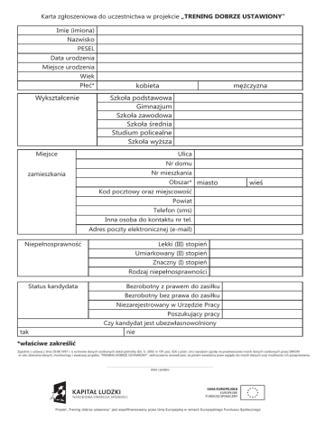 Karta zgłoszeniowa do uczestnictwa w projekcie „TRENING DOBRZE USTAWIONY” Imię (imiona) Nazwisko PESEL Data urodzenia Miejsce urodzenia Wiek Płeć* Wykształcenie Miejsce kobieta mężczyzna Szkoła podstawowa Gimnazjum Szkoła zawodowa Szkoła średnia Studium policealne Szkoła wyższa Ulica Nr domu zamieszkania Nr mieszkania Obszar* miasto Kod pocztowy oraz miejscowość wieś Powiat Telefon (sms) Inna osoba do kontaktu nr tel. Adres poczty elektronicznej (e-mail) Niepełnosprawność Lekki (III) stopień Umiarkowany (II) stopień Znaczny (I) stopień Rodzaj niepełnosprawności Status kandydata Bezrobotny z prawem do zasiłku Bezrobotny bez prawa do zasiłku Niezarejestrowany w Urzędzie Pracy Poszukujący pracy Czy kandydat jest ubezwłasnowolniony nie tak *właściwe zakreślić Zgodnie z ustawą z dnia 29.08.1997 r. o ochronie danych osobowych (tekst jednolity (Dz. U. 2002 nr 101 poz. 926 z późn. zm.) wyrażam zgodę na przetwarzanie moich danych osobowych przez ERKON w celu zbierania danych, monitoringu i ewaluacji projektu “TRENING DOBRZE USTAWIONY”. Jednocześnie oświadczam, że jestem świadomy praw wglądu do moich danych oraz możliwości ich przeprawiania. ……………………………………………………………………………………………………………………… data i podpis Projekt „Trening dobrze ustawiony” jest współfinansowany przez Unię Europejską w ramach Europejskiego Funduszu Społecznego