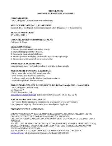 REGULAMIN KONKURSU PIOSENKI WŁOSKIEJ ORGANIZATOR: I LO Collegium Gostomianum w Sandomierzu MIEJSCE ORGANIZACJI KONKURSU: budynek I LO Collegium Gostomianum przy ulicy Długosza 7 w Sandomierzu TERMIN KONKURSU: 27 MAJA 2015 r. ORGANIZATORZY ODPOWIEDZIALNI: Calogero Scilanga CELE KONKURSU: 1. Promocja działalności kulturalnej szkoły. 2. Popularyzacja piosenki włoskiej. 3. Integracja środowiska lokalnego. 4. Promocja sztuki wokalnej jako środka wyrazu artystycznego. 5. Promocja wyróżniających się wykonawców. WARUNKI UCZESTNICTWA: Uczestnikami może być maksymalnie 3 uczniów z danej szkoły ZGŁOSZENIE POWINNO ZAWIERAĆ: - imię i nazwisko solisty lub nazwę zespołu, - tytuł utworu oraz nazwiska autorów, - telefon, e-mail uczestnika lub instytucji patronującej, - nazwisko opiekuna lub instruktora. ZGŁOSZENIA NALEŻY DOSTARCZYĆ DO DNIA 15 maja 2015 r. NA ADRES: I LO Collegium Gostomianum ul. Długosza 7 27-600 Sandomierz, lub [email protected] (adres internetowy szkoły) tel. 15 832 52 45 KRYTERIA OCENY I NAGRODY: - jury oceni dobór repertuaru, interpretację oraz ogólny wyraz artystyczny, - jury przyzna nagrody ufundowane przez szkołę oraz dyplomy. POSTANOWIENIA KOŃCOWE: SPRAWY NIEUJĘTE W REGULAMINIE ROZSTRZYGAJĄ ORGANIZATOR I JURY. ORGANIZATORZY NIE ZWRACAJĄ KOSZTÓW PODRÓŻY. ORGANIZATORZY ZAPEWNIAJĄ NAGŁOŚNIENIE, ODTWARZACZ CD, MP3, ORAZ PIANINO. SOLIŚCI LUB ZESPOŁY WYKONUJĄ JEDNĄ PIOSENKĘ WŁOSKĄ I PRZYJEŻDZAJĄ 2 GODZINY PRZED ROZPOCZĘCIEM DNIA KULTURY WŁOSKIEJ Z WŁASNYM PODKŁADEM MUZYCZNYM. W SPRAWACH NIEUJĘTYCH W REGULAMINIE PROSIMY O KONTAKT [email protected] lub telefonicznie Calogero Scilanga 608 600 301