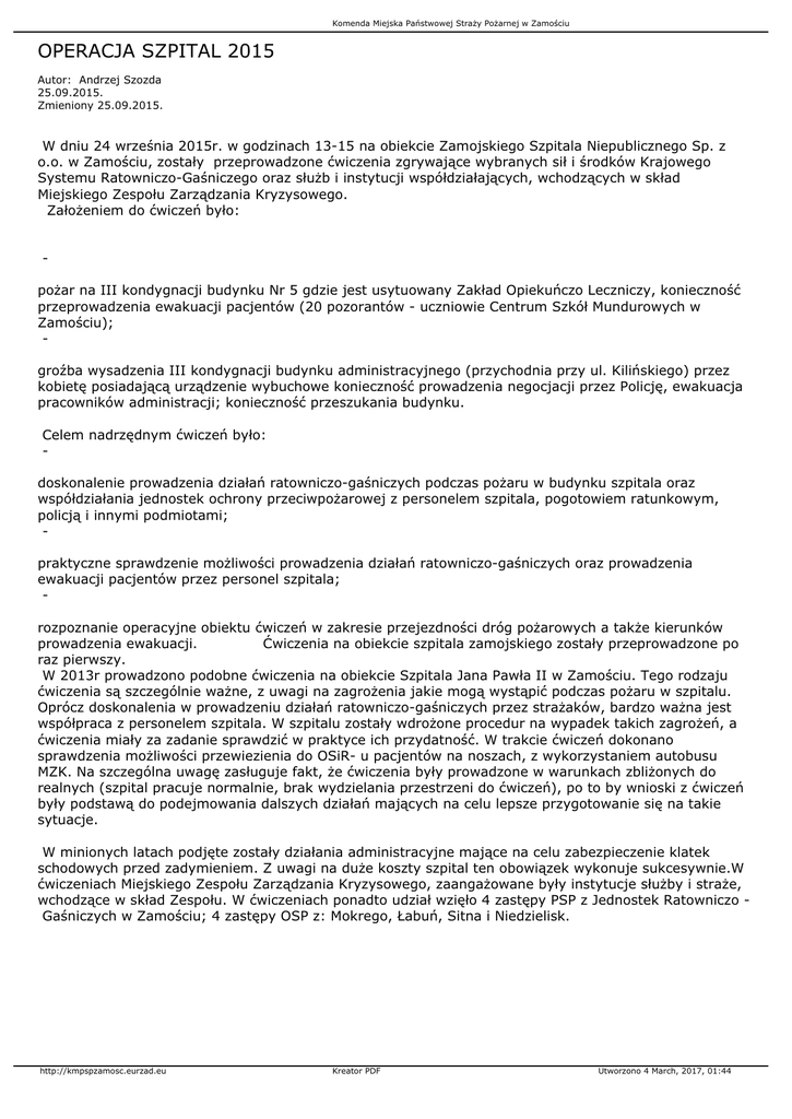 Komenda Miejska Państwowej Straży Pożarnej w Zamościu OPERACJA SZPITAL 2015 Autor: Andrzej Szozda 25.09.2015. Zmieniony 25.09.2015. W dniu 24 września 2015r. w godzinach 13-15 na obiekcie Zamojskiego Szpitala Niepublicznego Sp. z o.o. w Zamościu, zostały przeprowadzone ćwiczenia zgrywające wybranych sił i środków Krajowego Systemu Ratowniczo-Gaśniczego oraz służb i instytucji współdziałających, wchodzących w skład Miejskiego Zespołu Zarządzania Kryzysowego. Założeniem do ćwiczeń było: pożar na III kondygnacji budynku Nr 5 gdzie jest usytuowany Zakład Opiekuńczo Leczniczy, konieczność przeprowadzenia ewakuacji pacjentów (20 pozorantów - uczniowie Centrum Szkół Mundurowych w Zamościu); groźba wysadzenia III kondygnacji budynku administracyjnego (przychodnia przy ul. Kilińskiego) przez kobietę posiadającą urządzenie wybuchowe konieczność prowadzenia negocjacji przez Policję, ewakuacja pracowników administracji; konieczność przeszukania budynku. Celem nadrzędnym ćwiczeń było: doskonalenie prowadzenia działań ratowniczo-gaśniczych podczas pożaru w budynku szpitala oraz współdziałania jednostek ochrony przeciwpożarowej z personelem szpitala, pogotowiem ratunkowym, policją i innymi podmiotami; praktyczne sprawdzenie możliwości prowadzenia działań ratowniczo-gaśniczych oraz prowadzenia ewakuacji pacjentów przez personel szpitala; rozpoznanie operacyjne obiektu ćwiczeń w zakresie przejezdności dróg pożarowych a także kierunków prowadzenia ewakuacji. Ćwiczenia na obiekcie szpitala zamojskiego zostały przeprowadzone po raz pierwszy. W 2013r prowadzono podobne ćwiczenia na obiekcie Szpitala Jana Pawła II w Zamościu. Tego rodzaju ćwiczenia są szczególnie ważne, z uwagi na zagrożenia jakie mogą wystąpić podczas pożaru w szpitalu. Oprócz doskonalenia w prowadzeniu działań ratowniczo-gaśniczych przez strażaków, bardzo ważna jest współpraca z personelem szpitala. W szpitalu zostały wdrożone procedur na wypadek takich zagrożeń, a ćwiczenia miały za zadanie sprawdzić w praktyce ich przydatność. W trakcie ćwiczeń dokonano sprawdzenia możliwości przewiezienia do OSiR- u pacjentów na noszach, z wykorzystaniem autobusu MZK. Na szczególna uwagę zasługuje fakt, że ćwiczenia były prowadzone w warunkach zbliżonych do realnych (szpital pracuje normalnie, brak wydzielania przestrzeni do ćwiczeń), po to by wnioski z ćwiczeń były podstawą do podejmowania dalszych działań mających na celu lepsze przygotowanie się na takie sytuacje. W minionych latach podjęte zostały działania administracyjne mające na celu zabezpieczenie klatek schodowych przed zadymieniem. Z uwagi na duże koszty szpital ten obowiązek wykonuje sukcesywnie.W ćwiczeniach Miejskiego Zespołu Zarządzania Kryzysowego, zaangażowane były instytucje służby i straże, wchodzące w skład Zespołu. W ćwiczeniach ponadto udział wzięło 4 zastępy PSP z Jednostek Ratowniczo Gaśniczych w Zamościu; 4 zastępy OSP z: Mokrego, Łabuń, Sitna i Niedzielisk. http://kmpspzamosc.eurzad.eu Kreator PDF Utworzono 4 March, 2017, 01:44