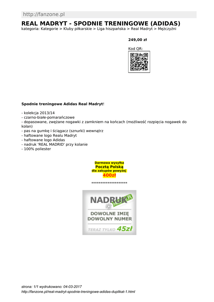 http://fanzone.pl REAL MADRYT - SPODNIE TRENINGOWE (ADIDAS) kategoria: Kategorie > Kluby piłkarskie > Liga hiszpańska > Real Madryt > Mężczyźni 249,00 zł Kod QR: Spodnie treningowe Adidas Real Madryt! - kolekcja 2013/14 - czarno-białe-pomarańczowe - dopasowane, zwężane nogawki z zamkniem na końcach (możliwość rozpięcia nogawek do kolan) - pas na gumkę i ściągacz (sznurki) wewnątrz - haftowane logo Realu Madryt - haftowane logo Adidas - nadruk 'REAL MADRID' przy kolanie - 100% poliester Darmowa wysyłka Pocztą Polską dla zakupów powyżej 400zł ******************** strona: 1/1 wydrukowano: 04-03-2017 http://fanzone.pl/real-madryt-spodnie-treningowe-adidas-duplikat-1.html