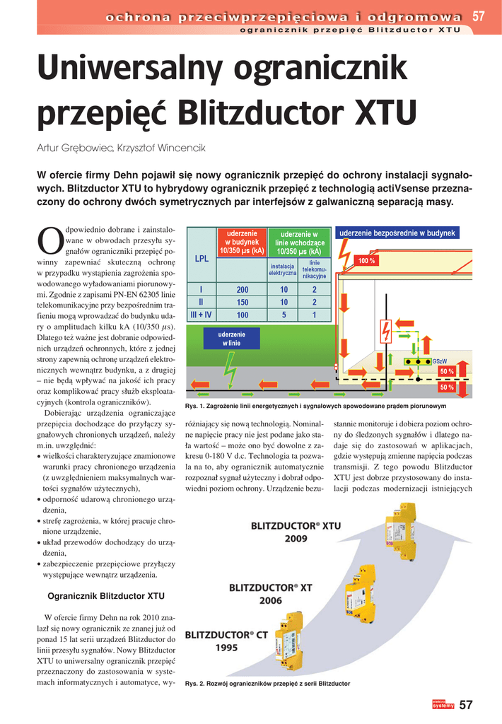 57 ogranicznik przepiÍÊ Blitzductor XTU Uniwersalny ogranicznik przepięć Blitzductor XTU Artur Grębowiec, Krzysztof Wincencik W ofercie firmy Dehn pojawi≥ siÍ nowy ogranicznik przepiÍÊ do ochrony instalacji sygna≥owych. Blitzductor XTU to hybrydowy ogranicznik przepiÍÊ z technologiπ actiVsense przeznaczony do ochrony dwÛch symetrycznych par interfejsÛw z galwanicznπ separacjπ masy. O dpowiednio dobrane i zainstalowane w obwodach przesy≥u sygna≥Ûw ograniczniki przepiÍÊ powinny zapewniaÊ skutecznπ ochronÍ w przypadku wystπpienia zagroøenia spowodowanego wy≥adowaniami piorunowymi. Zgodnie z zapisami PN-EN 62305 linie telekomunikacyjne przy bezpoúrednim trafieniu mogπ wprowadzaÊ do budynku udary o amplitudach kilku kA (10/350 μs). Dlatego teø waøne jest dobranie odpowiednich urzπdzeÒ ochronnych, ktÛre z jednej strony zapewniπ ochronÍ urzπdzeÒ elektronicznych wewnπtrz budynku, a z drugiej ñ nie bÍdπ wp≥ywaÊ na jakoúÊ ich pracy oraz komplikowaÊ pracy s≥uøb eksploatacyjnych (kontrola ogranicznikÛw). Dobierajπc urzπdzenia ograniczajπce przepiÍcia dochodzπce do przy≥πczy sygna≥owych chronionych urzπdzeÒ, naleøy m.in. uwzglÍdniÊ: ï wielkoúci charakteryzujπce znamionowe warunki pracy chronionego urzπdzenia (z uwzglÍdnieniem maksymalnych wartoúci sygna≥Ûw uøytecznych), ï odpornoúÊ udarowπ chronionego urzπdzenia, ï strefÍ zagroøenia, w ktÛrej pracuje chronione urzπdzenie, ï uk≥ad przewodÛw dochodzπcy do urzπdzenia, ï zabezpieczenie przepiÍciowe przy≥πczy wystÍpujπce wewnπtrz urzπdzenia. Rys. 1. Zagroøenie linii energetycznych i sygna≥owych spowodowane prπdem piorunowym rÛøniajπcy siÍ nowπ technologiπ. Nominalne napiÍcie pracy nie jest podane jako sta≥a wartoúÊ ñ moøe ono byÊ dowolne z zakresu 0-180 V d.c. Technologia ta pozwala na to, aby ogranicznik automatycznie rozpozna≥ sygna≥ uøyteczny i dobra≥ odpowiedni poziom ochrony. Urzπdzenie bezu- stannie monitoruje i dobiera poziom ochrony do úledzonych sygna≥Ûw i dlatego nadaje siÍ do zastosowaÒ w aplikacjach, gdzie wystÍpujπ zmienne napiÍcia podczas transmisji. Z tego powodu Blitzductor XTU jest dobrze przystosowany do instalacji podczas modernizacji istniejπcych Ogranicznik Blitzductor XTU W ofercie firmy Dehn na rok 2010 znalaz≥ siÍ nowy ogranicznik ze znanej juø od ponad 15 lat serii urzπdzeÒ Blitzductor do linii przesy≥u sygna≥Ûw. Nowy Blitzductor XTU to uniwersalny ogranicznik przepiÍÊ przeznaczony do zastosowania w systemach informatycznych i automatyce, wy- Rys. 2. RozwÛj ogranicznikÛw przepiÍÊ z serii Blitzductor 57 58 ogranicznik przepiÍÊ Blitzductor XTU Budowa Rys. 3. Poziom ochrony napiÍciowej UP w funkcji napiÍcia znamionowego UN dla ogranicznika przepiÍÊ Blitzductor XTU Rys. 4. Wyglπd ogranicznika Blitzductor XTU oraz schemat modu≥u ochronnego 57 systemÛw lub wymiany ochronnikÛw, gdy czÍsto trudno jest okreúliÊ interfejsy transmisji i panujπce poziomy napiÍÊ. W przy- padku ogranicznika Blitzductor XTU nie ma to znaczenia ñ sam sobie poradzi w takiej sytuacji. Blitzductor XTU jest dwuczÍúciowym, wielopolowym uniwersalnym ogranicznikiem przepiÍÊ zapewniajπcym wysokπ skutecznoúÊ ochrony w obwodach sterowniczo-pomiarowych, systemach magistralnych, systemach alarmowych i telekomunikacyjnych. Nowy ogranicznik wpisuje siÍ w liniÍ ogranicznikÛw serii Blitzductor BXT, przejmujπc ich zasadnicze w≥aúciwoúci: ï ochrona czterech øy≥ o przekroju do 2,5 mm2 w aparacie o szerokoúÊ 12 mm, ï ca≥kowita odpornoúÊ na udarowy prπd piorunowy 10 kA (4 x 2,5 kA) o kszta≥cie 10/350, ï energetyczna koordynacja z urzπdzeniem chronionym, ï wyposaøenie w system LifeCheck, ï jedna podstawa do wszystkich typÛw modu≥Ûw, ï ≥atwa wymiana modu≥u ñ bez przerwania obwodu. Optymalna konstrukcja ogranicznika zapewnia zarÛwno pewny styk przy wk≥adaniu modu≥u, jak rÛwnieø ≥atwe wyjmowanie z podstawki. Po umieszczeniu w podstawce modu≥ jest zabezpieczony przed wypadniÍciem. W celu wyjÍcia modu≥u z podstawki naleøy nacisnπÊ szare klawisze znajdujπce siÍ po obydwu stronach obudowy. Te funkcje bezpieczeÒstwa realizowane sπ poprzez piÛro prowadzπce modu≥ w podstawce oraz sprÍøyste zatrzaski na obudowie modu≥u. Aby zapewniÊ skutecznπ ochronÍ w trudnych warunkach przemys≥owych, ograniczniki przepiÍÊ Rys. 5. Montaø modu≥u ogranicznika Blitzductor XTU w podstawce 58 czerwiec 2010 ogranicznik przepiÍÊ Blitzductor XTU Zastosowanie uniwersalnego modu≥u moøe teø usprawniÊ pracÍ s≥uøb konserwacyjnych, gdyø w przypadku rozbudowanych systemÛw kontrolno-pomiarowych (z duøπ iloúciπ chronionych obwodÛw) zamiast kilku typÛw modu≥Ûw wykorzystuje siÍ jeden modu≥ uniwersalny. WiÍcej informacji na temat nowego ogranicznika Blitzductor XTU moøna znaleüÊ w serwisie internetowym www.dehn.pl lub u doradcÛw technicznych firmy DEHN Polska. Artur GrÍbowiec Krzysztof Wincencik Autorzy sπ pracownikami firmy Dehn Polska DEHN Polska Sp. z o.o. Zastosowanie Uniwersalne ograniczniki przepiÍÊ Blitzductor XTU znajdujπ zastosowanie do ochrony m.in. nastÍpujπcych interfejsÛw: ul. Poleczki 23 02-822 Warszawa tel. (22) 335 24 66 do 69 fax (22) 335 24 66 do 69 www.dehn.pl M A L K Modu≥ ochronny ogranicznika Blitzductor XTU z systemem LifeCheck poprzez wykorzystanie technologii RFID umoøliwia szybkπ, bezdotykowπ kontrolÍ aparatu, bez koniecznoúci wyjmowania modu≥u z podstawki, za pomocπ przenoúnego testera DEHNrecord LC. Miernik pokazuje rÛwnieø datÍ poprzedniej kontroli ogranicznika. Moøliwy jest rÛwnieø sta≥y nadzÛr za pomocπ dodatkowego modu≥u DRC MCM XT. Zintegrowany z modu≥em ogranicznika system LifeCheck zapewnia sta≥y nadzÛr nad parametrami oraz szybkπ informacjÍ o przeciπøeniu termicznym lub elektrycznym elementÛw modu≥u ochronnego. Sta≥π kontrolÍ na ogranicznikami (do 10 modu≥
