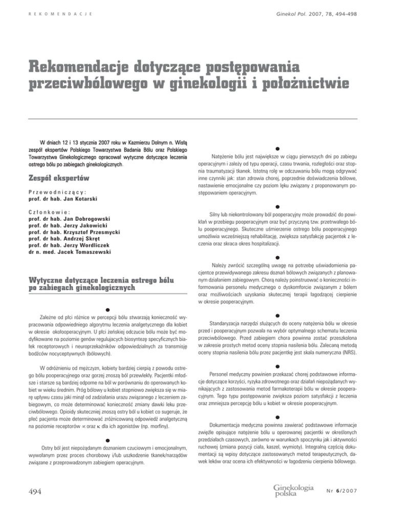 R E K O M E N D A C J E Ginekol Pol. 2007, 78, 494-498 Rekomendacje dotyczàce post´powania przeciwbólowego w ginekologii i po∏o˝nictwie W dniach 12 i 13 stycznia 2007 roku w Kazmierzu Dolnym n. Wis∏à zespó∏ ekspertów Polskiego Towarzystwa Badania Bólu oraz Polskiego Towarzystwa Ginekologicznego opracowa∏ wytyczne dotyczàce leczenia ostrego bólu po zabiegach ginekologicznych. Zespó∏ ekspertów Przewodniczàcy: prof. dr hab. Jan Kotarski Cz∏onkowie: prof. dr hab. Jan Dobrogowski prof. dr hab. Jerzy Jakowicki prof. dr hab. Krzysztof Przesmycki prof. dr hab. Andrzej Skr´t prof. dr hab. Jerzy Wordliczek dr n. med. Jacek Tomaszewski Wytyczne dotyczàce leczenia ostrego bólu po zabiegach ginekologicznych • Zale˝ne od p∏ci ró˝nice w percepcji bólu stwarzajà koniecznoÊç wypracowania odpowiedniego algorytmu leczenia analgetycznego dla kobiet w okresie oko∏ooperacyjnym. U p∏ci ˝eƒskiej odczucie bólu mo˝e byç modyfikowane na poziomie genów regulujacych biosyntez´ specyficznych bia∏ek receptorowych i neuroprzekaêników odpowiedzialnych za transmisj´ bodêców nocyceptywnych (bólowych). W odró˝nieniu od m´˝czyzn, kobiety bardziej cierpià z powodu ostrego bólu pooperacyjnego oraz gorzej znoszà ból przewlek∏y. Pacjentki m∏odsze i starsze sà bardziej odporne na ból w porównaniu do operowanych kobiet w wieku Êrednim. Próg bólowy u kobiet stopniowo zwi´ksza si´ w miar´ up∏ywu czasu jaki minà∏ od zadzia∏ania urazu zwiàzanego z leczeniem zabiegowym, co mo˝e determinowaç koniecznoÊç zmiany dawki leku przeciwbólowego. Opioidy skuteczniej znoszà ostry ból u kobiet co sugeruje, ˝e p∏eç pacjenta mo˝e determinowaç zró˝nicowanà odpowiedê analgetycznà na poziomie receptorów µ oraz κ dla ich agonistów (np. morfiny). • Ostry ból jest niepo˝àdanym doznaniem czuciowym i emocjonalnym, wywo∏anym przez proces chorobowy i/lub uszkodzenie tkanek/narzàdów zwiàzane z przeprowadzonym zabiegiem operacyjnym. 494 • Nat´˝enie bólu jest najwi´ksze w ciàgu pierwszych dni po zabiegu operacyjnym i zale˝y od typu operacji, czasu trwania, rozleg∏oÊci oraz stopnia traumatyzacji tkanek. Istotnà rol´ w odczuwaniu bólu mogà odgrywaç inne czynniki jak: stan zdrowia chorej, poprzednie doÊwiadczenia bólowe, nastawienie emocjonalne czy poziom l´ku zwiàzany z proponowanym post´powaniem operacyjnym. • Silny lub niekontrolowany ból pooperacyjny mo˝e prowadziç do powik∏aƒ w przebiegu pooperacyjnym oraz byç przyczynà tzw. przetrwa∏ego bólu pooperacyjnego. Skuteczne uÊmierzenie ostrego bólu pooperacyjnego umo˝liwia wczeÊniejszà rehabilitacj´, zwi´ksza satysfakcj´ pacjentek z leczenia oraz skraca okres hospitalizacji. • Nale˝y zwróciç szczególnà uwag´ na potrzeb´ uÊwiadomienia pacjentce przewidywanego zakresu doznaƒ bólowych zwiàzanych z planowanym dzia∏aniem zabiegowym. Chorà nale˝y poinstruowaç o koniecznoÊci informowania personelu medycznego o dyskomforcie zwiàzanym z bólem oraz mo˝liwoÊciach uzyskania skutecznej terapii ∏agodzàcej cierpienie w okresie pooperacyjnym. • Standaryzacja narz´dzi s∏u˝àcych do oceny nat´˝enia bólu w okresie przed i pooperacyjnym pozwala na wybór optymalnego schematu leczenia przeciwbólowego. Przed zabiegiem chora powinna zostaç przeszkolona w zakresie prostych metod oceny stopnia nasilenia bólu. Zalecanà metodà oceny stopnia nasilenia bólu przez pacjentk´ jest skala numeryczna (NRS). • Personel medyczny powinien przekazaç chorej podstawowe informacje dotyczàce korzyÊci, ryzyka zdrowotnego oraz dzia∏aƒ niepo˝àdanych wynikajàcych z zastosowania metod farmakoterapii bólu w okresie pooperacyjnym. Tego typu post´powanie zwi´ksza poziom satysfakcji z leczenia oraz zmniejsza percepcj´ bólu u kobiet w okresie pooperacyjnym. • Dokumentacja medyczna powinna zawieraç podstawowe informacje zwi´êle opisujàce nat´˝enie bólu u operowanej pacjentki w okreÊlonych przedzia∏ach czasowych, zarówno w warunkach spoczynku jak i aktywnoÊci ruchowej (zmiana pozycji cia∏a, kaszel, wymioty). Integralnà cz´Êcià dokumentacji sà wpisy dotyczàce zastosowanych metod terapeutycznych, dawek leków oraz ocena ich efektywnoÊci w ∏agodzeniu cierpienia bólowego. Nr 6/2007 R E K O M E N D A C J E Ginekol Pol. 2007, 78, 494-498 Rekomendacje dotyczàce post´powania przeciwbólowego w ginekologii i po∏o˝nictwie. • Celem post´powania przeciwbólowego po operacjach ginekologicznych jest subiektywna poprawa poczucia dobrostanu somatycznego i psychoemocjonalnego u chorej, które zosta∏o pogorszone przez ból b´dàcy nast´pstwem urazu tkankowego zwiàzanego z post´powaniem zabiegowym. Odpowiednio dobrana analgezja pooperacyjna zmniejsza stres hormonalny oraz metaboliczny, optymalizuje i skraca proces zdrowienia, poprawia jakoÊç ˝ycia oraz zmniejsza ryzyko powik∏aƒ i koszty leczenia szpitalnego. • Wybór metody post´powania przeciwbólowego w okresie pooperacyjnym zale˝y przede wszystkim od rodzaju i zakresu zabiegu ginekologicznego, który powinien zostaç przyporzàdkowany do jednej z czterech kategorii: Zabiegi operacyjne po∏àczone z niewielkim urazem tkanek – Kategoria I. W tej grupie mieszczà si´ drobne zabiegi ginekologiczne, wykonywane w ramach procedur chirurgii „jednego dnia”. Spodziewany poziom nat´˝enia bólu w okresie pooperacyjnym wynosi <4 punkty wg NRS, a czas trwania dolegliwoÊci bólowych jest zazwyczaj krótszy ni˝ 3 dni. Zabiegi operacyjne po∏àczone z miernym urazem tkanek – Kategoria II. W tej grupie mieszczà si´ zabiegi operacyjne w jamie brzusznej bez koniecznoÊci otwierania jamy otrzewnowej. Spodziewany poziom nat´˝enia bólu w okresie pooperacyjnym wynosi >4 punkty wg NRS, a czas trwania dolegliwoÊci bólowych w okresie pooperacyjnym jest zazwyczaj krótszy ni˝ 3 dni. Tabela I. Kategorie zabiegów operacyjnych w ginekologii i po∏o˝nictwie. I. Zabiegi operacy