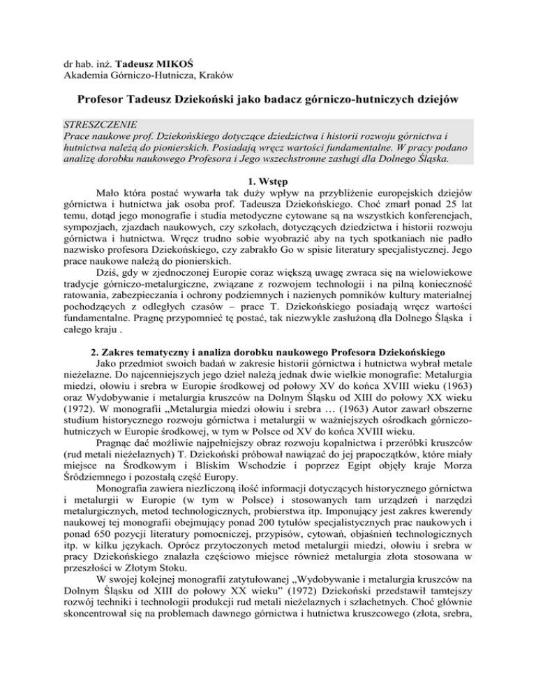 dr hab. inż. Tadeusz MIKOŚ Akademia Górniczo-Hutnicza, Kraków Profesor Tadeusz Dziekoński jako badacz górniczo-hutniczych dziejów STRESZCZENIE Prace naukowe prof. Dziekońskiego dotyczące dziedzictwa i historii rozwoju górnictwa i hutnictwa należą do pionierskich. Posiadają wręcz wartości fundamentalne. W pracy podano analizę dorobku naukowego Profesora i Jego wszechstronne zasługi dla Dolnego Śląska. 1. Wstęp Mało która postać wywarła tak duży wpływ na przybliżenie europejskich dziejów górnictwa i hutnictwa jak osoba prof. Tadeusza Dziekońskiego. Choć zmarł ponad 25 lat temu, dotąd jego monografie i studia metodyczne cytowane są na wszystkich konferencjach, sympozjach, zjazdach naukowych, czy szkołach, dotyczących dziedzictwa i historii rozwoju górnictwa i hutnictwa. Wręcz trudno sobie wyobrazić aby na tych spotkaniach nie padło nazwisko profesora Dziekońskiego, czy zabrakło Go w spisie literatury specjalistycznej. Jego prace naukowe należą do pionierskich. Dziś, gdy w zjednoczonej Europie coraz większą uwagę zwraca się na wielowiekowe tradycje górniczo-metalurgiczne, związane z rozwojem technologii i na pilną konieczność ratowania, zabezpieczania i ochrony podziemnych i nazienych pomników kultury materialnej pochodzących z odległych czasów – prace T. Dziekońskiego posiadają wręcz wartości fundamentalne. Pragnę przypomnieć tę postać, tak niezwykle zasłużoną dla Dolnego Śląska i całego kraju . 2. Zakres tematyczny i analiza dorobku naukowego Profesora Dziekońskiego Jako przedmiot swoich badań w zakresie historii górnictwa i hutnictwa wybrał metale nieżelazne. Do najcenniejszych jego dzieł należą jednak dwie wielkie monografie: Metalurgia miedzi, ołowiu i srebra w Europie środkowej od połowy XV do końca XVIII wieku (1963) oraz Wydobywanie i metalurgia kruszców na Dolnym Śląsku od XIII do połowy XX wieku (1972). W monografii „Metalurgia miedzi ołowiu i srebra … (1963) Autor zawarł obszerne studium historycznego rozwoju górnictwa i metalurgii w ważniejszych ośrodkach górniczohutniczych w Europie środkowej, w tym w Polsce od XV do końca XVIII wieku. Pragnąc dać możliwie najpełniejszy obraz rozwoju kopalnictwa i przeróbki kruszców (rud metali nieżelaznych) T. Dziekoński próbował nawiązać do jej prapoczątków, które miały miejsce na Środkowym i Bliskim Wschodzie i poprzez Egipt objęły kraje Morza Śródziemnego i pozostałą część Europy. Monografia zawiera niezliczoną ilość informacji dotyczących historycznego górnictwa i metalurgii w Europie (w tym w Polsce) i stosowanych tam urządzeń i narzędzi metalurgicznych, metod technologicznych, probierstwa itp. Imponujący jest zakres kwerendy naukowej tej monografii obejmujący ponad 200 tytułów specjalistycznych prac naukowych i ponad 650 pozycji literatury pomocniczej, przypisów, cytowań, objaśnień technologicznych itp. w kilku językach. Oprócz przytoczonych metod metalurgii miedzi, ołowiu i srebra w pracy Dziekońskiego znalazła częściowo miejsce również metalurgia złota stosowana w przeszłości w Złotym Stoku. W swojej kolejnej monografii zatytułowanej „Wydobywanie i metalurgia kruszców na Dolnym Śląsku od XIII do połowy XX wieku” (1972) Dziekoński przedstawił tamtejszy rozwój techniki i technologii produkcji rud metali nieżelaznych i szlachetnych. Choć głównie skoncentrował się na problemach dawnego górnictwa i hutnictwa kruszcowego (złota, srebra, miedzi, ołowiu i cyny) uwzględnił w niej również górnictwo i hutnictwo arsenu i kobaltu, ściśle związane z występowaniem w/w rud. Z prac studyjnych Dziekońskiego wynika, że roboty górnicze i hutnicze na Dolnym Śląsku obejmowały niegdyś duży asortyment metali (również i niemetali). Stały się one, zwłaszcza na przełomie XVIII i XIX wieku poligonem doświadczalnym przede wszystkim w zakresie metalurgii. Tam kształcono kadry fachowców oraz przeprowadzano próby i doświadczenia z nowymi urządzeniami i metodami górniczo-hutniczymi. Tradycje, doświadczenia i zdobycze dawnego górnictwa kruszcowego przyczyniło się do rozwoju górnictwa węglowego w zagłębiu wałbrzyskim i noworudzkim. Po likwidacji nierentownych kopalń w latach 60-tych XX wieku, górnicy dolnośląscy przekazywali swoje doświadczenie podczas budowy kopalń miedzi, cynku i ołowiu, czy siarki. Praca zawiera niezliczoną liczbę informacji o nieistniejących już kopalniach i sztolniach Dolnego Śląska. Szczególną rolę w procesie wydobycia i metalurgii dolnośląskich kruszców przypisał Dziekoński staremu centrum przemysłowemu w Złotym Stoku, któremu poświęcił czwartą część swojej monografii. Ten najstarszy ośrodek górniczo-hutniczy w Polsce stanął nawet w szeregu wzorcowych europejskich ośrodków metalurgii złota i arsenu. Z pracy Dziekońskiego wynika, że choć większość dolnośląskich ośrodków, z braku bogatych złóż nigdy nie miały znaczącej produkcji (z wyjątkiem Złotego Stoku) to osiągano tam wysoki poziom techniki. W załączonej bibliografii podał Dziekoński zarówno źródła rękopiśmienne, zawierające m.in. wykazy planów górniczych nieistniejących już kopalń (139 plany), akta dawne, kodeksy, wykaz dawnych prac dyplomowych jak i źródła drukowane (ok. 200 pozycji literaturowych) głównie w języku niemieckim. Spis ilustracji obrazujących głównie plany, przekroje, historyczne widoki, stare budynki urządzenia, schematy technologiczne, zawiera 122 pozycje. (Część tej ikonografii znajduje się obecnie w Państwowym Archiwum w Katowicach). 3. Prace laboratoryjne i badania eksperymentalne Jako archeolog rozumiał, że znaleziska archeologiczne są obok pisanych najważniejszymi źródłami nauk historycznych i że istnieje potrzeba ustalania rodzaju surowca i sposobu wykonania znajdowanych wyrobów metalowych. Zdawał sobie sprawę, że utworzenie specjalistycznego laboratorium anality