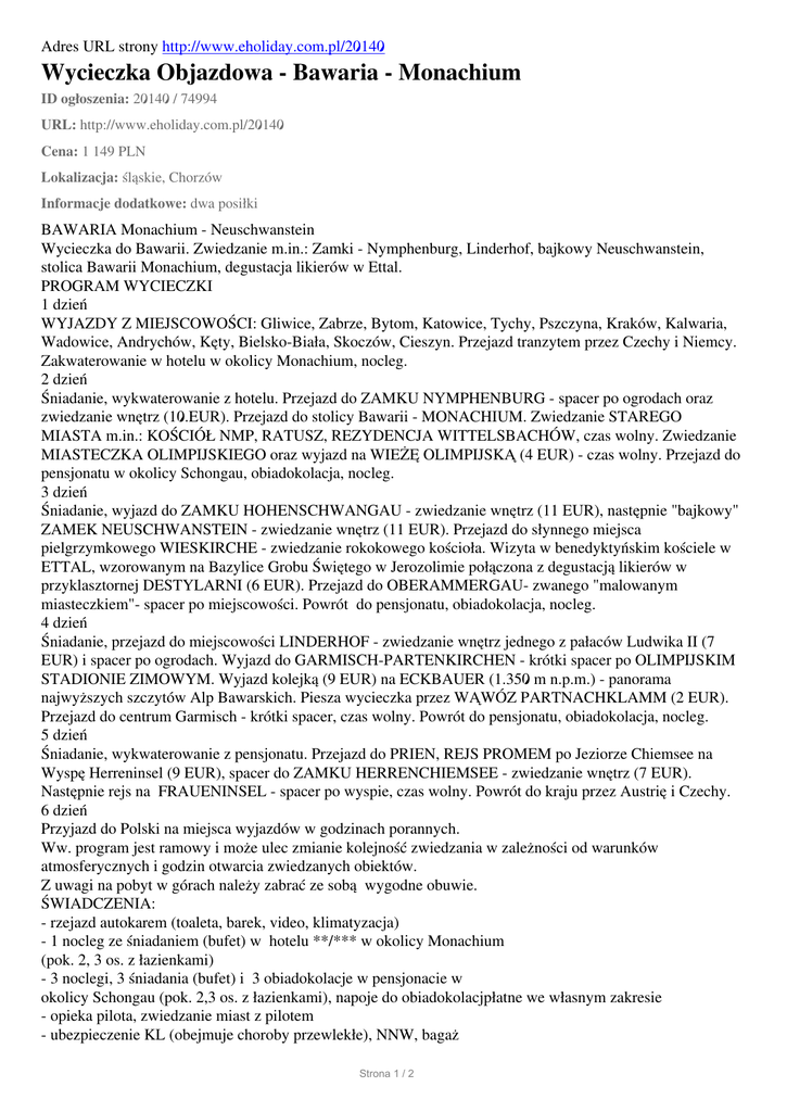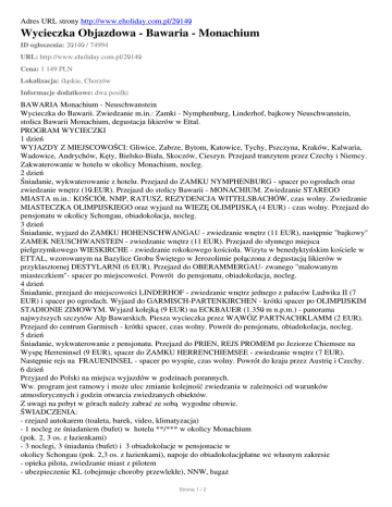 Adres URL strony http://www.eholiday.com.pl/20140 Wycieczka Objazdowa - Bawaria - Monachium ID ogłoszenia: 20140 / 74994 URL: http://www.eholiday.com.pl/20140 Cena: 1 149 PLN Lokalizacja: śląskie, Chorzów Informacje dodatkowe: dwa posiłki BAWARIA Monachium - Neuschwanstein Wycieczka do Bawarii. Zwiedzanie m.in.: Zamki - Nymphenburg, Linderhof, bajkowy Neuschwanstein, stolica Bawarii Monachium, degustacja likierów w Ettal. PROGRAM WYCIECZKI 1 dzień WYJAZDY Z MIEJSCOWOŚCI: Gliwice, Zabrze, Bytom, Katowice, Tychy, Pszczyna, Kraków, Kalwaria, Wadowice, Andrychów, Kęty, Bielsko-Biała, Skoczów, Cieszyn. Przejazd tranzytem przez Czechy i Niemcy. Zakwaterowanie w hotelu w okolicy Monachium, nocleg. 2 dzień Śniadanie, wykwaterowanie z hotelu. Przejazd do ZAMKU NYMPHENBURG - spacer po ogrodach oraz zwiedzanie wnętrz (10.EUR). Przejazd do stolicy Bawarii - MONACHIUM. Zwiedzanie STAREGO MIASTA m.in.: KOŚCIÓŁ NMP, RATUSZ, REZYDENCJA WITTELSBACHÓW, czas wolny. Zwiedzanie MIASTECZKA OLIMPIJSKIEGO oraz wyjazd na WIEŻĘ OLIMPIJSKĄ (4 EUR) - czas wolny. Przejazd do pensjonatu w okolicy Schongau, obiadokolacja, nocleg. 3 dzień Śniadanie, wyjazd do ZAMKU HOHENSCHWANGAU - zwiedzanie wnętrz (11 EUR), następnie "bajkowy" ZAMEK NEUSCHWANSTEIN - zwiedzanie wnętrz (11 EUR). Przejazd do słynnego miejsca pielgrzymkowego WIESKIRCHE - zwiedzanie rokokowego kościoła. Wizyta w benedyktyńskim kościele w ETTAL, wzorowanym na Bazylice Grobu Świętego w Jerozolimie połączona z degustacją likierów w przyklasztornej DESTYLARNI (6 EUR). Przejazd do OBERAMMERGAU- zwanego "malowanym miasteczkiem"- spacer po miejscowości. Powrót do pensjonatu, obiadokolacja, nocleg. 4 dzień Śniadanie, przejazd do miejscowości LINDERHOF - zwiedzanie wnętrz jednego z pałaców Ludwika II (7 EUR) i spacer po ogrodach. Wyjazd do GARMISCH-PARTENKIRCHEN - krótki spacer po OLIMPIJSKIM STADIONIE ZIMOWYM. Wyjazd kolejką (9 EUR) na ECKBAUER (1.350 m n.p.m.) - panorama najwyższych szczytów Alp Bawarskich. Piesza wycieczka przez WĄWÓZ PARTNACHKLAMM (2 EUR). Przejazd do centrum Garmisch - krótki spacer, czas wolny. Powrót do pensjonatu, obiadokolacja, nocleg. 5 dzień Śniadanie, wykwaterowanie z pensjonatu. Przejazd do PRIEN, REJS PROMEM po Jeziorze Chiemsee na Wyspę Herreninsel (9 EUR), spacer do ZAMKU HERRENCHIEMSEE - zwiedzanie wnętrz (7 EUR). Następnie rejs na FRAUENINSEL - spacer po wyspie, czas wolny. Powrót do kraju przez Austrię i Czechy. 6 dzień Przyjazd do Polski na miejsca wyjazdów w godzinach porannych. Ww. program jest ramowy i może ulec zmianie kolejność zwiedzania w zależności od warunków atmosferycznych i godzin otwarcia zwiedzanych obiektów. Z uwagi na pobyt w górach należy zabrać ze sobą wygodne obuwie. ŚWIADCZENIA: - rzejazd autokarem (toaleta, barek, video, klimatyzacja) - 1 nocleg ze śniadaniem (bufet) w hotelu **/*** w okolicy Monachium (pok. 2, 3 os. z łazienkami) - 3 noclegi, 3 śniadania (bufet) i 3 obiadokolacje w pensjonacie w okolicy Schongau (pok. 2,3 os. z łazienkami), napoje do obiadokolacjpłatne we własnym zakresie - opieka pilota, zwiedzanie miast z pilotem - ubezpieczenie KL (obejmuje choroby przewlekłe), NNW, bagaż Strona 1 / 2 Koszty wstępów uczestnicy pokrywają we własnym zakresie. Orientacyjne ceny podano w programie. Na wstępy należy przeznaczyć około 76 EUR. TERMINY : 30.04-05.05.2010 (6 dni) 1149.00 PLN 15.06-20.06.2010 (6 dni) 1149.00 PLN 13.07-18.07.2010 (6 dni) 1149.00 PLN 03.08-08.08.2010 (6 dni) 1149.00 PLN ROZKŁAD JAZDY: Gliwice :: Pl. Piastów obok sklepu "PIAST" :: 5.40 Zabrze :: Parking obok C.H. "KAUFLAND" ul. Korfantego 5 :: 6.00 Bytom :: Pl. Wolskiego za stacją paliw "BLISKA" :: 6.20 Katowice :: Parking ul. Sądowa :: 7.00 Tychy :: Przystanek autobusowy vis a vis hotelu "TYCHY" :: 7.35 Pszczyna :: Stary Dw. PKS obok C.H. "KAUFLAND" :: 7.55 Kraków :: ul. Kałuży za hotelem "CRACOVIA" :: 6.00 Kalwaria :: Dw. PKS :: 6.45 Wadowice :: Dw. PKP :: 7.00 Andrychów :: Zatoczka przy WSW :: 7.20 Kęty :: Dw. PKS :: 7.40 BIELSKO-BIAŁA :: DW. PKS (dolny plac) :: 8.30 Skoczów :: Stare targowisko przy Dw. PKS :: 8.50 Cieszyn-Boguszowice :: Przejście graniczne :: 9.15 Informujemy, że na trasie Gliwice-Bielsko oraz Kraków-Bielsko przejazd może być realizowany innymi środkami transportu. W Bielsku-Białej istnieje możliwość przesiadk Biuro Podróży GEOTOUR UL. SOBIESKIEGO 8 41-500 CHORZÓW tel/fax: 32 249 14 53, 3460306, 3460307 tel.kom 500-55-66-00 e-mail: [email protected] www.geotour.com.pl www.biletyautobusowe.com.pl Dane kontaktowe: Firma: Geotour województwo: śląskie Chorzów, Sobieskiego 8 telefon: 323460306, 500556600 komunikator GG: 2805753 http://www.geotour.pl [email protected] Aktywacja: 29/01/10 10:00, odsłony: 3743 Strona 2 / 2