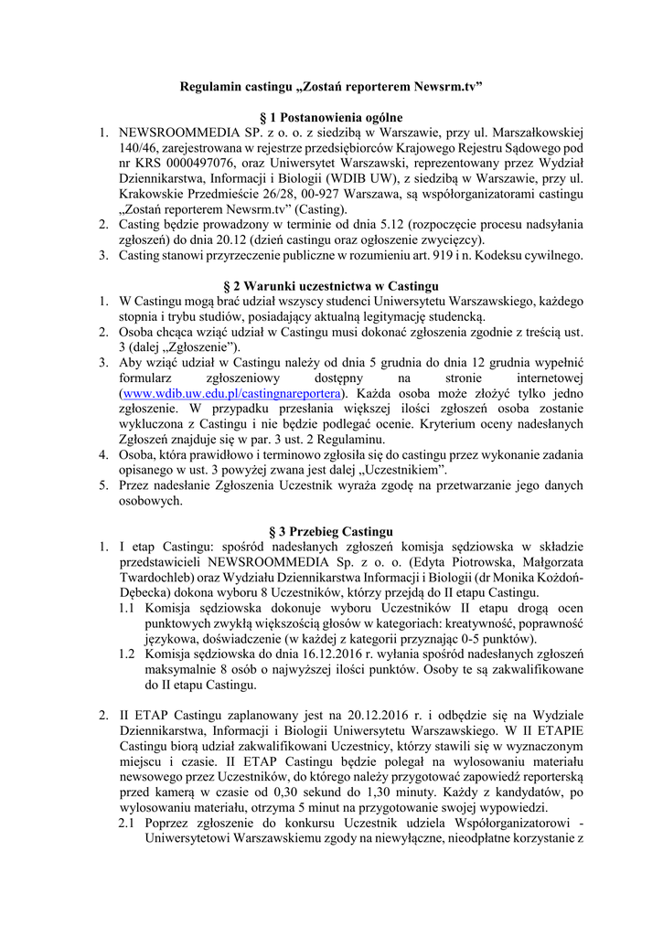 Regulamin castingu „Zostań reporterem Newsrm.tv” § 1 Postanowienia ogólne 1. NEWSROOMMEDIA SP. z o. o. z siedzibą w Warszawie, przy ul. Marszałkowskiej 140/46, zarejestrowana w rejestrze przedsiębiorców Krajowego Rejestru Sądowego pod nr KRS 0000497076, oraz Uniwersytet Warszawski, reprezentowany przez Wydział Dziennikarstwa, Informacji i Biologii (WDIB UW), z siedzibą w Warszawie, przy ul. Krakowskie Przedmieście 26/28, 00-927 Warszawa, są współorganizatorami castingu „Zostań reporterem Newsrm.tv” (Casting). 2. Casting będzie prowadzony w terminie od dnia 5.12 (rozpoczęcie procesu nadsyłania zgłoszeń) do dnia 20.12 (dzień castingu oraz ogłoszenie zwycięzcy). 3. Casting stanowi przyrzeczenie publiczne w rozumieniu art. 919 i n. Kodeksu cywilnego. § 2 Warunki uczestnictwa w Castingu 1. W Castingu mogą brać udział wszyscy studenci Uniwersytetu Warszawskiego, każdego stopnia i trybu studiów, posiadający aktualną legitymację studencką. 2. Osoba chcąca wziąć udział w Castingu musi dokonać zgłoszenia zgodnie z treścią ust. 3 (dalej „Zgłoszenie”). 3. Aby wziąć udział w Castingu należy od dnia 5 grudnia do dnia 12 grudnia wypełnić formularz zgłoszeniowy dostępny na stronie internetowej (www.wdib.uw.edu.pl/castingnareportera). Każda osoba może złożyć tylko jedno zgłoszenie. W przypadku przesłania większej ilości zgłoszeń osoba zostanie wykluczona z Castingu i nie będzie podlegać ocenie. Kryterium oceny nadesłanych Zgłoszeń znajduje się w par. 3 ust. 2 Regulaminu. 4. Osoba, która prawidłowo i terminowo zgłosiła się do castingu przez wykonanie zadania opisanego w ust. 3 powyżej zwana jest dalej „Uczestnikiem”. 5. Przez nadesłanie Zgłoszenia Uczestnik wyraża zgodę na przetwarzanie jego danych osobowych. § 3 Przebieg Castingu 1. I etap Castingu: spośród nadesłanych zgłoszeń komisja sędziowska w składzie przedstawicieli NEWSROOMMEDIA Sp. z o. o. (Edyta Piotrowska, Małgorzata Twardochleb) oraz Wydziału Dziennikarstwa Informacji i Biologii (dr Monika KożdońDębecka) dokona wyboru 8 Uczestników, którzy przejdą do II etapu Castingu. 1.1 Komisja sędziowska dokonuje wyboru Uczestników II etapu drogą ocen punktowych zwykłą większością głosów w kategoriach: kreatywność, poprawność językowa, doświadczenie (w każdej z kategorii przyznając 0-5 punktów). 1.2 Komisja sędziowska do dnia 16.12.2016 r. wyłania spośród nadesłanych zgłoszeń maksymalnie 8 osób o najwyższej ilości punktów. Osoby te są zakwalifikowane do II etapu Castingu. 2. II ETAP Castingu zaplanowany jest na 20.12.2016 r. i odbędzie się na Wydziale Dziennikarstwa, Informacji i Biologii Uniwersytetu Warszawskiego. W II ETAPIE Castingu biorą udział zakwalifikowani Uczestnicy, którzy stawili się w wyznaczonym miejscu i czasie. II ETAP Castingu będzie polegał na wylosowaniu materiału newsowego przez Uczestników, do którego należy przygotować zapowiedź reporterską przed kamerą w czasie od 0,30 sekund do 1,30 minuty. Każdy z kandydatów, po wylosowaniu materiału, otrzyma 5 minut na przygotowanie swojej wypowiedzi. 2.1 Poprzez zgłoszenie do konkursu Uczestnik udziela Współorganizatorowi Uniwersytetowi Warszawskiemu zgody na niewyłączne, nieodpłatne korzystanie z 2.2 2.3 2.4 2.5 całości lub fragmentów materiału newsowego oraz praw zależnych do niego (tłumaczenie), pod warunkiem dopuszczenia Uczestnika do II ETAPU, od momentu utrwalenia materiału newsowego, na czas trwania autorskich praw majątkowych, bez ograniczeń terytorialnych. Zgoda, o której mowa w ust. 2.1 powyżej obejmuje prawo do wykorzystania przez Uniwersytet materiałów newsowych w celach promujących uczelnię, w szczególności poprzez utrwalenie materiału techniką cyfrową, publiczne odtworzenie, wprowadzenie do pamięci komputera oraz sieci Internet, umieszczenie na stronie internetowej Wydziału Dziennikarstwa, Informacji i Bibliologii UW i udostępnienie go użytkownikom sieci z możliwością zapisu na komputerze użytkownika. Komisja sędziowska ocenia wystąpienia Uczestników drogą ocen punktowych zwykłą większością głosów w kategoriach: płynność wypowiedzi, poprawność językowa, prezencja przed kamerą, praca głosem, merytoryka przedstawionego newsa, atrakcyjność przedstawionego newsa. Punktacja Etapu I i Etapu II nie sumuje się. Wyniki castingu zostaną ogłoszone 20.12.2016 r., po krótkiej naradzie i podliczeniu punktów przez komisję sędziowską. §4 Cel i nagroda Castingu 1. Celem Castingu jest wybranie jednego Uczestnika, który zostanie reporterem Newsrm.tv. 2. W przypadku osiągnięcia największej ilości punktów przez więcej niż jednego Uczestnika, rozstrzygający będzie głos Współorganizatora - NEWSROOMMEDIA SP. z o. o. W przypadku rezygnacji przez zwycięzcę z udziału w Castingu, zwycięzcą zostaje Uczestnik, który uzyskał kolejno największą ilość punktów. 3. Newsrm.tv gwarantuje zwycięzcy stanowisko stażysty, płatne na podstawie umowy zlecenie zawartej na okres 2 miesięcy. Umowa zostanie zawarta w terminie uzgodnionym pomiędzy Fundatorem a zwycięzcą. Wynagrodzenie zwycięzcy wynosi 1.000 zł netto miesięcznie. 4. Zwycięzcy zapewnia się odbycie w ramach stażu delegacji reporterskiej oraz szkolenia z zakresu obsługi programów do montażu materiałów produkowanych przez Newsrm.tv 5. Fundatorem wynagrodzenia jest organizator NEWSROOMMEDIA SP. Z O. O. z siedzibą w Warszawie, przy ul. Marszałkowskiej 140/46, zarejestrowana w rejestrze przedsiębiorców Krajowego Rejestru Sądowego pod nr KRS 0000497076. § 5 Postępowanie reklamacyjne 1. Uczestnik Castingu może wnieść reklamację od rozstrzygnięć Komisji sędziowskiej w terminie 7 dni od dnia powzięcia wiadomości o rozstrzygnięciu, jednak nie później niż w terminie 7 dni od dnia wyłonienia zwycięzcy Castingu. 2. Reklamacje należy składać na adres: ul. Marszałkowska 140/46 00-061 Warszawa, 
