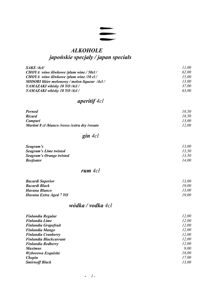 ALKOHOLE japońskie specjały / japan specials SAKE /4cl/ CHOYA wino śliwkowe /plum wine / 50cl / CHOYA wino śliwkowe /plum wine /10 cl / MIDORI likier melonowy / melon liqueur /4cl / YAMAZAKI whisky 10 YO /4cl / YAMAZAKI whisky 18 YO /4cl / 11,00 62,00 15,00 13,00 37,00 63,00 aperitif 4cl Pernod Ricard Campari Martini 8 cl /bianco /rosso /extra dry /rosato 18,50 18,50 13,00 12,00 gin 4cl 13,00 13,50 13,50 14,00 Seagram’s Seagram’s Lime twisted Seagram’s Orange twisted Beefeater rum 4cl 13,00 19,00 13,00 19,00 Bacardi Superior Bacardi Black Havana Blanco Havana Extra Aged 7 YO wódka / vodka 4cl 12,00 12,00 12,00 12,00 12,00 12,00 12,00 9,00 18,00 17,00 13,00 Finlandia Regular Finlandia Lime Finlandia Grapefruit Finlandia Mango Finlandia Cranberry Finlandia Blackcurrant Finlandia Redberry Maximus Wyborowa Exquisite Chopin Smirnoff Black - 1- 18,00 9,00 9,00 9,00 9,00 11,00 Grey Goose Żubrówka Wiśniówka Krupnik Gorzka Żołądkowa Becherovka tequila 4cl 16,00 17,00 24,00 25,00 30,00 El Jimador Blanco El Jimador Reposado Herradura Blanco Herradura Reposado Herradura Anejo whiskey & whisky 4cl 19,00 23,00 26,00 16,00 22,00 17,00 21,00 16,00 17,00 22,00 22,00 36,00 110,00 17,00 17,00 22,00 82,00 Jack Daniel’s Gentleman Jack Jack Daniel’s Single Barrel Tullamore Dew Tullamore Dew 12 YO Jameson Jameson 12 YO Famous Grouse Ballantine`s Finest Ballantine`s Gold Seal Chivas Regal 12 YO Chivas 18 YO Chivas Royal Salute Passport Johnnie Walker Red Johnnie Walker Black Johnnie Walker Blue bourbon 4cl 25,00 17,00 30,00 Woodford Reserve Jim Beam Knob Creek single malt 4cl 39,00 58,00 25,00 45,00 210,00 Macallan 12 YO Macallan 18 YO Glenlivet 12 YO Glenlivet 18 YO Balvenie 30 YO -2- koniak & brandy 4cl 26,00 33,00 85,00 110,00 28,00 16,00 Martell VS Martell VSOP Martell XO Martell Cordon Blue Hennessy Fine de Cognac Metaxa***** likiery / liqueur 4cl 21,00 15,00 15,00 13,00 12,00 13,00 16,00 14,00 17,00 16,00 12,00 13,00 13,00 13,00 13,00 13,00 13,00 13,00 13,00 Chambord Southern Comfort Frangelico Carolans Irish Cream Malibu Passoa Galliano Kahlua Sambucca Ramazotti Cointreau Jagermeister De Kuyper Amaretto De Kuyper Crème de Cassis De Kuyper Melon De Kuyper Crème de Cacao De Kuyper Peach Tree De Kuyper Blue Curacao De Kuyper Watermelon De Kuyper Triple Sec alkohole inne / other alcohols 4cl 29,00 17,00 15,00 Calvados 8 ans d’age Grappa Fior di Vite Ramazotti Canario Cachaca -3- piwo beczkowe / draft beer Żywiec 0,3l /0,5l 9,00/13,00 0,3l /0,5l 9,00/13,00 Heineken piwo butelkowe / bottled beer Żywiec Żywiec niskoalkoholowy Heineken Żywiec porter Paulaner Desperados Kirin Ichiban 0,33l 10,00 0,33l 9,00 0,33l10,00 0,33 l 10,00 0,5 l 18,00 0,33 l 15,00 0,33 l 15,00 -4- DRINKI / DRINKS 20,00 FRESH FRUIT MARTINI wódka finlandia regular, syrop cukrowy, malina / marakuja vodka finlandia , brown sugar, puree raspberry or marakuja 23,00 JOHN COLLINS wódka finlandia regular, sok z cytryny, syrop cukrowy, puree owocowe vodka finlandia, lemon juice, sugar, puree fruits raspberry or marakuja 22,00 MIDORI SOUR likier midori, syrop cukrowy, sok z cytryny liquor midori, sugar, lemon juice 31,00 TOKYO ICE TEA wódka finlandia regular, gin, rum, tequila el jimador blanco, midori, sok z cytryny, syrop cukrowy, sprite wodka finlandia regular, gin, rum, tequila el jimador blanco, liquor midori, lemon juice, sugar, sprite 23,00 MOJITO rum, limonka, liście mięty, syrop cukrowy, woda gaz. rum, lime, peppermint leaf, sugar, sparkling water 20,00 CAIPIRINHA cachaca, limonka, syrop cukrowy, cukier trzcinowy cachaca, lime, sugar 23,00 MARGARITA tequila el jimador blanco, triple sec, syrop cukrowy, limonka tequila el jimador blanco, liquor triple sec, sugar, lime 23,00 MOSCOV MULE wódka finlandia regular, piwo imbirowe, syrop imbirowy, limonka wodka finlandia regular, ginger beer, ginger syrup, lime -5- COSMOPOLITAN 20,00 wódka finlandia lime, triple sec, sok z żurawiny, limonka wodka finlandia lemon, liquor triple sec, cranberry juice, lime THE MANHATTAN 22,00 woodford reserve, martini extra dry, martini rosso, angustura bourbon woodford reserve, martini extra dry, martini rosso, angustura SUNTORY MANHATTAN 50,00 whisky yamazaki suntory 12 YO, martini extra dry, angustura whisky yamazaki suntory 12 YO, martini extra dry, angustura BRANDY ALEXANDER 25,00 cognac martell VS, de kuyper crème de cacao, śmietanka cognac martell VS, de kuyper crème de cacao, cream BLACK RUSSIAN 19,00 wódka finlandia regular, kahlua wodka finlandia regular, liquor kahlua NEGRONI 15,00 gin, campari, martini rosso CUBA LIBRE 23,00 rum, pepsi, limonka rum, pepsi, fresh lemon juice GIN MARTINI 18,00 gin, martini extra dry BELLINI 28,00 wino musujące, puree brzoskwiniowe, sparkling wine, puree peach KIR ROYAL 24,00 wino musujące, crème de cassis sparkling wine, liquor crème de cassis FRENCH 75 gin, wino musujące, sok z cytryny, syrop cukrowy gin, sparkling wine, lemon juice, sugar Zen Jazz Bistro, ul. Jasna 24, 00- 054 Warszawa, tel. 22 447 25 00 [email protected] 23,00
