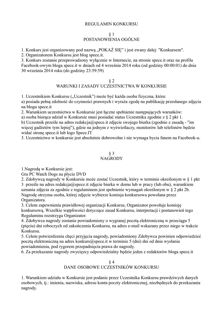 REGULAMIN KONKURSU §1 POSTANOWIENIA OGÓLNE 1. Konkurs jest organizowany pod nazwą „POKAŻ SIĘ” i jest zwany dalej: "Konkursem". 2. Organizatorem Konkursu jest blog spece.it. 3. Konkurs zostanie przeprowadzony wyłącznie w Internecie, na stronie spece.it oraz na profilu Facebook-owym bloga spece.it w dniach od 4 września 2014 roku (od godziny 00:00:01) do dnia 30 września 2014 roku (do godziny 23:59:59) §2 WARUNKI I ZASADY UCZESTNICTWA W KONKURSIE 1. Uczestnikiem Konkursu („Uczestnik”) może być każda osoba fizyczna, która: a) posiada pełną zdolność do czynności prawnych i wyraża zgodę na publikację przesłanego zdjęcia na blogu spece.it 2. Warunkiem uczestnictwa w Konkursie jest łączne spełnienie następujących warunków: a) osoba biorąca udział w Konkursie musi posiadać status Uczestnika zgodnie z § 2 pkt 1. b) Uczestnik prześle na adres [email protected] zdjęcie swojego biurka (zgodnie z zasadą - "im więcej gadżetów tym lepiej"), gdzie na jednym z wyświetlaczy, monitorów lub telefonów będzie widać stronę spece.it lub logo Spece.IT 3. Uczestnictwo w konkursie jest absolutnie dobrowolne i nie wymaga bycia fanem na Facebook-u. §3 NAGRODY 1.Nagrodą w Konkursie jest: Gra PC Watch Dogs na płycie DVD 2. Zdobywcą nagrody w Konkursie może zostać Uczestnik, który w terminie określonym w § 1 pkt 3 prześle na adres [email protected] zdjęcie biurka w domu lub w pracy (lub obu), warunkiem uznania zdjęcia za zgodnie z regulaminem jest spełnienie wymagań określonym w § 2 pkt 2b. Nagrodę otrzyma osoba, której zdjęcie wybierze komisja konkursowa powołana przez Organizatora. 3. Celem zapewnienia prawidłowej organizacji Konkursu, Organizator powołuje komisję konkursową. Wszelkie wątpliwości dotyczące zasad Konkursu, interpretacji i postanowień tego Regulaminu rozstrzyga Organizator. 4. Zdobywca nagrody zostanie powiadomiony o wygranej pocztą elektroniczną w przeciągu 5 (pięciu) dni roboczych od zakończenia Konkursu, na adres e-mail wskazany przez niego w trakcie Konkursu. 5. Celem potwierdzenia chęci przyjęcia nagrody, powiadomiony Zdobywca powinien odpowiedzieć pocztą elektroniczną na adres [email protected] w terminie 5 (dni) dni od dnia wysłania powiadomienia, pod rygorem przepadnięcia prawa do nagrody. 6. Za przekazanie nagrody zwycięzcy odpowiedzialny będzie jeden z redaktorów bloga spece.it §4 DANE OSOBOWE UCZESTNIKÓW KONKURSU 1. Warunkiem udziału w Konkursie jest podanie przez Uczestnika Konkursu prawdziwych danych osobowych, tj.: imienia, nazwiska, adresu konta poczty elektronicznej, niezbędnych do przekazania nagrody. 2. Przystępując do Konkursu i akceptując niniejszy regulamin Uczestnik wyraża zgodę na przetwarzanie podanych przez niego danych osobowych przez Organizatora. Dane będą przetwarzane wyłącznie w celu przeprowadzenia Konkursu oraz wyłącznie w związku z wydaniem nagrody. §5 POSTANOWIENIA KOŃCOWE Organizator ma prawo do zmiany postanowień niniejszego Regulaminu, o ile nie wpłynie to na pogorszenie warunków uczestnictwa w Konkursie. Dotyczy to w szczególności zmian terminów poszczególnych czynności konkursowych. Zmieniony Regulamin obowiązuje od czasu opublikowania go na stronie spece.it.