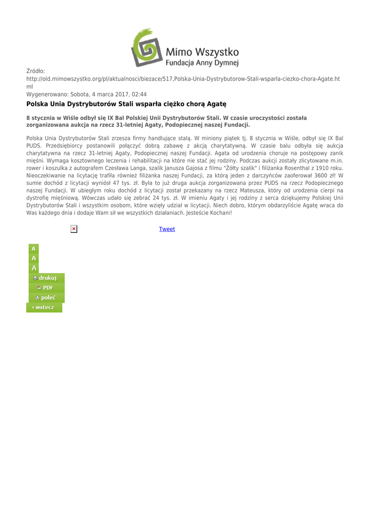 Źródło: http://old.mimowszystko.org/pl/aktualnosci/biezace/517,Polska-Unia-Dystrybutorow-Stali-wsparla-ciezko-chora-Agate.ht ml Wygenerowano: Sobota, 4 marca 2017, 02:44 Polska Unia Dystrybutorów Stali wsparła ciężko chorą Agatę 8 stycznia w Wiśle odbył się IX Bal Polskiej Unii Dystrybutorów Stali. W czasie uroczystości została zorganizowana aukcja na rzecz 31-letniej Agaty, Podopiecznej naszej Fundacji. Polska Unia Dystrybutorów Stali zrzesza firmy handlujące stalą. W miniony piątek tj. 8 stycznia w Wiśle, odbył się IX Bal PUDS. Przedsiębiorcy postanowili połączyć dobrą zabawę z akcją charytatywną. W czasie balu odbyła się aukcja charytatywna na rzecz 31-letniej Agaty, Podopiecznej naszej Fundacji. Agata od urodzenia choruje na postępowy zanik mięśni. Wymaga kosztownego leczenia i rehabilitacji na które nie stać jej rodziny. Podczas aukcji zostały zlicytowane m.in. rower i koszulka z autografem Czesława Langa, szalik Janusza Gajosa z filmu "Żółty szalik" i filiżanka Rosenthal z 1910 roku. Nieoczekiwanie na licytację trafiła również filiżanka naszej Fundacji, za którą jeden z darczyńców zaoferował 3600 zł! W sumie dochód z licytacji wyniósł 47 tys. zł. Była to już druga aukcja zorganizowana przez PUDS na rzecz Podopiecznego naszej Fundacji. W ubiegłym roku dochód z licytacji został przekazany na rzecz Mateusza, który od urodzenia cierpi na dystrofię mięśniową. Wówczas udało się zebrać 24 tys. zł. W imieniu Agaty i jej rodziny z serca dziękujemy Polskiej Unii Dystrybutorów Stali i wszystkim osobom, które wzięły udział w licytacji. Niech dobro, którym obdarzyliście Agatę wraca do Was każdego dnia i dodaje Wam sił we wszystkich działaniach. Jesteście Kochani! Tweet