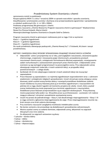 Przedmiotowy System Oceniania z chemii opracowany został na podstawie: Rozporządzenia MEN i S z dnia 7 września 2004r w sprawie warunków i sposobu oceniania, klasyfikowania i promowania uczniów i słuchaczy oraz przeprowadzania egzaminów i sprawdzianów w szkołach publicznych (Dz. U. nr 199 z 2004r) Podstawy programowej dla gimnazjum z chemii. Programu nauczania „Chemia Nowej Ery Program nauczania chemii w gimnazjum” Wydawnictwa Nowa Era (Teresa Kulawik, Maria Litwin) Wewnątrzszkolnego Systemu Oceniania w Zespole Szkół w Zieleniu Program nauczania chemii w gimnazjum realizowany jest w ciągu 3 lat w wymiarze: Klasa I – 2 godziny tygodniowo. Klasa II – 1 godzina tygodniowo. Klasa III – 2 godziny tygodniowo Do nauki przedmiotu obowiązuje podręcznik „Chemia Nowej Ery” J.T.Kulawik, M.Litwin i zeszyt przedmiotowy. METODY I NARZĘDZIA ORAZ SPOSOBY SPRAWDZANIA OSIĄGNIĘĆ EDUKACYJNYCH UCZNIÓW Odpowiedzi ustne ( przynajmniej raz w roku, pod względem rzeczowości, stosowania języka chemicznego, znajomości i stosowania pojęć chemicznych, prowadzenia prostych rozumowań chemicznych, umiejętności formułowania dłuższej wypowiedzi, rozwiązywanie zadań rachunkowych z zastosowaniem poznanych praw chemicznych. ) Odpowiedzi ustne oceniane są wg wymagań programowych na poszczególne oceny. Przy odpowiedzi ustnej obowiązuje znajomość materiału z trzech ostatnich lekcji, w przypadku lekcji powtórzeniowych - z całego działu. Kartkówki 10-15 min obejmujące materiał z trzech ostatnich lekcji nie muszą być zapowiadane. Prace klasowe są zapowiadane z co najmniej tygodniowym wyprzedzeniem wraz z zakresem wiadomości i umiejętności objętych sprawdzaniem. Uczeń otrzymuje ocenę celującą z pracy klasowej, jeżeli uzyskał ocenę bardzo dobrą i rozwiązał prawidłowo dodatkowe zadanie. Uczeń nieobecny na pracy klasowej pisze ją w terminie uzgodnionym z nauczycielem nie później niż w ciągu dwóch tygodni od momentu przyjścia do szkoły. Uczeń, który uzyskał ocenę niedostateczną może poprawiać ją w terminie uzgodnionym z nauczycielem. Dodatkowe prace klasowe przeprowadzane są po zajęciach edukacyjnych. Pracę klasową można poprawiać tylko jeden raz. Wszystkie prace są archiwizowane - uczniowie i ich rodzice mogą je zobaczyć i otrzymać uzasadnienie wystawionej oceny. Uczeń ma prawo do jednokrotnego – klasy II, lub dwukrotnego nieprzygotowania – klasy I i III w ciągu semestru zgłoszenia nieprzygotowania do zajęć. Przez nieprzygotowane rozumie się : brak zeszytu oraz brak zadania domowego. Przy ocenianiu nauczyciel uwzględnia możliwości intelektualne ucznia. Na koniec semestru nie przewiduje się dodatkowych sprawdzianów zaliczeniowych. Można uzyskać oceny za zadania domowe, odpowiedź ustną, aktywność na zajęciach lekcyjnych oraz inne zadania. Za aktywność na zajęciach wstawiane są plusy: - 5 plusów – bardzo dobry - 4 plusy – dobry - 3 plusy – dostateczny - 2 plusy – dopuszczający. W przypadku sprawdzianów pisemnych lub kartkówek przyjmuje się Skalę punktową przeliczaną na oceny cyfrowe wg kryteriów: 0%–30% niedostateczny 31%–50% dopuszczający 51%–75% dostateczny 76%–90% dobry 91%–100% bardzo dobry >101% celujący Prace dodatkowe: - praca na lekcji -prace grupowe teoretyczne lub doświadczenia, prezentacje nowych rozwiązań problemów stawianych przez nauczyciela lub innych uczniów oceniane każdorazowo na lekcji w zależności od wkładu pracy punktowo lub oceną, - praca w domu - referaty przygotowywane w domu i wygłaszane na lekcji lub sprawdzane przez nauczyciela, gazetki, plakaty - oceniane każdorazowo w zależności od wkładu pracy punktowo lub oceną. Na sprawdzianach, jeśli jest taka potrzeba uczniowie korzystają z układów okresowych i innych potrzebnych pomocy udostępnionych przez nauczyciela, a nie ze swoich prywatnych. Oceny wystawiane przez nauczyciela są jawne. W przypadku otrzymania oceny niedostatecznej śródrocznej uczeń zobowiązany jest do zaliczenia całego semestru w czasie określonym przez nauczyciela. Zaliczenie odbywa sięw formie testu, który uczeń pisze na zajęciach pozalekcyjnych Sposoby informowania uczniów: Na pierwszych godzinach lekcyjnych nauczyciel zapoznaje uczniów z PSO. Przedmiotowy system oceniania oraz szczegółowe wymagania na poszczególne oceny udostępnione są wszystkim uczniom w pracowni szkolnej, w bibliotece szkolnej i na stronie internetowej szkoły. Oceny cząstkowe są jawne, oparte o opracowane kryteria. Sprawdziany i inne prace pisemne są przechowywane do końca roku szkolnego. Sposoby informowania rodziców Dokumenty takie jak, przedmiotowy system oceniania oraz wymagania na poszczególne oceny są dostępne w Sali chemicznej, bibliotece oraz na stronie internetowej szkoły. O ocenach cząstkowych i klasyfikacyjnych informuje się rodziców na zebraniach lub w czasie indywidualnych spotkań umożliwiając wgląd do dziennika lekcyjnego. Informacje o grożącej ocenie niedostatecznej klasyfikacyjnej są przekazywane zgodnie z procedurą. Zasady wystawiania oceny śródrocznej i rocznej Wystawianie oceny klasyfikacyjnej dokonuje się na podstawie ocen cząstkowych, przy czym większą wagę mają oceny z godzinnych sprawdzianów, następnie kartkówki, potem pozostałe oceny. Sposoby korygowania niepowodzeń szkolnych i podnoszenia osiągnięć uczniów: Możliwość poprawy każdej oceny ze sprawdzianu Możliwość zwolnienia ze sprawdzianu lub kartkówki w wyjątkowych przypadkach losowych Uzupełnienie braków w ramach konsultacji z nauczycielem (po uprzednim ustaleniu dogodnego terminu) Możliwość zgłoszenia nieprzygotowania Możliwość uzyskania wyższej niż przewidywana oceny rocznej po napisaniu sprawdzianu obejmującego treści z zakresu realizowanego materiału w danym roku szkolnym Inne postanowienia: Uczeń obowiązany jest aktywnie uczestniczyć w lekcjach chemii, rzetelnie przygotowywać się do tyc