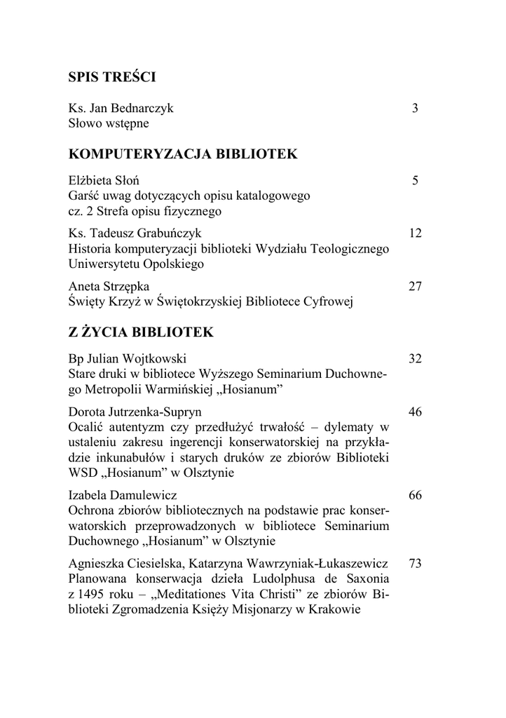SPIS TREŚCI Ks. Jan Bednarczyk Słowo wstępne 3 KOMPUTERYZACJA BIBLIOTEK Elżbieta Słoń Garść uwag dotyczących opisu katalogowego cz. 2 Strefa opisu fizycznego 5 Ks. Tadeusz Grabuńczyk Historia komputeryzacji biblioteki Wydziału Teologicznego Uniwersytetu Opolskiego 12 Aneta Strzępka Święty Krzyż w Świętokrzyskiej Bibliotece Cyfrowej 27 Z ŻYCIA BIBLIOTEK Bp Julian Wojtkowski Stare druki w bibliotece Wyższego Seminarium Duchownego Metropolii Warmińskiej „Hosianum” 32 Dorota Jutrzenka-Supryn Ocalić autentyzm czy przedłużyć trwałość – dylematy w ustaleniu zakresu ingerencji konserwatorskiej na przykładzie inkunabułów i starych druków ze zbiorów Biblioteki WSD „Hosianum” w Olsztynie 46 Izabela Damulewicz Ochrona zbiorów bibliotecznych na podstawie prac konserwatorskich przeprowadzonych w bibliotece Seminarium Duchownego „Hosianum” w Olsztynie 66 Agnieszka Ciesielska, Katarzyna Wawrzyniak-Łukaszewicz Planowana konserwacja dzieła Ludolphusa de Saxonia z 1495 roku – „Meditationes Vita Christi” ze zbiorów Biblioteki Zgromadzenia Księży Misjonarzy w Krakowie 73 Elżbieta Oszajca Konserwacja rękopisu „Mszał z Kraśnika” (ok. 1400 r.), inkunabułów i starodruków ze zbiorów Biblioteki Metropolitalnego Seminarium Duchownego w Lublinie 79 Ks. Wacław Umiński CM Działalność Biblioteki Zgromadzenia Księży Misjonarzy w Krakowie w roku 2009 92 Ks. Tomasz Garwoliński 60 rocznica wznowienia powojennej działalności Biblioteki Hosianum w Olsztynie 96 Tadeusz Ceynowa, Magdalena Florianowicz, Monika Zielonka Biblioteka Wyższego Seminarium Duchownego Diecezji Koszalińsko-Kołobrzeskiej 116 Bogumiła Warząchowska Rok Świętego Pawła w dysertacjach Wydziału Teologicznego Uniwersytetu Śląskiego w Katowicach 130 Edwin Klessa Zespół Biblioteki Parafialnej z Trzcianki z wizytą na Ukrainie 144 O KSIĄŻKACH I CZASOPISMACH INFORMACJE I RECENZJE Eliza Lubojańska „Gość Niedzielny” – charakterystyka dodatków do czasopisma w latach 1923-1939 149 Piotr Latawiec Forum Bibliotek Medycznych. Medical Library Forum Półrocznik. Wyd. Uniwersytet Medyczny w Łodzi. Red. nacz. Ryszard Żmuda. Łódź 2008 R. 1 (nr. 1, 2); 2009 R.2 (nr 1, 2) ISSN 1899-5829 166 Renata Dulian „Język religijny dawniej i dziś” t. 3-5, pod red. Pawła Bortkiewicza, Stanisława Mikołajczaka, Małgorzaty Rybki 170 Renata Dulian „La Procura” – strona internetowa 172 Renata Dulian Wydawnictwo Franciszkanów w Moskwie – strona internetowa 175 HISTORIA, FILOZOFIA Gabriela Łącka Księgarnia i drukarnia katolicka w świetle posługi biskupa Stanisława Adamskiego w latach 1930-1939 178 Jolanta Gwioździk Źródła do dziejów książki w archiwach żeńskich klasztorów kontemplacyjnych XVI-XVIII w. Zarys problematyki 202 Br. Grzegorz Filipiuk OFMCap Notatnik duchowy Bł. Honorata Koźmińskiego 210 Barbara Kowalska Księgozbiory prywatne duchowieństwa na Podhalu, w latach 1998-2006 219 DZIAŁ URZĘDOWY Sprawozdanie z pracy Zarządu za okres 10.09.20087.09.2009 255 Protokół z obrad XV Walnego Zgromadzenia Federacji Bibliotek Kościelnych FIDES (Olsztyn 7.10.2009) 258 Sprawozdanie ze spotkania przedstawicieli bibliotek wydziałów teologicznych w Polsce (Wrocław 24-25.09.2009 r.) 264