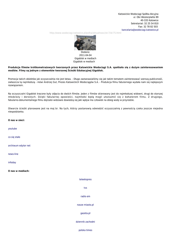 Katowickie Wodociągi Spółka Akcyjna ul. Obr.Westerplatte 89 40-335 Katowice Sekretariat: 32 25 54 810 Fax: 32 78 82 503 [email protected] http://www.wodociagi.katowice.pl/polka/aktualnosci/st:7/id:75.html Dodano: 2011-04-04 Gigablok w mediach Gigablok w mediach Produkcja filmów krótkometrażowych tworzonych przez Katowickie Wodociągi S.A. spotkała się z dużym zainteresowaniem mediów. Filmy są jednym z elementów tworzonej Ścieżki Edukacyjnej Gigablok. Promocja takich obiektów jak oczyszczalnia nie jest łatwa. - Długo zastanawialiśmy się jak takim tematem zainteresować szerszą publiczność, zwłaszcza tą najmłodszą - mówi Andrzej Gut, Prezes Katowickich Wodociągów S.A. - Produkcja filmu fabularnego wydała nam się najlepszym rozwiązaniem. Na oczyszczalni Gigablok kręcone były zdjęcia do dwóch filmów. Jeden z filmów skierowany jest do najmłodszej widowni, drugi do starszej młodzieży i dorosłych. Dzięki fabularnej opowieści, najmłodsi będą mogli utożsamić się z bohaterem filmu. Z drugiego, fabularno-dokumentalnego filmu dojrzalsi widzowie dowiedzą się jaki wpływ ma człowiek na obieg wody w przyrodzie. Otwarcie ścieżki planowane jest na maj br. Na tych, którzy postanowią odwiedzić oczyszczalnię z pewnością czeka jeszcze niejedna niespodzianka. O nas w sieci: youtube co się stało archiwum edytor net news-line infoday O nas w mediach: teleekspres tvs radio em nasze miasto.pl gazeta.pl dziennik zachodni polska times dziennik bałtycki dziennik łódzki gazeta wrocławska Zobacz galerię zdjęć z wydarzenia Zobacz wszystkie wiadomości
