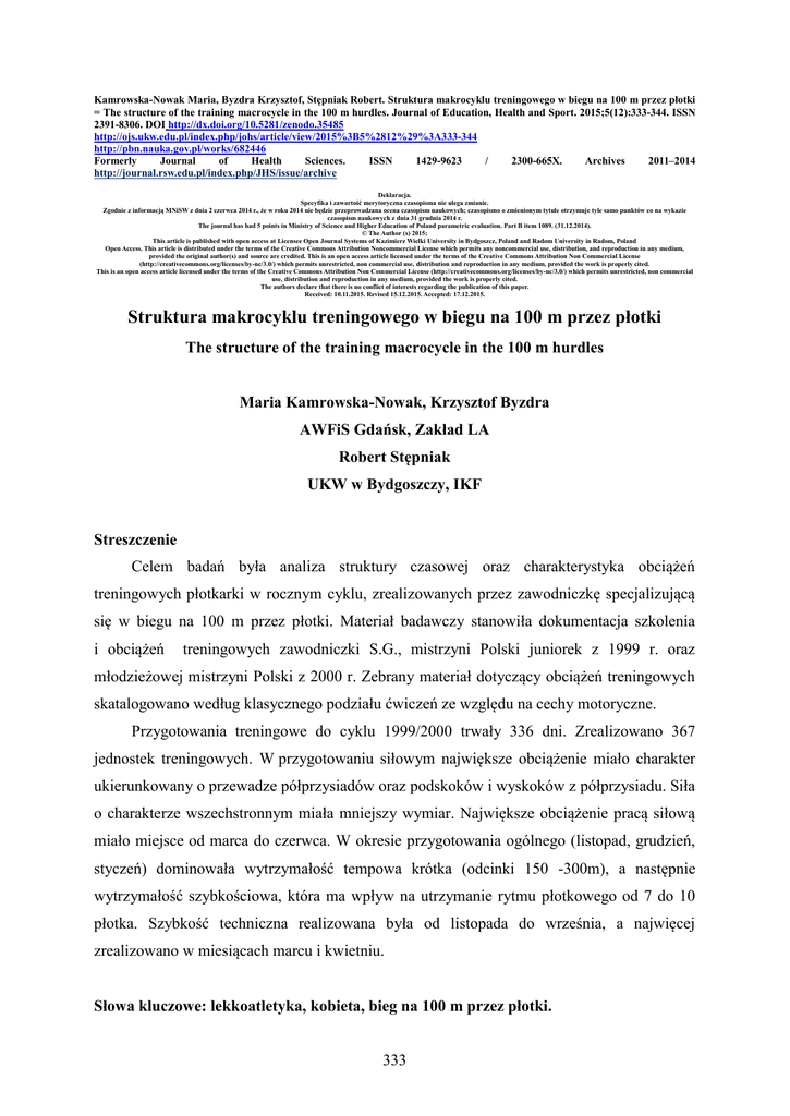 Kamrowska-Nowak Maria, Byzdra Krzysztof, Stępniak Robert. Struktura makrocyklu treningowego w biegu na 100 m przez płotki = The structure of the training macrocycle in the 100 m hurdles. Journal of Education, Health and Sport. 2015;5(12):333-344. ISSN 2391-8306. DOI http://dx.doi.org/10.5281/zenodo.35485 http://ojs.ukw.edu.pl/index.php/johs/article/view/2015%3B5%2812%29%3A333-344 http://pbn.nauka.gov.pl/works/682446 Formerly Journal of Health Sciences. ISSN 1429-9623 / 2300-665X. Archives 2011–2014 http://journal.rsw.edu.pl/index.php/JHS/issue/archive Deklaracja. Specyfika i zawartość merytoryczna czasopisma nie ulega zmianie. Zgodnie z informacją MNiSW z dnia 2 czerwca 2014 r., że w roku 2014 nie będzie przeprowadzana ocena czasopism naukowych; czasopismo o zmienionym tytule otrzymuje tyle samo punktów co na wykazie czasopism naukowych z dnia 31 grudnia 2014 r. The journal has had 5 points in Ministry of Science and Higher Education of Poland parametric evaluation. Part B item 1089. (31.12.2014). © The Author (s) 2015; This article is published with open access at Licensee Open Journal Systems of Kazimierz Wielki University in Bydgoszcz, Poland and Radom University in Radom, Poland Open Access. This article is distributed under the terms of the Creative Commons Attribution Noncommercial License which permits any noncommercial use, distribution, and reproduction in any medium, provided the original author(s) and source are credited. This is an open access article licensed under the terms of the Creative Commons Attribution Non Commercial License (http://creativecommons.org/licenses/by-nc/3.0/) which permits unrestricted, non commercial use, distribution and reproduction in any medium, provided the work is properly cited. This is an open access article licensed under the terms of the Creative Commons Attribution Non Commercial License (http://creativecommons.org/licenses/by-nc/3.0/) which permits unrestricted, non commercial use, distribution and reproduction in any medium, provided the work is properly cited. The authors declare that there is no conflict of interests regarding the publication of this paper. Received: 10.11.2015. Revised 15.12.2015. Accepted: 17.12.2015. Struktura makrocyklu treningowego w biegu na 100 m przez płotki The structure of the training macrocycle in the 100 m hurdles Maria Kamrowska-Nowak, Krzysztof Byzdra AWFiS Gdańsk, Zakład LA Robert Stępniak UKW w Bydgoszczy, IKF Streszczenie Celem badań była analiza struktury czasowej oraz charakterystyka obciążeń treningowych płotkarki w rocznym cyklu, zrealizowanych przez zawodniczkę specjalizującą się w biegu na 100 m przez płotki. Materiał badawczy stanowiła dokumentacja szkolenia i obciążeń treningowych zawodniczki S.G., mistrzyni Polski juniorek z 1999 r. oraz młodzieżowej mistrzyni Polski z 2000 r. Zebrany materiał dotyczący obciążeń treningowych skatalogowano według klasycznego podziału ćwiczeń ze względu na cechy motoryczne. Przygotowania treningowe do cyklu 1999/2000 trwały 336 dni. Zrealizowano 367 jednostek treningowych. W przygotowaniu siłowym największe obciążenie miało charakter ukierunkowany o przewadze półprzysiadów oraz podskoków i wyskoków z półprzysiadu. Siła o charakterze wszechstronnym miała mniejszy wymiar. Największe obciążenie pracą siłową miało miejsce od marca do czerwca. W okresie przygotowania ogólnego (listopad, grudzień, styczeń) dominowała wytrzymałość tempowa krótka (odcinki 150 -300m), a następnie wytrzymałość szybkościowa, która ma wpływ na utrzymanie rytmu płotkowego od 7 do 10 płotka. Szybkość techniczna realizowana była od listopada do września, a najwięcej zrealizowano w miesiącach marcu i kwietniu. Słowa kluczowe: lekkoatletyka, kobieta, bieg na 100 m przez płotki. 333 Summary The objective of the research was to analyze time structure and characteristics of training loads of the hurdler specializing in 100m hurdles realized in the annual training cycle. Training records and training loads of S.G. , the junior champion of Poland in 1999 and the youth champion of Poland in 2000, constituted research material. Material concerning training loads was catalogued according to classical division of exercises on account of motor features. Preparations for the training cycle 1999/2000 lasted 336 days, and 367 training units were carried out. In weight preparation the greatest load was task oriented with a predominance of half knee bends, jumps and a jump from half knee bands. Strength of versatile nature had minor dimension. The greatest loads of weight training took place between March and June. During general preparation (November, December, and January) a short pace endurance dominated (segments 150-300 m), and was followed by speed endurance; the latter having influence on keeping rhythm from 7 to 10 hurdles. Technical speed was realized between November and September and the greatest number of tasks was carried out in March and April. Keywords: athletics, woman, women's 100 m hurdles. Od wielu lat w sporcie zawodowym obserwuje się tendencję przyrostu wyników sportowych. Przełamywane są coraz bardziej niedostępne i uważane za niemożliwe do pokonania wyniki sportowe, które wyznaczają kres ludzkich możliwości. Przełamywanie takowych granic jest bez wątpienia zasługą współczesnego treningu, który jest procesem bardzo złożonym i skomplikowanym. Wymagającym wielu lat ciężkiej pracy zarówno od zawodnika jak i trenera. Na sukces jakim jest wynik sportowy składa się nie tylko talent i odpowiednie cechy wolicjonalne, ale co najważniejsze profesjonalnie kierowany trening sportowy. Projektowanie procesu treningowego jest jednym z podstawowych zadań trenera. Polega ono na wykonaniu szeregu kolejnych czynności, których efektem jest zbiór danych tworzących projekt cyklu treningowego. Zawiera on zestaw założeń, celów oraz środków, 334 które prowadzą do jego realizacji. Proje