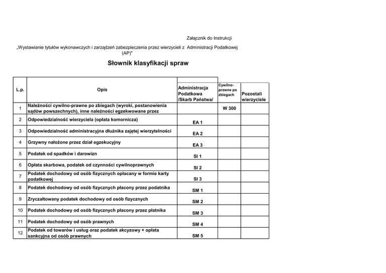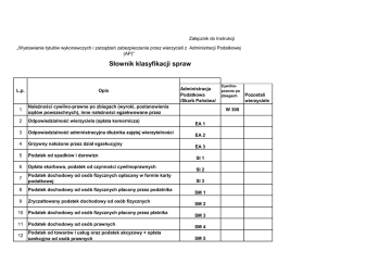 Załącznik do Instrukcji „Wystawianie tytułów wykonawczych i zarządzeń zabezpieczenia przez wierzycieli z Administracji Podatkowej (AP)" Słownik klasyfikacji spraw L.p. Opis 1 Należności cywilno-prawne po zbiegach (wyroki, postanowienia sądów powszechnych), inne należności egzekwowane przez 2 Odpowiedzialność wierzyciela (opłata komornicza) 3 Odpowiedzialność administracyjna dłużnika zajętej wierzytelności 4 Grzywny nałożone przez dział egzekucyjny 5 Podatek od spadków i darowizn 6 Opłata skarbowa, podatek od czynności cywilnoprawnych 7 Podatek dochodowy od osób fizycznych opłacany w formie karty podatkowej 8 Podatek dochodowy od osób fizycznych płacony przez podatnika 9 Zryczałtowany podatek dochodowy od osób fizycznych 10 Podatek dochodowy od osób fizycznych płacony przez płatnika 11 Podatek dochodowy od osób prawnych 12 Podatek od towarów i usług oraz podatek akcyzowy + opłata sankcyjna od osób prawnych Administracja Podatkowa /Skarb Państwa/ Cywilnoprawne po zbiegach W 300 EA 1 EA 2 EA 3 SI 1 SI 2 SI 3 SM 1 SM 2 SM 3 SM 4 SM 5 Pozostali wierzyciele 13 14 15 16 17 18 Podatek od towarów i usług oraz podatek akcyzowy + opłata sankcyjna od pozostałych podmiotów Inne podatki (pod. od gier,pod. import. od towarów nadsyłanych z zagranicy,pod. od ponadnorm. wzrostu wynagrodzeń,wpłaty z Inne podatki (pod. od gier,pod. import. od towarów nadsyłanych z zagranicy,pod. od ponadnorm. wzrostu wynagrodzeń,kary i Należności państw członkowskich (art. 10 Dyrektywy) Należności państw członkowskich (konwencja lub umowa międzynarodowa) Należności państw trzecich (konwencja lub umowa międzynarodowa) SM 6 SM 7 SM 8 EZ 1 EZ 2 EZ 3 19 Kary i opłaty (np. SPP zaj. pasa drogowego, inspekcje) W 255 20 Grzywny nakładane w formie mandatu karnego W 250 21 Inne należności (np. k. upomnienia, koszty egzekucyjne, koszty postępowania, koszty czynności, inne koszty, odszkodowania, nieuiszczone środki lub ich zwrot, inne nalezności) W 260