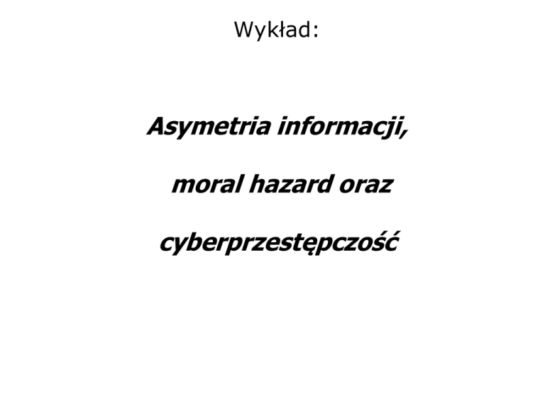 Wykład: Asymetria informacji, moral hazard oraz cyberprzestępczość Asymetria informacji Asymetria informacji – fakt, iż różne osoby dysponują różnymi danymi / wiadomościami. Asymetria informacji jest nie do uniknięcia, jej rozmiary i konsekwencje zależą od struktury rynku. Niedoskonałość informacji jest w gospodarce zjawiskiem powszechnym. Rynki, na których informacja nie jest doskonała, nie są efektywne. Źródło: J.Stiglitz, Informacja i zmiana paradygmatu w ekonomii, 2004. William Vickrey (1914 - 1996) James Mirrlees (ur. 1936) Nagroda Nobla (1996) "for their fundamental contributions to the economic theory of incentives under asymmetric information" Joseph Stiglitz (ur. 1943) George Akerlof (ur. 1940) Michael Spence (ur. 1943) Nagroda Nobla (2001) "for analyses of markets with asymmetric information" Asymetria informacji - rynek samochodów używanych INFORMACJE KUPUJĄCY SPRZEDAJĄCY CENY TRANSAKCYJNE najczęściej średnie i niskie LICZBA TRANSAKCJI wyraźnie mniejsza niż przy równym dostępie do informacji EFEKTYWNOŚĆ RYNKU ograniczona WIELE OSÓB NIEZADOWOLONYCH; NABYWCÓW ZNAJDUJĄ NAJGORSZE PRODUKTY Asymetria informacji na rynku ubezpieczeń Zakład ubezpieczeniowy nie jest w stanie śledzić stopnia uzależnienia od papierosów, który ma negatywny wpływ na zdrowie. Osoby, które są najmniej narażone na wypadek, mogą się nie zdecydować na wykupienie polisy. Źródło: J.Stiglitz, Informacja i zmiana paradygmatu w ekonomii, 2004. Asymetria informacji - rynek ubezpieczeń na życie INFORMACJE UBEZPIECZYCIEL UBEZPIECZONY CENY UBEZPIECZEŃ rosną LICZBA TRANSAKCJI maleje EFEKTYWNOŚĆ RYNKU ograniczona Z UBEZPIECZEŃ REZYGNUJĄ OSOBY NAJZDROWSZE; FIRMY UBEZPIECZENIOWE ZACZYNAJĄ PONOSIĆ STRATY Wartość rynku kredytów dla MSP Okres Kredyty dla dużych firm (w mld PLN) Kredyty dla sektora MSP (w mld PLN) VIII 2009 100,3 127,4 VIII 2010 95,4 125,9 VIII 2011 101,0 142,6 VIII 2012 108,4 166,1 VIII 2013 114,9 166,7 Źródło: NBP. Kredyty z utratą wartości – MSP oraz firmy duże Okres Kredyty z utratą wartości dla dużych firm (w mld PLN) % ogółu kredytów Kredyty z utratą wartości dla sektora MSP (w mld PLN) % ogółu kredytów VIII 2009 7,9 7,9% 13,9 10,9% VIII 2010 9,0 9,4% 17,8 14,1% VIII 2011 8,0 7,9% 18,6 13,0% VIII 2012 10,1 9,3% 20,3 12,2% VIII 2013 10,8 9,4% 22,0 13,2% Źródło: NBP. Wysokość oprocentowania nowych kredytów Okres Kredyty o wartości do 1 mln PLN Kredyty o wartości powyżej 4 mln PLN Kredyty dla przedsiębiorców indywidualnych VIII 2010 6,4% 6,3% 8,1% VIII 2011 6,7% 6,8% 8,7% VIII 2012 7,0% 6,5% 9,3% VIII 2013 4,5% 4,6% 7,0% Źródło: NBP. Liczba przestępstw związanych z dokumentami Łączna liczba i kwota udaremnionych prób wyłudzeń kredytów Wyłudzanie kredytów Siedem osób podejrzanych o wyłudzanie kredytów i pożyczek ujęli funkcjonariusze ABW. Zatrzymani byli członkami grupy, która - za pomocą fałszywych dokumentów i podstawionych osób - oszukała 12 banków działających na Pomorzu. Straty oceniono na 9,5 mln zł. Ujętym osobom prokuratura przedstawiła zarzuty m.in. współudziału w wyłudzaniu kredytów i pożyczek, fałszowania dokumentacji księgowej oraz działania w zorganizowanej grupie przestępczej. Każdej z tych osób grozi do 10 lat więzienia. Dwoje z pięciu zatrzymanych tymczasowo aresztowano, a pozostałe pięć osób wypuszczono za poręczeniem majątkowym w wysokości do 200 tys. zł i z zakazem opuszczania kraju. Podczas zatrzymań, w jednym z przeszukiwanych pomieszczeń, funkcjonariusze odkryli drukarnię, w której fałszowano niezbędne do przestępczego procederu dokumenty. Znaleziono w niej nie tylko podrobione dowody osobiste, paszporty i akty notarialne, ale również znaczną liczbę fałszywych pieczęci organów skarbowych, ZUS oraz banków, a także telefony komórkowe i elektroniczne nośniki danych. Udział sektora MSP w tworzeniu miejsc pracy Źródło: PARP. Korzyści osób posiadających dostęp do informacji Posiadanie informacji może mieć skutki redystrybucyjne: zyski tych, którzy dysponują informacją, mogą być osiągane kosztem pozostałych. Źródło: J.Stiglitz, Informacja i zmiana paradygmatu w ekonomii, 2004. Zachowania menedżerów w warunkach asymetrii informacji Menedżerowie mogą podejmować działania nastawione na realizację własnych interesów kosztem interesów udziałowców. Właściciele nie tylko nie są w stanie monitorować swoich pracowników i menedżerów, ale z uwagi na asymetrię informacji zazwyczaj nie wiedzą nawet, co ci ludzie, którzy działają w ich imieniu, powinni robić. Skłonność „swoich” (osób zaangażowanych w przedsiębiorstwie) do sprzedaży papierów wartościowych własnego przedsiębiorstwa po określonych cenach, zawiera informację o ich poglądzie na temat faktycznej wartości tych papierów. Źródło: J.Stiglitz, Informacja i zmiana paradygmatu w ekonomii, 2004. Greed is Good ! Michael Douglas w filmie „Wall Street” jako Gordon Gekko Pokusa nadużycia Pokusa nadużycia (moral hazard) w swojej pierwotnej formie wywodzi się z rynku ubezpieczeń. Zakłada, że w warunkach zabezpieczenia, podmiot podejmuje się bardziej ryzykownych działań, aniżeli w przypadku jego braku. Pokusa nadużycia wiąże się nierozerwalnie z występowaniem asymetrii informacji. Na poziomie korporacji pokusa nadużycia może prowadzić do ryzykownych działań, mających na celu wzrost wartości akcji w krótkim okresie. W relacjach pomiędzy pożyczkodawcą a pożyczkobiorcą zjawisko to definiowane jest jako prawdopodobieństwo podjęcia działań przez pożyczkobiorcę, które będą komplikowały możliwość spłaty zadłużenia. Problem pryncypała i agenta Właściciele majątków przedsiębiorstw i zarządzający nimi to zupełnie inne osoby. Interesy obu grup zazwyczaj pozostają rozbieżne. W przypadku własności majątkowej, charakterystyczne jest jej rozproszenie wśród wielu akcjonariuszy, 