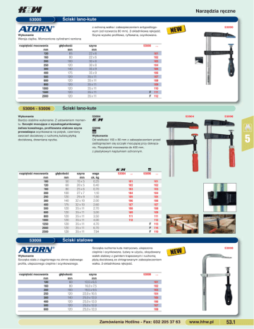 ß 53000 Narzędzia ręczne Ściski lano-kute 0 Wykonanie Wersja ciężka. Wzmocnione cylindrami ramiona rozpiętość mocowania mm 120 160 200 250 300 400 500 600 800 1000 1500 2000 53004 - 53006 głębokość mm 65 80 100 120 140 175 120 120 120 120 120 120 szyna mm 22 x 6 22 x 6 30 x 8 30 x 8 35 x 9 35 x 9 35 x 11 35 x 11 35 x 11 35 x 11 35 x 11 35 x 11 53008 głębokość mm 50 60 80 100 120 140 175 120 120 120 120 120 120 120 … 101 102 103 104 105 106 107 108 109 110 F 111 F 112 szyna mm 15 x 5 20 x 5 25 x 6 27 x 7 29 x 9 32 x 10 32 x 10 35 x 11 35 x 11 35 x 11 35 x 11 35 x 11 35 x 11 35 x 11 53004 53004 ß 53006 53006 $ 5 Wykonanie Od wielkości 160 x 80 mm z zabezpieczeniem przed ześlizgnięciem się szczęki mocującej przy dokręcaniu. Rozpiętość mocowania do 400 mm, z plastykowym kapturkiem ochronnym. waga ok. kg 0,25 0,40 0,70 1,10 1,50 2,00 2,60 2,70 3,00 3,50 4,00 4,70 6,70 7,94 ß 53004 … 101 102 103 104 105 106 107 108 109 111 112 $ 53006 … 101 102 103 104 105 106 107 108 109 111 112 F 113 F 116 F 119 Ściski stalowe 0 Wykonanie Szczęka stała z ciągnionego na zimno stalowego profila, ulepszonego cieplnie i ocynkowanego. rozpiętość mocowania mm 120 160 200 250 300 400 500 600 53000 Ściski lano-kute Wykonanie Bardzo stabilne wykonanie. Z ustawieniem momentu. Szczęki mocujące z wysokogatunkowego żeliwa kowalnego, profilowana stalowa szyna prowadząca ocynkowana na połysk, czerniony sworzeń dociskowy z ruchomą kulistą płytką dociskową, drewniana rączka. rozpiętość mocowania mm 100 120 160 200 250 300 400 500 600 800 1000 1250 2000 2500 53000 z ochroną wałka i zabezpieczeniem antypoślizgowym (od rozwarcia 80 mm). 2-składnikowa rękojeść. Szyna wysoko profilowa, ryflowana, ocynkowana. głębokość mm 60 80 100 120 140 120 120 120 53008 Szczęka ruchoma kuta matrycowo, ulepszona cieplnie i ocynkowana. Łatwy w użyciu, oksydowany wałek stalowy z gwintem trapezowym i ruchomą płytą dociskową ze zintegrowanym zabezpieczeniem wałka. 2-składnikowa rękojeść. szyna mm 13,5 x 6,5 16,0 x 7,5 19,5 x 9,5 22,0 x 10,5 25,0 x 12,0 25,0 x 12,0 25,0 x 12,0 25,0 x 12,0 53008 … 101 102 103 104 105 106 107 108 Zamówienia Hotline - Fax: 032 205 37 63 www.hhw.pl 53.1 • Ściski • Ściski sprężynowe • Ściski dźwigniowe 53010 Ściski stalowe $ mu przeniesieniu mocy na szczęce ruchomej. Ulepszone cieplnie szczęki stała i ruchoma gwarantują sprężynujący i elastyczny zacisk. Ergonomicznie ukształtowana rękojeść z drewna. Zastosowanie Do sił docisku do 5 kN. Wykonanie Dzięki optymalizacji profila szyny uzyskano o 20% więcej siły mocującej na obrót wałka. Maksymalne zabezpieczenie dzięki prosto liniowe rozpiętość mocowania mm 100 120 160 200 250 300 400 500 600 800 1000 1250 53012 głębokość mm 60 60 80 100 120 140 120 120 120 120 120 120 szyna mm 15,0 x 6,0 15,0 x 6,0 17,5 x 6,8 22,0 x 8,5 24,5 x 9,5 28,0 x 11,0 28,0 x 11,0 28,0 x 11,0 28,0 x 11,0 28,0 x 11,0 28,0 x 11,0 28,0 x 11,0 53013 głębokość mm 100 100 szyna mm 19,5 x 9,5 19,5 x 9,5 DuoKlamp Wykonanie Softpads umożliwiają ostrożne zaciskanie detali, przełączane na zaciskanie i rozpieranie. Szczęki mocujące i korpus z udarnego i wytrzymałego poliamidu wzmocnionego włóknem szklanym. 53014 głębokość mm 85 85 85 85 … 101 102 Gałka obrotowa służy do łatwego przełączania pomiędzy zaciskaniem a rozpieraniem, ergonomicznie ukształtowana dźwignia pompująca z superpoliamidu. Dźwignia luzująca do luzowania i do szybkiego przestawiania, szyna z ciągnionej stali precyzyjnej, hartowana powierzchniowo i czerniona. Zastosowanie Do 1200 N siły zacisku i rozpierania. szyna mm 20 x 5 20 x 5 20 x 5 20 x 5 Vario Clippix Wykonanie Szyna regulowana w statycznie zoptymalizowanym profilu E z blokada cylindrów gwarantuje dokładne ustawienie ramienia mocującego. Ruchome ramię 53.2 53012 waga kg 0,66 0,72 0,83 1,02 53013 53013 … 101 102 103 104 Ściski sprężynowe $ rozpiętość mocowania mm 55 100 waga ok. kg 1,25 1,70 53012 Ściski $ rozpiętość mocowania mm 160 300 450 650 201 202 203 204 205 206 207 208 209 210 211 F 212 Zastosowanie Szybkie mocowanie jedną ręką, mocny zacisk z wałkiem o trapezowym gwincie, siła mocowania do 5000 N. Ergonomiczny przycisk zwalniający do lekkiego przesuwania ruchomej szczęki. Szczególnie przydatne w pracach pod stropem czy przy przedmiotach sprężynujących lub mocno poddających się. Wykonanie Szczęka stała i ruchoma ze stali ulepszanej cieplnie, ocynkowane galwanicznie. Obudowa i dźwignia z poliamidu wzmocnionego włóknem szklanym. Nowego rodzaju kapturki ochronne z elastycznego tworzywa. rozpiętość mocowania mm 300 600 … Ściski jednoręczne $ 5 53010 53010 głębokość mm 37 50 www.hhw.pl mocujące z superpoliamidu, lekko i szybko przestawne. Ergonomicznie uformowane uchwyty z dwóch składników z wkładkami z miękkiego materiału. Softpads zapewniają ostrożne i bezpieczne zaciskanie. Stabilne powłoki chwytne z superpoliamidu, z krzyżowym użebrowaniem dla największej stabilności. waga ok. g 70 170 53014 … 101 102 Zamówienia Hotline - Fax: 032 205 37 63 53014 ß 53015 Narzędzia ręczne Ściski stalowe dźwigniowe $ Wykonanie Dzięki optymalizacji profila szyny uzyskano większe rezerwy siły służące do równomiernego rozłożenia siły mocowania, w szczególności przy pełnym wykorzystaniu rozwarcia. Szczęka stała i ruchoma ze stali ulepszanej cieplnie, ocynkowane galwanicznie. Dźwignia dociskowa pokryta powłoka z tworzywa sztucznego, z zabezpieczeniem rozpiętość mocowania mm 160 200 250 300 400 500 53020 głębokość mm 80 100 120 140 120 120 Uwaga: Odblokowanie ścisku poprzez pociągnięcie dźwigni. Zacisk daje się teraz łatwo zwolnić. szyna mm 17,5 x 6,8 22,0 x 8,5 24,5 x 9,5 28,0 x 11,0 28,0 x 11,0 28,0 x 11,0 53015 … 102 103 104 105 106 107 głębokość mm 80 80 80 80 53020 wany ochronny kapturek z tworzywa sztucznego i uchylna płyta naciskowa gwarantuj