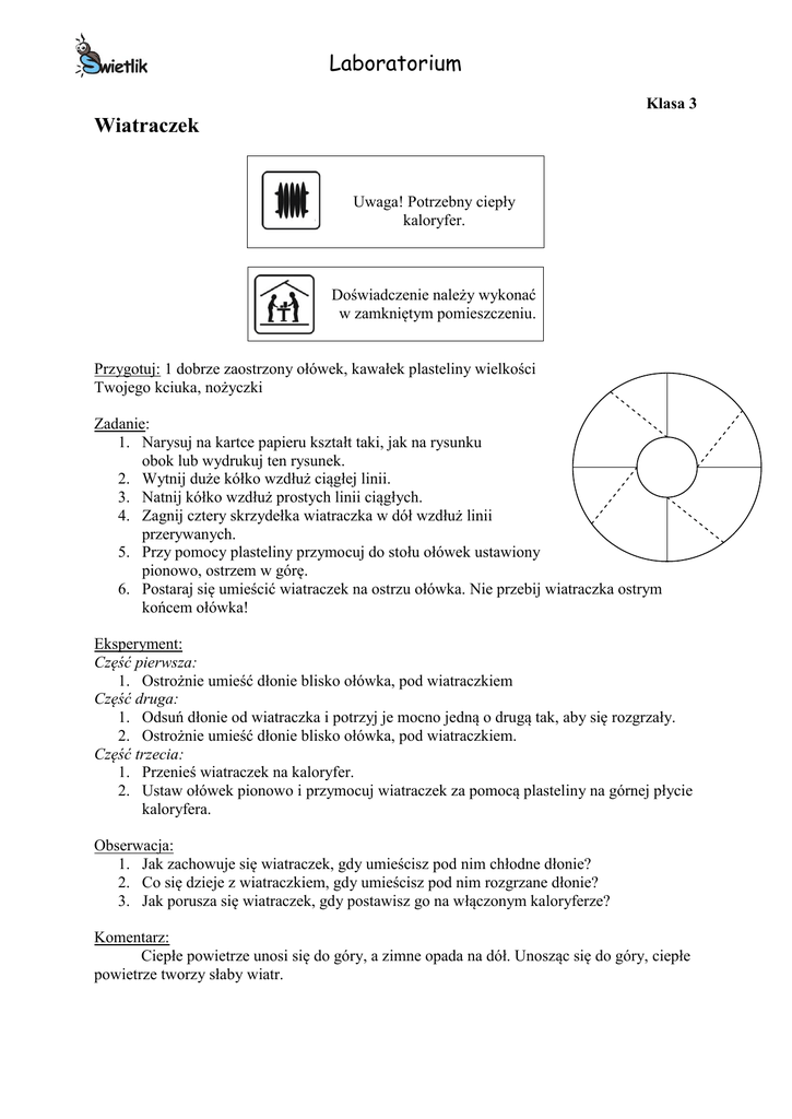 Laboratorium Klasa 3 Wiatraczek Uwaga! Potrzebny ciepły kaloryfer. Doświadczenie należy wykonać w zamkniętym pomieszczeniu. Przygotuj: 1 dobrze zaostrzony ołówek, kawałek plasteliny wielkości Twojego kciuka, nożyczki Zadanie: 1. Narysuj na kartce papieru kształt taki, jak na rysunku obok lub wydrukuj ten rysunek. 2. Wytnij duże kółko wzdłuż ciągłej linii. 3. Natnij kółko wzdłuż prostych linii ciągłych. 4. Zagnij cztery skrzydełka wiatraczka w dół wzdłuż linii przerywanych. 5. Przy pomocy plasteliny przymocuj do stołu ołówek ustawiony pionowo, ostrzem w górę. 6. Postaraj się umieścić wiatraczek na ostrzu ołówka. Nie przebij wiatraczka ostrym końcem ołówka! Eksperyment: Część pierwsza: 1. Ostrożnie umieść dłonie blisko ołówka, pod wiatraczkiem Część druga: 1. Odsuń dłonie od wiatraczka i potrzyj je mocno jedną o drugą tak, aby się rozgrzały. 2. Ostrożnie umieść dłonie blisko ołówka, pod wiatraczkiem. Część trzecia: 1. Przenieś wiatraczek na kaloryfer. 2. Ustaw ołówek pionowo i przymocuj wiatraczek za pomocą plasteliny na górnej płycie kaloryfera. Obserwacja: 1. Jak zachowuje się wiatraczek, gdy umieścisz pod nim chłodne dłonie? 2. Co się dzieje z wiatraczkiem, gdy umieścisz pod nim rozgrzane dłonie? 3. Jak porusza się wiatraczek, gdy postawisz go na włączonym kaloryferze? Komentarz: Ciepłe powietrze unosi się do góry, a zimne opada na dół. Unosząc się do góry, ciepłe powietrze tworzy słaby wiatr. Laboratorium Twoje dłonie są małymi grzejnikami, ogrzewającymi powietrze dookoła. Jeśli ułożysz dłonie pod lekkim wiatraczkiem, to unoszące się do góry ogrzane powietrze będzie go obracać. Ruch powietrza jest tym szybszy, im większa jest różnica między temperaturą pomieszczenia, a temperaturą grzejnika. Ponieważ kaloryfer jest znacznie cieplejszy niż Twoje dłonie, to powoduje on szybszy ruch powietrza, dlatego wiatraczek najszybciej kręci się nad kaloryferem. Uwaga! Jeżeli wiatraczek nie kręci się pod wpływem Twoich rozgrzanych rąk, przenieś go do chłodniejszego pomieszczenia. Spowoduje to zwiększenie różnicy temperatur pomiędzy otoczeniem a Twoimi dłońmi i przyspieszy ruch ciepłego powietrza pionowo w górę.