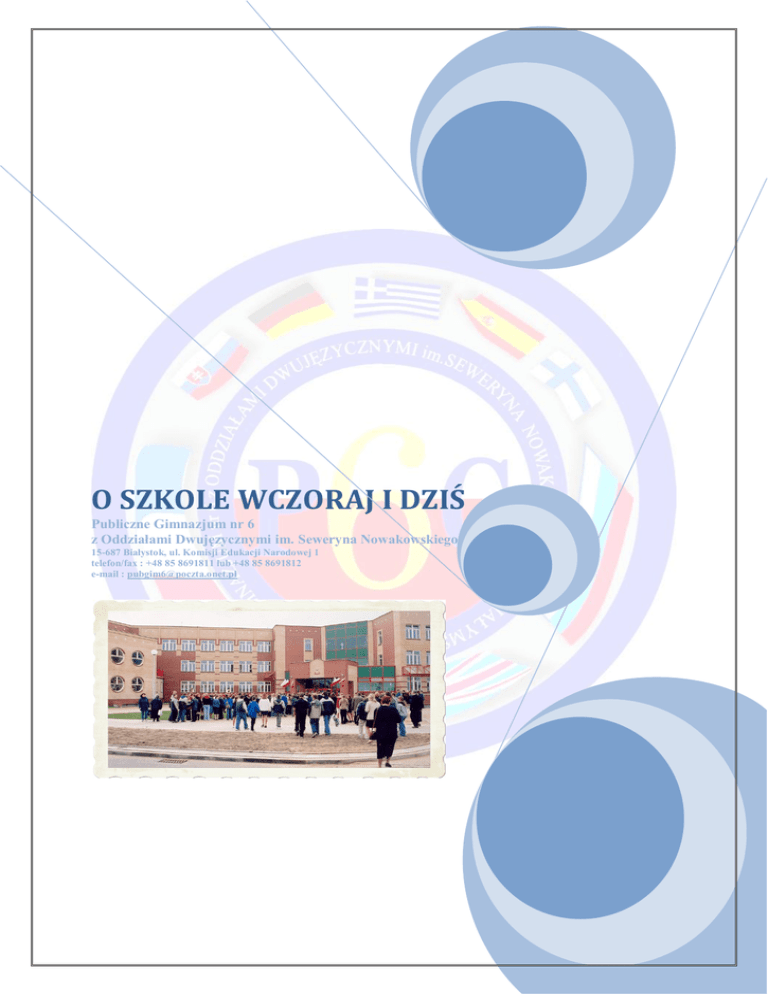 O SZKOLE WCZORAJ I DZIŚ Publiczne Gimnazjum nr 6 z Oddziałami Dwujęzycznymi im. Seweryna Nowakowskiego 15-687 Białystok, ul. Komisji Edukacji Narodowej 1 telefon/fax : +48 85 8691811 lub +48 85 8691812 e-mail : [email protected] P UBLICZNE G IMNAZJUM NR 6 Z O DDZIAŁAMI DWUJĘZYCZNYMI IM . SEWERYNA N OWAKOWSKIEGO 15-687 B IAŁYSTOK , UL . K OMISJI E DUKACJI NARODOWEJ 1 TELEFON / FAX : +48 85 8691811 LUB +48 85 8691812 E - MAIL : PUBGIM6@POCZTA . ONET . PL -------------------------------------------------------------------------------------------------------------------------------------- O SZKOLE WCZORAJ I DZIŚ Do 2002 r. uczniowie i nauczyciele naszej szkoły pracowali w budynku Szkoły Podstawowej nr 16 przy ul. Strażackiej.15 grudnia 2001 roku odbyła się uroczystość wmurowania i poświęcenia kamienia węgielnego pod budowę gimnazjum, a pod koniec sierpnia 2002 r. w nowym budynku odbyło się pierwsze posiedzenie Rady Pedagogicznej, które otworzyła pani Anna Małgorzata Płońska, ówczesna dyrektor. Od 1 września 2002 r. rozpoczęły się regularne zajęcia w obecnym budynku. Do dyspozycji uczniów oddano powierzchnię 5 000 m2, na której znajduje się między innymi 26 sal lekcyjnych, 2 pracownie informatyczne oraz biblioteka z czytelnią multimedialną. Sale do nauki języków obcych wyposażone są w sprzęt audiowizualny, zaś każde stanowisko uczniowskie w słuchawki i mikrofon, co pozwala prowadzić naukę języków metodami laboratoryjnymi. W roku szkolnym 2006/2007 stanowisko dyrektora szkoły obejmuje pan Wiesław Paniczko.14 lutego 2007 r. zostaje oddana do użytku nowa, pełnowymiarowa hala sportowa, w której jednocześnie mogą odbywać się zajęcia wychowania fizycznego w kilku grupach. Nauczyciele prowadzą również zajęcia w innych salach bloku sportowego, korzystają z siłowni, sali ping – pongowej czy do gimnastyki korekcyjnej. Niewątpliwie nowością jest utworzenie grupy sportowej o profilupiłki ręcznej. 1 kwietnia 2007 r. placówce nadano nazwę Publicznego Gimnazjum nr 6 z Oddziałami Dwujęzycznymi. Uczniowie mają do wyboru następujące języki: angielski, francuski i rosyjski. Naszą P UBLICZNE G IMNAZJUM NR 6 Z O DDZIAŁAMI DWUJĘZYCZNYMI IM . SEWERYNA N OWAKOWSKIEGO 15-687 B IAŁYSTOK , UL . K OMISJI E DUKACJI NARODOWEJ 1 TELEFON / FAX : +48 85 8691811 LUB +48 85 8691812 E - MAIL : PUBGIM6@POCZTA . ONET . PL -------------------------------------------------------------------------------------------------------------------------------------- dumą są klasy dwujęzyczne z wiodącym językiem francuskim. Od klasy drugiej lekcje historii i biologii prowadzone są częściowo w języku francuskim. Na uwagę zasługują liczne sukcesy uczniów w konkursach językowych. Nauczanie dwujęzyczne odbywa się przy współpracy Ambasady Francji, która wspólnie z Centralnym Ośrodkiem Doskonalenia Nauczycieli organizuje staże dydaktyczne dla nauczycieli języka francuskiego i przedmiotów niejęzykowych, prowadzone przez ekspertów francuskich. Nauczyciele z naszej szkoły uczestniczyli w szkoleniach i kursach doskonalących na terenie Francji. Należy podkreślić, że młodzież rozwija swoje umiejętności językowe w różnych formach aktywności. W roku szkolnym 2005/2006 jedna z klas uczestniczyła w Ogólnopolskim Konkursie na fot opowieść o przygodzie Mikołajka i zajęła I miejsce. Nagrodą był wyjazd do Warszawy na obchody Dnia Frankofonii. Rok później ta sama klasa wzięła udział w projekcie multimedialnym o mieście Lyon we Francji. W ubiegłym roku po raz pierwszy zorganizowaliśmy miejski konkurs kolęd śpiewanych w różnych językach, który cieszył się ogromnym zainteresowaniem. Od kilku lat nasza szkoła współpracuje ze szkołami we Francji, Włoszech oraz na Litwie. W 2003 r. gościliśmy Dyrekcję Liceum im. Charlesa de Gaulle`a z Dijon (Francja). Od dwóch lat korespondujemy też z uczniami z Włoch, którzy podobnie jak my uczą się języka francuskiego w szerszym wymiarze godzin. Intensywne kontakty utrzymywane są ze Szkołą Średnią im. Juliusza Słowackiego w Bezdanach na Litwie. Tradycją jest coroczna wymiana grup uczniów wraz z opiekunami. Nasi uczniowie zwiedzają Wileńszczyznę oraz uczestniczą w uroczystościach patriotycznych. Młodzi rodacy z Litwy poznają język i kulturę swoich przodków. P UBLICZNE G IMNAZJUM NR 6 Z O DDZIAŁAMI DWUJĘZYCZNYMI IM . SEWERYNA N OWAKOWSKIEGO 15-687 B IAŁYSTOK , UL . K OMISJI E DUKACJI NARODOWEJ 1 TELEFON / FAX : +48 85 8691811 LUB +48 85 8691812 E - MAIL : PUBGIM6@POCZTA . ONET . PL -------------------------------------------------------------------------------------------------------------------------------------- Bez wątpienia umożliwia im to również pobyt w domach naszych uczniów. Uczniowie PG nr 6 co roku zostają finalistami i laureatami konkursów o zasięgu ogólnopolskim oraz konkursów przedmiotowych organizowanych przez Podlaskiego Kuratora Oświaty. Niewątpliwie przyczynia się do tego istnienie zajęć pozalekcyjnych. Młodzi ludzie mają do dyspozycji koła: chemiczne, ekologiczne, historyczne, matematyczne, polonistyczne, fizyczne, teatralne („Athelie Theater”). Wielką popularnością cieszą się zajęcia sportowo-rekreacyjne. Uczniowie chętnie biorą udział w różnych zawodach sportowych, osiągając liczne sukcesy. Nie do przecenienia jest rola wychowawców, pedagoga i psychologa, którzy oferują swoją pomoc wszystkim potrzebującym. Uczniowie mają możliwość skorzystania z różnych form terapii, warsztatów i konsultacji. Znaczącą rolę odgrywa działalność opiekuńczo-wychowawcza prowadzona przez pracowników szkolnego klubu „Gimbuś”. W trosce o wszechstronny rozwój młodego człowieka i wychowanie patriotyczne oferujemy ciekawe wyjazdy, spotkania z ludźmi świata, kultury i sportu. Corocznie, w listopadzie, organizujemy Bieg Niepodległości, w którym uczestniczą uczniowie i dorośli w różnych kateg