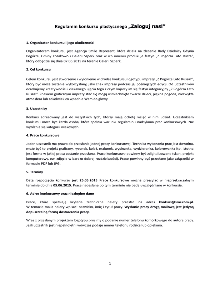 Regulamin konkursu plastycznego „Zaloguj nas!” 1. Organizator konkursu i jego okoliczności Organizatorem konkursu jest Agencja Smile Reprezent, która działa na zlecenie Rady Dzielnicy Gdynia Pogórze, Gminy Kosakowo i Galerii Szperk oraz w ich imieniu produkuje festyn „Z Pogórza Lato Rusza”, który odbędzie się dnia 07.06.2015 na terenie Galerii Szperk. 2. Cel konkursu Celem konkursu jest stworzenie i wyłonienie w drodze konkursu logotypu imprezy „Z Pogórza Lato Rusza!”, który być może zostanie wykorzystany, jako znak imprezy podczas jej późniejszych edycji. Od uczestników oczekujemy kreatywności i ciekawego ujęcia tego z czym kojarzy im się festyn integracyjny „Z Pogórza Lato Rusza!”. Znakiem graficznym imprezy stać się mogą uśmiechnięte twarze dzieci, piękna pogoda, niezwykła atmosfera lub cokolwiek co wpadnie Wam do głowy. 3. Uczestnicy Konkurs adresowany jest do wszystkich tych, którzy mają ochotę wziąć w nim udział. Uczestnikiem konkursu może być każda osoba, która spełnia warunki regulaminu nadsyłania prac konkursowych. Nie wyróżnia się kategorii wiekowych. 4. Prace konkursowe Jeden uczestnik ma prawo do przesłania jednej pracy konkursowej. Technika wykonania prac jest dowolna, może być to projekt graficzny, rysunek, kolaż, malunek, wycinanka, wydzieranka, kolorowanka itp. Istotna jest forma w jakiej praca zostanie przesłana. Prace konkursowe powinny być zdigitalizowane (skan, projekt komputerowy, ew. zdjęcie w bardzo dobrej rozdzielczości). Prace powinny być przesłane jako załączniki w formacie PDF lub JPG. 5. Terminy Datą rozpoczęcia konkursu jest 25.05.2015 Prace konkursowe można przesyłać w nieprzekraczalnym terminie do dnia 05.06.2015. Prace nadesłane po tym terminie nie będą uwzględniane w konkursie. 6. Adres konkursowy oraz niezbędne dane Prace, które spełniają kryteria techniczne należy przesłać na adres [email protected]. W temacie maila należy wpisać: nazwisko, imię i tytuł pracy. Wysłanie pracy drogą mailową jest jedyną dopuszczalną formą dostarczenia pracy. Wraz z przesłanym projektem logotypu prosimy o podanie numer telefonu komórkowego do autora pracy. Jeśli uczestnik jest niepełnoletni wówczas podaje numer telefonu rodzica lub opiekuna. 1 Regulamin konkursu plastycznego „Zaloguj nas!” 7. Wyniki Wyniki konkursu zostaną ogłoszone dnia 06.06.2015 w czasie imprezy „Z Pogórza Lato Rusza!” oraz na stronach internetowych: www.gdynia-pogorze.info, www.galeriaszperk.com, www.kosakowo.pl. Nagrodzone i wyróżnione prace zostaną zaprezentowane na ekranie LED w czasie festynu w niedzielę 07.06.2015. Organizator zastrzega sobie prawo do skontaktowania się wyłącznie z osobami, które wygrały konkurs. 8. Nagrody Organizator przewiduje przyznanie trzech nagród głównych oraz dopuszcza przyznanie wyróżnień. Nagrody zostaną uroczyście wręczone w dniu imprezy 07.06.2015. Organizator poinformuje zwycięzców o godzinie wręczenia nagród drogą mailową. 9. Jury Prace konkursowe oceni jury składające się z organizatorów konkursu oraz przedstawicieli: Rady Dzielnicy Gdynia Pogórze, Gminy Kosakowo oraz Galerii Szperk. Decyzje Jury są ostateczne. 10. Kryteria wyboru Prace muszą być wykonane osobiście przez autorów i zgodne z tematem konkursu. Głównymi kryteriami oceny będzie oryginalność, kompozycja, indywidualne ujęcie tematu, a także ogólna estetyka wykonania. Prace niespełniające wymogów technicznych nie będą brane pod uwagę. 11. Inne postanowienia organizatorów a) Przesłane pliki nie będą zwracane. Z chwilą nadesłania, nagrodzone projekty przechodzą na własność organizatorów, którzy przejmują do nich prawa do dysponowania, tym samym mają prawo do ich późniejszego wykorzystania na wszelkich polach eksploatacji, przy jednoczesnym zachowaniu autorstwa osoby, kóra wykonała projekt. b) Organizatorzy nie przewidują sprzedawania prac, ale roszczą sobie prawa do wykorzystania ich w celach reklamowych i promocyjnych po zakończeniu trwania konkursu. c) Ostateczna interpretacja regulaminu należy do organizatora. d) Wysłanie pracy konkursowej jest jednoznaczne z akceptacją postanowień regulaminu i wyrażeniem zgody na udostępnienie publiczne pracy wraz z ujawnieniem imienia i nazwiska autora. e) Wszelkie informacje dotyczące konkursu można uzyskać pod adresem [email protected] f) W przypadku udziału osoby niepełnoletniej konieczna jest zgoda opiekuna prawnego. g) Praca konkursowa nie może naruszać dobrego imienia osób trzecich oraz praw autorskich, a także norm społecznych oraz zasad etycznych i moralnych. h) Udział w konkursie jest dobrowolny i bezpłatny. 2