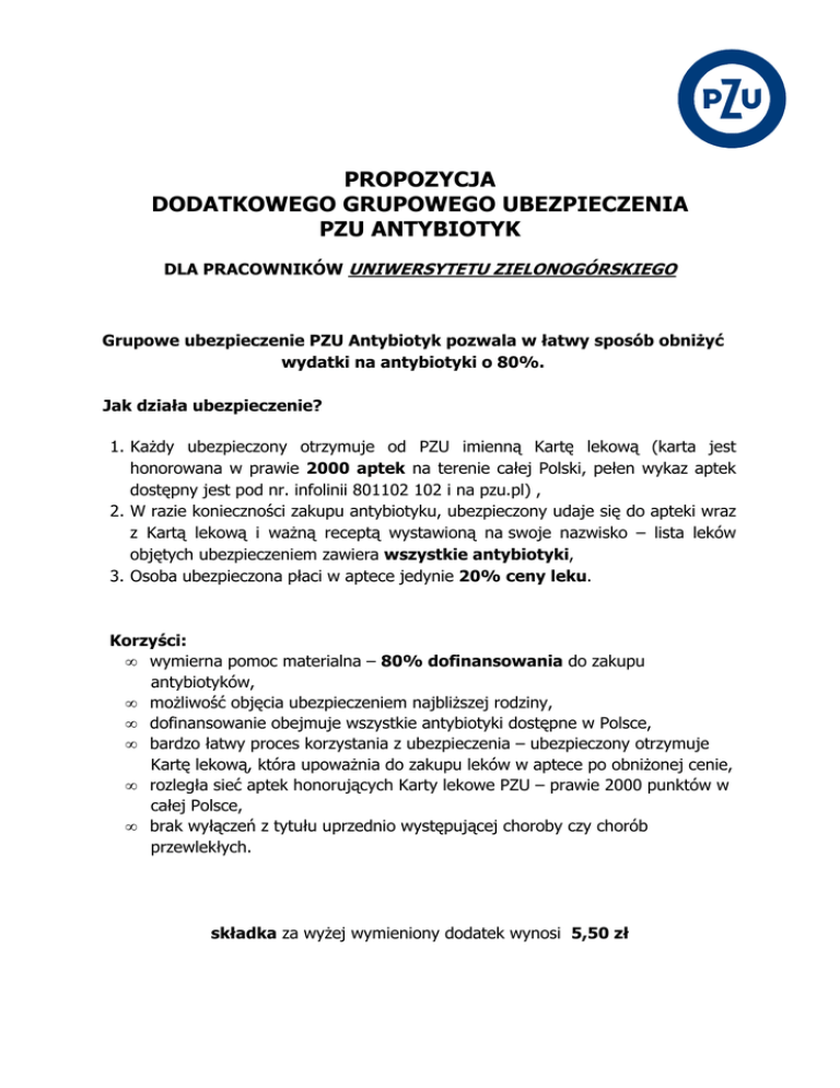 PROPOZYCJA DODATKOWEGO GRUPOWEGO UBEZPIECZENIA PZU ANTYBIOTYK DLA PRACOWNIKÓW UNIWERSYTETU ZIELONOGÓRSKIEGO Grupowe ubezpieczenie PZU Antybiotyk pozwala w łatwy sposób obniżyć wydatki na antybiotyki o 80%. Jak działa ubezpieczenie? 1. Każdy ubezpieczony otrzymuje od PZU imienną Kartę lekową (karta jest honorowana w prawie 2000 aptek na terenie całej Polski, pełen wykaz aptek dostępny jest pod nr. infolinii 801102 102 i na pzu.pl) , 2. W razie konieczności zakupu antybiotyku, ubezpieczony udaje się do apteki wraz z Kartą lekową i ważną receptą wystawioną na swoje nazwisko – lista leków objętych ubezpieczeniem zawiera wszystkie antybiotyki, 3. Osoba ubezpieczona płaci w aptece jedynie 20% ceny leku. Korzyści: • wymierna pomoc materialna – 80% dofinansowania do zakupu antybiotyków, • możliwość objęcia ubezpieczeniem najbliższej rodziny, • dofinansowanie obejmuje wszystkie antybiotyki dostępne w Polsce, • bardzo łatwy proces korzystania z ubezpieczenia – ubezpieczony otrzymuje Kartę lekową, która upoważnia do zakupu leków w aptece po obniżonej cenie, • rozległa sieć aptek honorujących Karty lekowe PZU – prawie 2000 punktów w całej Polsce, • brak wyłączeń z tytułu uprzednio występującej choroby czy chorób przewlekłych. składka za wyżej wymieniony dodatek wynosi 5,50 zł