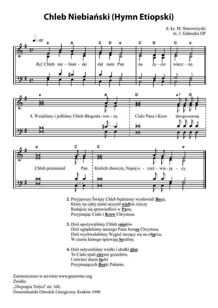 Chleb Niebiański (Hymn Etiopski) # ! $ %&'( t". ks. M. Starowieyski m. J. Ga"uszka OP e )) )) )) A )) Ref. Chleb nie - bia! - ski )) "# $ ! # ) #) ) ) )) C D )) )) e )) ** ) ) + + , )) )) - A , #) ) ) ) - 1. Wzi$li%my i jedli%my Chleb B"ogos"a - wio - ny + + ! # + + a Chleb przemieni" "# + + , )) )) - C , ) ) ) ) - Pan D C na #y - cie wiecz - ne. ** da" nam Pan e "# ** C * * )) )) )) )) + + D C + + ** ** * * ** , , D, )) )) )) )) - - dro-go-cen-n& , , , ) ) ) ) ) ) ) ) - - e7 Cia"o Pana i Krew + + e , )) , ) ) - , )) )) , ) ) ) ) - e ** Kielich zbawczy, Napój o - rze' - wia - j& - cy. + + 2. Przyj&wszy (wi$ty Chleb b$dziemy wys"awiali Boga, Który na ca"ej ziemi uczyni" wielkie rzeczy Radujcie si$ sprawiedliwi w Panu, Przyjmuj&c Cia"o i Krew Chrystusa. 3. Dzi% spo#ywali%my Chleb anio"ów Dzi% ogl&dali%my naszego Pana Jezusa Chrystusa, Dzi% wychwalali%my W$giel #arz&cy si$ na o"tarzu, W cieniu którego %piewaj& Serafiny. 4. Dzi% us"yszeli%my wielki i s"odki g!os: To Cia"o spali ciernie grzechów, I o%wieci dusze ludzi Przyjmuj&cych Boski Pokarm. Zamieszczono w serwisie www.giszowiec.org Źródło: „Niepojęta Trójco” str. 168, Dominikański Ośrodek Liturgiczny, Kraków 1998 **