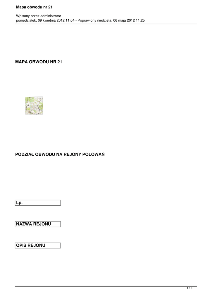 Mapa obwodu nr 21 Wpisany przez administrator poniedziałek, 09 kwietnia 2012 11:04 - Poprawiony niedziela, 06 maja 2012 11:25 MAPA OBWODU NR 21 PODZIAŁ OBWODU NA REJONY POLOWAŃ Lp. NAZWA REJONU OPIS REJONU 1/8 Mapa obwodu nr 21 Wpisany przez administrator poniedziałek, 09 kwietnia 2012 11:04 - Poprawiony niedziela, 06 maja 2012 11:25 1. SADZIANY od kamienia prosto drogą do granicy państwa następnie w lewo granicą państwa do drogi stanowiącej 2. SPALONA LEŚNICZÓWKA – KASZTANÓWKA od kamienia w prawo drogą przy barakowozie aż do drogi dębowej, następnie w lewo drogą do granicy 3. TAJWAN od drogi dębowej do generalskiego dębu po granicy ostoi z prawej granicy państwa z lewej 4. MOGIŁKI 2/8 Mapa obwodu nr 21 Wpisany przez administrator poniedziałek, 09 kwietnia 2012 11:04 - Poprawiony niedziela, 06 maja 2012 11:25 las w rejonie mogił 5. ŻWIRÓWKA LEWA na prawo od drogi do kamienia i lewo od żwirówki do ostoi 6. ŻWIRÓWKA PRAWA od żwrówki w prawo po ścianie lasu do ambony Pawlika, od ambony prosto do żwirowni przy drodze d 7. POLNY MIOT pomiędzy drogą przy cmentarzu a drogą do Sygajn do rowu 8. 3/8 Mapa obwodu nr 21 Wpisany przez administrator poniedziałek, 09 kwietnia 2012 11:04 - Poprawiony niedziela, 06 maja 2012 11:25 SYGAJNY od rowu do drogi w lewo na Stabławki i do stołów w lesie 9. SYGAJNY BAGNA prawa strona od drogi Dęby – Sigajny, od Sigajn drogą do Kumkiejm, dalej w prawo drogą do wąwozu 10. DĘBY – PAUSTRY cała lewa strona od drogi Górowo ul. Moniuszki – Dęby obok zabudowań Koznarskiego (z kompleksem 11. KRASNOŁĄKA wszystkie łąki pomiędzy drogą Górowo ul. Moniuszki – Dęby obok zabudowań Koznarskiego (oprócz k 4/8 Mapa obwodu nr 21 Wpisany przez administrator poniedziałek, 09 kwietnia 2012 11:04 - Poprawiony niedziela, 06 maja 2012 11:25 12. STABŁAWKI lewa strona od drogi ze Stabławek do Dulsina 13. PROSTY BRUK od stołów w lesie prosto do generalskiego dębu 14. PRAWY BRUK – OBWODNICA od stołów w prawo obwodnicą do generalskiego dębu 15. 5/8 Mapa obwodu nr 21 Wpisany przez administrator poniedziałek, 09 kwietnia 2012 11:04 - Poprawiony niedziela, 06 maja 2012 11:25 DULSIN prawa strona od drogi do wsi Dulsin za wsią obie strony nowej drogi do żwirowni i lewa strona drogi d 16. KIERNO prawa i lewa strona nowej drogi od żwirowni do granicy, lewa strona drogi od strażnicy do granicy pań 17. ŻYWKOWO pomiędzy drogą obok strażnicy do granicy państwa granicą państwa drogą stanowiącą granicę obwod 18. TOPRZYNY pomiędzy drogami na strażnicę i Górowo - Żywkowo od lini prostej między Dulsinem i Gałajnami do i s 6/8 Mapa obwodu nr 21 Wpisany przez administrator poniedziałek, 09 kwietnia 2012 11:04 - Poprawiony niedziela, 06 maja 2012 11:25 19. GAŁAJNY – KUMKIEJMY wszystko pomiędzy drogami Gałajny –Czyprki – Kumkiejmy Małe – Stabławki Dulsin 20. PIASTY wszystko pomiędzy drogą Górowo Baptyści ściana lasu do drogi na Wiewiórki do asfaltu w połowie od 21. 7/8 Mapa obwodu nr 21 Wpisany przez administrator poniedziałek, 09 kwietnia 2012 11:04 - Poprawiony niedziela, 06 maja 2012 11:25 WIEWIÓRKI Od linii prostej w połowie odległości pomiędzy Piastami a Wiewiórkami po ścianie lasu do drogi na Sta 22. WILCZYŃSKI - STACHOWSKI Prawa strona od drogi Górowo Czyprki za Baptystami przez Wojmiany do PGR Czyprki w prawo do W 8/8