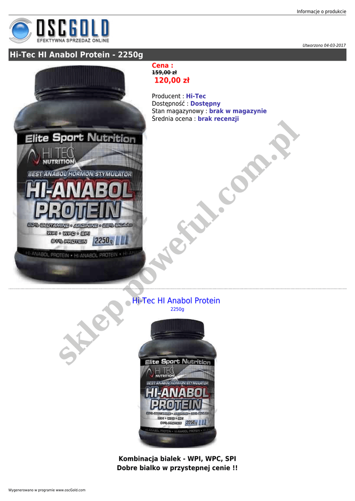 Informacje o produkcie Utworzono 04-03-2017 Hi-Tec HI Anabol Protein - 2250g Cena : 159,00 zł 120,00 zł po w ef ul .c om .p l Producent : Hi-Tec Dostępność : Dostępny Stan magazynowy : brak w magazynie Średnia ocena : brak recenzji 2250g sk le p. Hi-Tec HI Anabol Protein Kombinacja bialek - WPI, WPC, SPI Dobre bialko w przystepnej cenie !! Wygenerowano w programie www.oscGold.com Wysoka zawartosc bialka - 86g !! HiTec Hi Anabol Protein to wysokobiałkowa odżywka, zawierająca aż 91% pełnowartościowego białka (WPI, WPC, SPI), stworzona z myślą o osobach, pragnących w krótkim czasie poprawić wygląd swoich mięśni, a szczególnie trenujących kulturystykę i fitness. Odżywka białkowa HiTec Hi Anabol Protein charakteryzuje się doskonałą wchłanialnością, posiada wysoką wartość biologiczną, optymalny skład aminokwasowy ze szczególną zawartością aminokwasów bcaa, glutaminy i argininy. .c om Działanie odżywki Hi Tec Hi Anabol Protein? Jak działa dobre i tanie białko Hi tec? .p l Best Anabol Hormon Stymulator. WPC. WPI. SPI. Arginine. 20% Glutamine. 20% Bcaa. 91% Protein Wysokobiałkowa odżywka Hi-Tec Hi Anabol Prtein - opis i charakterystyka białka na masę. Efektem zestawienia białek serwatkowych w odżywce Hi Anabol Protein (ultrafiltrowany koncentrat białek serwatki, izolat białka serwatki) z białkiem sojowym (izolat białka sojowego) jest : silne zahamowanie procesów katabolicznych pobudzenie procesów anabolicznych (istotne u kulturystów będących w okresie budowy masy mięśniowej) stymulacja systemu odpornościowego i hormonalnego, m.in. pobudzenie syntezy i wydzielania hormonu wzrostu (GH) oraz czynnika wzrostu (IGF-1) Tania odżywka białkowa dla kulturystów Hi-Tec Hi Anabol Protein to wszechstronne białko. Hi Anabol Protein zwiększa syntezę insuliny, testosteronu, hormonu wzrostu, tyroksyny, a także stymuluje syntezę tlenku azotu. Suplement proteinowy Hitec Hi Anabol buduje mięśnie i spala tłuszcz. Ponadto odżywka Hi Anabol Protein charakteryzuje się doskonałą wchłanialnością i wysoką wartością anaboliczną. w ef ul Białko sojowe zawarte w suplemencie diety HiTec Hi Anabol Protein podkręca metabolizm i pobudza termogenezę, dzięki czemu silniej spala się kalorie, a dzięki dużej zawartości argininy stymuluje syntezę tlenku azotu. Efektem działania odżywki białkowej stosowanej w kulturystyce i fitness - HiTec Hi Anabol Protein jest poprawa bilansu azotowego, maksymalne wykorzystanie tłuszczu zapasowego jako źródła energii i szybki wzrost beztłuszczowej masy mięśniowej. po Zalety Hitec Hi Anabol Protein: doskonała wchłanialność odżywki, wysoka wartość biologiczna (BV, PDCAAS) optymalny skład aminokwasów, zarówno egzo- jak i endogennych, wysoka zawartość aminokwasów siarkowych (cysteina, metionina), aminokwasów BCAA, glutaminy i argininy. Dawkowanie Hi Tec Hi Anabol Protein? Jak brać białko Hi-Tec? p. 25 gramów (2 pełne miarki) proszku rozpuścić w 250 ml mleka, spożywać po posiłkach lub między posiłkami. sk le Dni treningowe: rano po przebudzeniu, jedną godzinę przed treningiem (można zastosować jako osobny posiłek przedtreningowy), ok. 30 minut po treningu wraz z węglowodanami o wysokim indeksie glikemicznym, przed snem. Arginina 4,3g Aspartic Acid 11,3g Dni nietreningowe: trzy razy dziennie (rano, w ciągu dnia, przed snem). Opis i charakterystyka preparatu białkowego Hitec Hi Anabol Protein: 1 porcja = 25g (2 miarki) Ilość porcji w opakowaniu: 90 Zawartość opakowania: 2250g wysokobiałkowej odżywki dla sportowców Skład preparatu marki Hi-Tec Hi Anabol Protein: Zawartość opakowania odżywki: w 100g w 25g (1 porcja) Wartość energetyczna 1632 kJ / 385 kcal 408 kJ / 96 kcal Białko 86g (do 91 g w s.m.) 21,7g Węglowodany 2,5g 0,6g Informacje o produkcie .c om Inne składniki odżywki: .p l Tłuszcz 3g 0,7g Profil aminokwasowy - zawartość aminokwasów w 100g białka: Alanina 4,9g Cysteina 2,4g Glutamina 18,5g Glicyna 2,8g Histydyna 2,1g Izoleucyna 5,1g Leucyna 10,1g Lizyna 8,1g Metionina 1,7g Phenylalanine 4,0g Prolina 5,6g Seryna 5,1g Treonina 5,7g Tryptofan 1,8g Tyrozyna 3,4g Walina 5,2g sk le p. po w ef ul Ultrafiltrowany koncentrat białek serwatkowych, izolat białka sojowego, izolat białka serwatkowego, aromatyczne ekstrakty roślinne, kwas cytrynowy (regulator kwasowości), substancje słodzące (cyklaminian sodu, sacharynian sodu), witamina C (kwas askorbinowy), witamina B3 (nikotynamid), witamina E (octan ? –tokoferylu), witamina B5 (pantotenian wapnia), witamina B1 (azotan tiaminy), witamina B2 (ryboflawina), witamina B6 (chlorowodorek pirydoksyny), witamina B9 (kwas foliowy), witamina H (biotyna), witamina B12 (cyjanokobalamina), aromat identyczny z naturalnym. Wygenerowano w programie www.oscGold.com