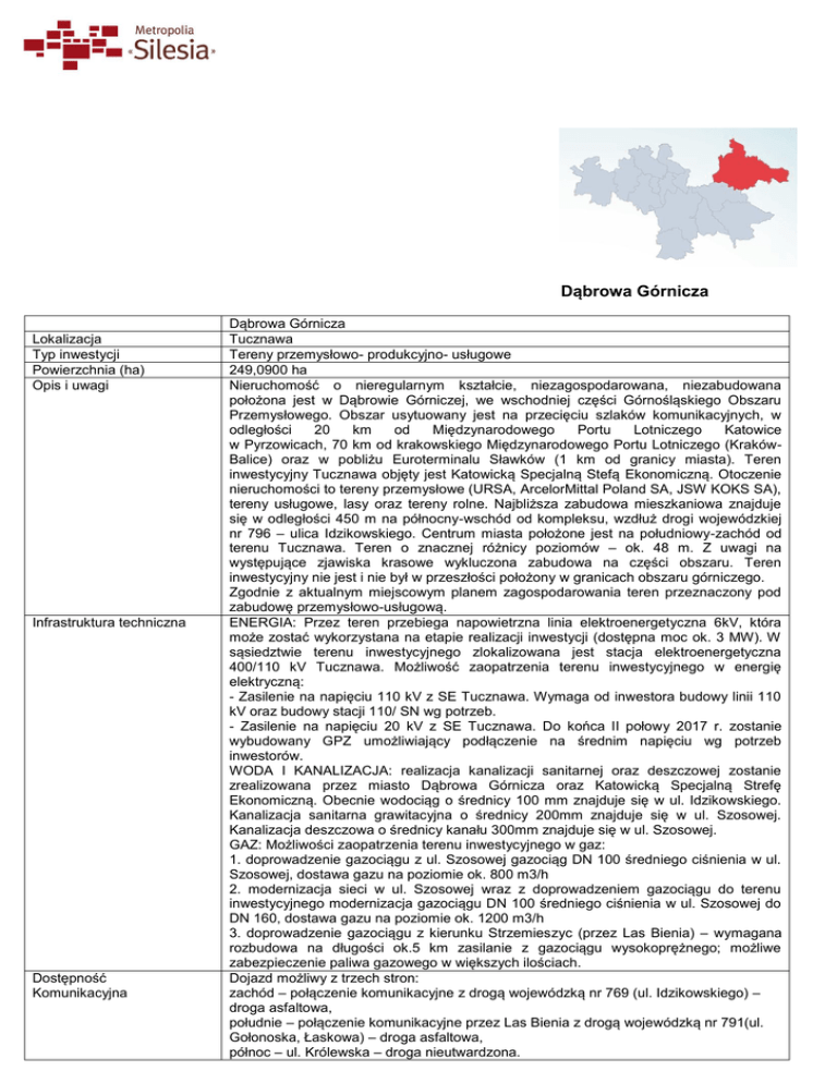 Dąbrowa Górnicza Lokalizacja Typ inwestycji Powierzchnia (ha) Opis i uwagi Infrastruktura techniczna Dostępność Komunikacyjna Dąbrowa Górnicza Tucznawa Tereny przemysłowo- produkcyjno- usługowe 249,0900 ha Nieruchomość o nieregularnym kształcie, niezagospodarowana, niezabudowana położona jest w Dąbrowie Górniczej, we wschodniej części Górnośląskiego Obszaru Przemysłowego. Obszar usytuowany jest na przecięciu szlaków komunikacyjnych, w odległości 20 km od Międzynarodowego Portu Lotniczego Katowice w Pyrzowicach, 70 km od krakowskiego Międzynarodowego Portu Lotniczego (KrakówBalice) oraz w pobliżu Euroterminalu Sławków (1 km od granicy miasta). Teren inwestycyjny Tucznawa objęty jest Katowicką Specjalną Stefą Ekonomiczną. Otoczenie nieruchomości to tereny przemysłowe (URSA, ArcelorMittal Poland SA, JSW KOKS SA), tereny usługowe, lasy oraz tereny rolne. Najbliższa zabudowa mieszkaniowa znajduje się w odległości 450 m na północny-wschód od kompleksu, wzdłuż drogi wojewódzkiej nr 796 – ulica Idzikowskiego. Centrum miasta położone jest na południowy-zachód od terenu Tucznawa. Teren o znacznej różnicy poziomów – ok. 48 m. Z uwagi na występujące zjawiska krasowe wykluczona zabudowa na części obszaru. Teren inwestycyjny nie jest i nie był w przeszłości położony w granicach obszaru górniczego. Zgodnie z aktualnym miejscowym planem zagospodarowania teren przeznaczony pod zabudowę przemysłowo-usługową. ENERGIA: Przez teren przebiega napowietrzna linia elektroenergetyczna 6kV, która może zostać wykorzystana na etapie realizacji inwestycji (dostępna moc ok. 3 MW). W sąsiedztwie terenu inwestycyjnego zlokalizowana jest stacja elektroenergetyczna 400/110 kV Tucznawa. Możliwość zaopatrzenia terenu inwestycyjnego w energię elektryczną: - Zasilenie na napięciu 110 kV z SE Tucznawa. Wymaga od inwestora budowy linii 110 kV oraz budowy stacji 110/ SN wg potrzeb. - Zasilenie na napięciu 20 kV z SE Tucznawa. Do końca II połowy 2017 r. zostanie wybudowany GPZ umożliwiający podłączenie na średnim napięciu wg potrzeb inwestorów. WODA I KANALIZACJA: realizacja kanalizacji sanitarnej oraz deszczowej zostanie zrealizowana przez miasto Dąbrowa Górnicza oraz Katowicką Specjalną Strefę Ekonomiczną. Obecnie wodociąg o średnicy 100 mm znajduje się w ul. Idzikowskiego. Kanalizacja sanitarna grawitacyjna o średnicy 200mm znajduje się w ul. Szosowej. Kanalizacja deszczowa o średnicy kanału 300mm znajduje się w ul. Szosowej. GAZ: Możliwości zaopatrzenia terenu inwestycyjnego w gaz: 1. doprowadzenie gazociągu z ul. Szosowej gazociąg DN 100 średniego ciśnienia w ul. Szosowej, dostawa gazu na poziomie ok. 800 m3/h 2. modernizacja sieci w ul. Szosowej wraz z doprowadzeniem gazociągu do terenu inwestycyjnego modernizacja gazociągu DN 100 średniego ciśnienia w ul. Szosowej do DN 160, dostawa gazu na poziomie ok. 1200 m3/h 3. doprowadzenie gazociągu z kierunku Strzemieszyc (przez Las Bienia) – wymagana rozbudowa na długości ok.5 km zasilanie z gazociągu wysokoprężnego; możliwe zabezpieczenie paliwa gazowego w większych ilościach. Dojazd możliwy z trzech stron: zachód – połączenie komunikacyjne z drogą wojewódzką nr 769 (ul. Idzikowskiego) – droga asfaltowa, południe – połączenie komunikacyjne przez Las Bienia z drogą wojewódzką nr 791(ul. Gołonoska, Łaskowa) – droga asfaltowa, północ – ul. Królewska – droga nieutwardzona. Właściciel Kontakt •Odległość do centrum Dąbrowy Górniczej – 10 km •Odległość do centrum Katowic – 27 km •Odległość do drogi ekspresowej S1 – 6 km •Odległość do węzła S1/DK-94 – 10 km •Odległość do autostrady A1 – 25 km •Odległość do autostrady A4 – 23 km •Odległość do Euroterminalu w Sławkowie – 12 km •Odległość do linii kolejowej – 2 km Gmina Dąbrowa Górnicza Urząd Miejski w Dąbrowie Górniczej Biuro Rozwoju Miasta i Obsługi Inwestorów Ewa Fudali- Bondel Tel.: +48 32 295 96 97 Email: [email protected] Karolina Karlik Tel.: +48 32 295 69 90 Email: [email protected]