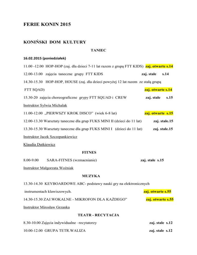 FERIE KONIN 2015 KONIŃSKI DOM KULTURY TANIEC 16.02.2015 (poniedziałek) 11.00 -12.00 HOP-HOP (zaj. dla dzieci 7-11 lat razem z grupą FTT KIDS) zaj. otwarte s.14 12.00-13.00 zajęcia taneczne grupy FTT KIDS zaj. stałe s.14 14.30-15.30 HOP-HOP, HOUSE (zaj. dla dzieci powyżej 12 lat razem ze stałą grupą FTT SQAD) zaj. otwarte s.14 15.30-20 zajęcia choreograficzne grypy FTT SQUAD i CREW zaj. stałe s.15 Instruktor Sylwia Michalak 11.00-12.00 „PIERWSZY KROK DISCO” (wiek 6-8 lat) zaj. otwarte s.15 12.00-13.30 Warsztaty taneczne dla grup FUKS MINI II (dzieci do 11 lat) zaj. stałe.15 13.30-15.30 Warsztaty taneczne dla grup FUKS MINI I (dzieci do 11 lat) zaj. stałe.15 Instruktor Jacek Szczepankiewicz Klaudia Dutkiewicz FITNES 8.00-9.00 SARA-FITNES (wzmacnianie) zaj. stałe s.15 Instruktor Małgorzata Woźniak MUZYKA 13.30-14.30 KEYBOARDOWE ABC- podstawy nauki gry na elektronicznych instrumentach klawiszowych. zaj. otwarte s.55 14.30-15.30 ZAJ.WOKALNE - MIKROFON DLA KAŻDEGO” zaj. otwarte s.55 Instruktor Mirosław Grzanka TEATR - RECYTACJA 8.30-10.00 Zajęcia indywidualne –recytatorzy zaj. stałe s.12 10.00-12.00 GRUPA TETR.WALIZA zaj. stałe s.12 12.30-14.00-Warsztaty recytatorskie(dla dzieci 10-12 lat) zaj. otwarte s.12 Instruktor Elżbieta Gierasimow Zakowany AKF-MUZA Zajęcia praktyczne AKF „Muza”dla członków klubu ( kontynuacja montażu filmu o historii „Konwartu” ) zaj. stałe. kino „Oczko” Instruktor Andrzej Moś KINO 12.00-KINO CENTRUM-SEANSE FILMOWE DLA DZIECI 17.02.2015 (wtorek) TANIEC 11.00 -12.00 HOP –HOP (zaj. dla dzieci 7-11 lat razem ze stałą grupą FTT KIDS) zaj. otwarte s.14 12.00-13.00 zajęcia taneczne grupy FTT KIDS zaj. stałe s.14 14.30-15.30 HOP-HOP, HOUSE (zaj. dla dzieci powyżej 12 lat razem z grupą FTT SQAD) zaj. otwarte s.14 15.30-20 zajęcia choreograficzne grypy FTT SQUAD i CREW zaj. stałe s.15 Instruktor Sylwia Michalak 11.00-12.00 „PIERWSZY KROK DISCO” (wiek 6-8 lat) zaj. otwarte s.15 12.00-13.30 Warsztaty taneczne dla grup FUKS MINI II (dzieci do 11 lat) zaj. stałe.15 13.30-15.30 Warsztaty taneczne dla grup FUKS MINI I (dzieci do 11 lat) zaj. stałe.15 Instruktor Jacek Szczepankiewicz/ Klaudia Dutkiewicz FITNES 9.00-10.00 SARA-FITNES ( streching, zdrowy kręgosłup) zaj. stałe s.15 Instruktor Małgorzata Woźniak MUZYKA 13.30-14.30 KEYBOARDOWE ABC- podstawy nauki gry na elektronicznych instrumentach klawiszowych zaj. otwarte s.55 14.30-15.00 ZAJ.WOKALNE - ‘MIKROFON DLA KAŻDEGO” KDK STUDIO PIOSENKI instruktor Mirosław Grzanka zaj. otwarte s.55 17.00-20.00 Otwarta próba zespołu „AGHARTA” (udział mogą wziąć udział także inne osoby grające na różnych instrumentach muzycznych) zaj. otwarte s.55 Instruktor Mirosław Grzanka PLASTYKA 10.00-12.00 ATELIER KREDKA zaj. otwarte s.11 „Mrozem malowane ”- zaj. plastyczne. Dzieci w wieku 6-11 lat (12 miejsc) KDK sala nr.11- instruktor Katarzyna Mijakowska W programie: Rysowanie- kredki, pastele suche i olejne; Malowanie; farby akwarelowe i plakatowe. Działania rozwijające kreatywność i wyobraźnie plastyczną - mix media 14.00-16.00 zajęcia plastyczne dla stałych grup Atelier Kredka /uczestnicy zaj. wtorkowych/ zaj. stałe.11 Instruktor: Katarzyna Mijakowska AKF-MUZA 12-13.30 Podstawy technik filmowania – zajęcia otwarte dla młodzieży kino „Oczko” Zajęcia praktyczne AKF „Muza”dla członków klubu ( kontynuacja montażu filmu o historii „Konwartu” ) zaj. stałe. kino „Oczko” Instruktor Andrzej Moś KINO 12.00-KINO CENTRUM-SEANSE FILMOWE DLA DZIECI 18.02.2015 (środa) TANIEC 11.00 -12.00 HOP –HOP (zaj. dla dzieci 7-11 lat razem ze stałą grupą FTT KIDS) zaj. otwarte s.15 12.00-13.00 zajęcia taneczne grupy FTT KIDS zaj. stałe s.15 14.30-15.30 HOP-HOP, HOUSE (zaj. dla dzieci powyżej 12 lat razem ze stałą grupą FTT SQAD) zaj. otwarte s.15 15.30-20 zajęcia choreograficzne grypy FTT SQUAD i CREW zaj. stałe s. 15 Instruktor Sylwia Michalak 11.00-12.00 „PIERWSZY KROK DISCO” (wiek 6-8 lat) zaj. otwarte s.14 12.00-13.30 Warsztaty taneczne dla mg FUKS MINI zaj. stałe.14 13.30-15.30 Warsztaty taneczne dla mg FUKS I zaj. stałe.14 Instruktor Jacek Szczepankiewicz/ Klaudia Dutkiewicz FITNES 8.00-9.00 SARA-FITNES (wzmacnianie) Instruktor Małgorzata Woźniak zaj. stałe s.15 MUZYKA 13.30-15.30 Otwarta próba zespołu wokalnego „FANTAZJA” zajęcia wokalne dla seniorów(nabór do zespołu i udział w próbie) zaj. otwarte s.55 Instruktor Mirosław Grzanka TEATR - RECYTACJA 8.30-10.00 Zajęcia indywidualne–recytatorzy zaj. stałe s.12 10.00-12.00 GRUPA TETR.WALIZA zaj. stałe s.12 12.30-14.00-Warsztaty recytatorskie (dla dzieci 10-12 lat) zaj. otwarte s.12 Instruktor Elżbieta Gierasimow Zakowany PLASTYKA 10.00-12.00 ATELIER KREDKA zaj. otwarte s.11 „Mrozem malowane ”- zaj. plastyczne Dzieci w wieku 6-11 lat (12 miejsc) W programie: rysowanie- kredki, pastele suche i olejne; Malowanie; farby akwarelowe i plakatowe Działania kreatywne-mix media 14.00-16.00 zajęcia plastyczne dla stałych grup Atelier Kredka /uczestnicy zaj. środowych/ zaj. stałe.11 Instruktor: Katarzyna Mijakowska AKF-MUZA 12-13.30 Podstawy technik filmowania – zajęcia otwarte dla młodzieży kino „Oczko” Zajęcia praktyczne AKF „Muza”dla członków klubu ( kontynuacja montażu filmu o historii zaj. stałe. kino „Oczko” „Konwartu” ) Instruktor Andrzej Moś KINO 12.00-KINO CENTRUM-SEANSE FILMOWE DLA DZIECI 19.02.2015 (czwartek) TANIEC 11.00 -13.00 FTT KIDS zaj. stałe s.14 14.30-20.00 zajęcia choreograficzne grypy FTT SQUAD i CREW zaj. stałe s.14/s.15 Instruktor Sylwia Michalak 12.00-14.00 zajęcia taneczne –mała grupa FUKS I (młodsi) 14.00-16.00 zajęcia taneczne –mała grupa FUKS MINI I zaj. stałe.s 15 zaj. stałe.s. 15 Instruktor Jacek Szczepankiewicz/ Klaudia Dutkiewicz 18.00-20.00 Otwarta próba Zespołu i Pieśni i Tańca Konin. W tych dniach prowadzone będą nabory dla młodzieży do sekcji muzycznej, wokalnej i tanecznej. 
