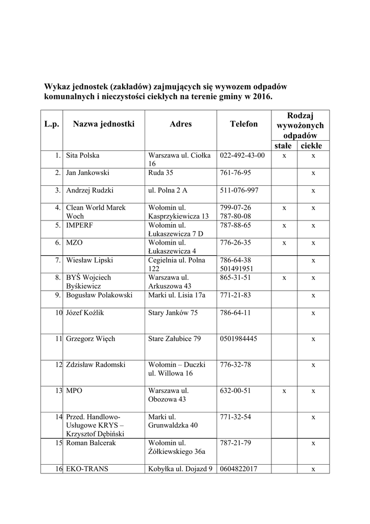 Wykaz jednostek (zakładów) zajmujących się wywozem odpadów komunalnych i nieczystości ciekłych na terenie gminy w 2016. L.p. Nazwa jednostki Rodzaj wywożonych odpadów stałe ciekłe Adres Telefon 022-492-43-00 2. Jan Jankowski Warszawa ul. Ciołka 16 Ruda 35 761-76-95 x 3. Andrzej Rudzki ul. Polna 2 A 511-076-997 x 4. Clean World Marek Woch 5. IMPERF 799-07-26 787-80-08 787-88-65 x x x x 776-26-35 x x 8. BYŚ Wojciech Byśkiewicz 9. Bogusław Polakowski Wołomin ul. Kasprzykiewicza 13 Wołomin ul. Łukaszewicza 7 D Wołomin ul. Łukaszewicza 4 Cegielnia ul. Polna 122 Warszawa ul. Arkuszowa 43 Marki ul. Lisia 17a 771-21-83 x 10 Józef Koźlik Stary Janków 75 786-64-11 x 11 Grzegorz Więch Stare Załubice 79 0501984445 x 12 Zdzisław Radomski Wołomin – Duczki ul. Willowa 16 776-32-78 x 13 MPO Warszawa ul. Obozowa 43 632-00-51 14 Przed. HandlowoUsługowe KRYS – Krzysztof Dębiński 15 Roman Balcerak Marki ul. Grunwaldzka 40 771-32-54 x Wołomin ul. Żółkiewskiego 36a 787-21-79 x Kobyłka ul. Dojazd 9 0604822017 x 1. Sita Polska 6. MZO 7. Wiesław Lipski 16 EKO-TRANS 786-64-38 501491951 865-31-51 x x x x x x x Mieczysław Waszczuk 17 Błysk Otwock ul. Piastowa 2 022-7101080 x 18 Jurant Zielonka ul. Ossowska 73 22-7819063 x 19 Clipper Sp.Zo.o. Warszawa 22-8684592 20 Kazimierz Mędrzycki Dybów ul. Ułańska 33 21 P.U.H Wallus ul. Kościelna 56/70 05-200 Wołomin 601-87-76-72 22 Remondis Ul. Zawodzie 16 22-858-75-67 x x 23 JARPER Sp. zo.o. Al. Krakowska 108 A, 05-552 Wólka Kosowska Ul. Daszyńskiego98/22 06-100 Pułtusk Ul. Kołobrzeska 5 07—401 Ostrołęka Ul. Weteranów 87 05-250 Radzymin 022-756-16-66 x x 22-811-08-53 x 029-7691800 x 24 PARTNER 25 MPK Sp.zo.o. 26 Wywóz nieczystości płynnych Wojcieszkiewicz Artur 27 P.P.U.H. Czyścioch Sp.zo.o. x x x 602119313 x ul. Kleeberga 20, 15691 Białystok 085-6629804 x 28 Ziemia Polska Sp.zo.o. Lipowa 5, 05-860 Płochocin 22-2166440 x 29 Zakład Usług Asenizacyjnych Marek Bukan 30 F.H.U. Natura Marek Michałowski ul. Żółkiewskiego 11, 05-075 Warszawa Ul. Serocka 11, 85552 Bydgoszcz 0-22-7832463 x 052-3402918 x 31 Jaro Jarosław Górecki Ul. POW 22, 05-250 Radzymin 503104605 x P.HU. Dudzińscy Cezary Ul. Lewandów 11, 32 Dudziński 03-299 Warszawa x