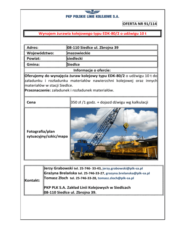 OFERTA NR 91/114 Wynajem żurawia kolejowego typu EDK-80/2 o udźwigu 10 t Adres: Województwo: Powiat: Gmina: 08-110 Siedlce ul. Zbrojna 39 mazowieckie siedlecki Siedlce Informacje o ofercie: Oferujemy do wynajęcia żuraw kolejowy typu EDK-80/2 o udźwigu 10 t do załadunku i rozładunku materiałów nawierzchni kolejowej oraz innych materiałów w stacji Siedlce. Przeznaczenie: załadunek i rozładunek materiałów. Cena 350 zł /1 godz. + dojazd dźwigu wg kalkulacji Fotografia/plan sytuacyjny/szkic/mapa Kontakt: Jerzy Grabowski tel. 25-746- 33-43, [email protected] Grażyna Brelańska tel. 25-746-33-27, [email protected] Tomasz Złoch tel. 25-746-33-28, [email protected] PKP PLK S.A. Zakład Linii Kolejowych w Siedlcach 08-110 Siedlce ul. Zbrojna 39.