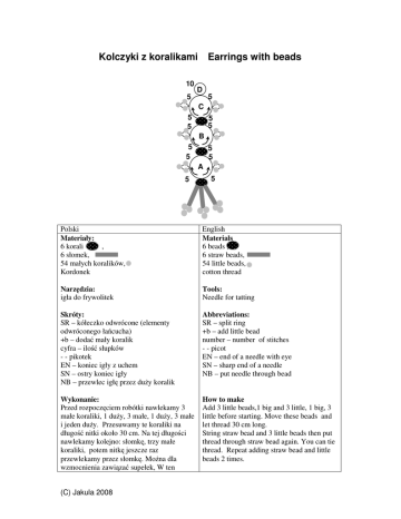 Kolczyki z koralikami 10 5 Earrings with beads D 5 C 5 5 5 5 B 5 5 5 5 A 5 5 Polski Materiały: 6 korali , 6 słomek, 54 małych koralików, Kordonek English Materials 6 beads , 6 straw beads, 54 little beads, cotton thread Narz dzia: igła do frywolitek Tools: Needle for tatting Skróty: SR – kółeczko odwrócone (elementy odwróconego ła cucha) +b – doda mały koralik cyfra – ilo słupków - - pikotek EN – koniec igły z uchem SN – ostry koniec igły NB – przewlec igł przez du y koralik Abbreviations: SR – split ring +b – add little bead number – number of stitches - - picot EN – end of a needle with eye SN – sharp end of a needle NB – put needle through bead Wykonanie: Przed rozpocz ciem robótki nawlekamy 3 małe koraliki, 1 du y, 3 małe, 1 du y, 3 małe i jeden du y. Przesuwamy te koraliki na długo nitki około 30 cm. Na tej długo ci nawlekamy kolejno: słomk , trzy małe koraliki, potem nitk jeszcze raz przewlekamy przez słomk . Mo na dla wzmocnienia zawi za supełek, W ten How to make Add 3 little beads,1 big and 3 little, 1 big, 3 little before starting. Move these beads and let thread 30 cm long. String straw bead and 3 little beads then put thread through straw bead again. You can tie thread. Repeat adding straw bead and little beads 2 times. (C) Jakula 2008 sposób mocujemy jeszcze dwie słomki. Then you make as in pattern: Dalej wykonujemy wg schematu A: NB EN 5 +b+b+b 5 SN 5 +b+b+b 5 B: NB EN 5 +b+b+b 5 SN 5 +b+b+b 5 C: NB EN 5 +b+b+b 5 SN 5 +b+b+b 5 D: 10 Korzystaj c z powy szych instrukcji nale y wykona drugi kolczyk. (C) Jakula 2008 Using this instruction make second earring .