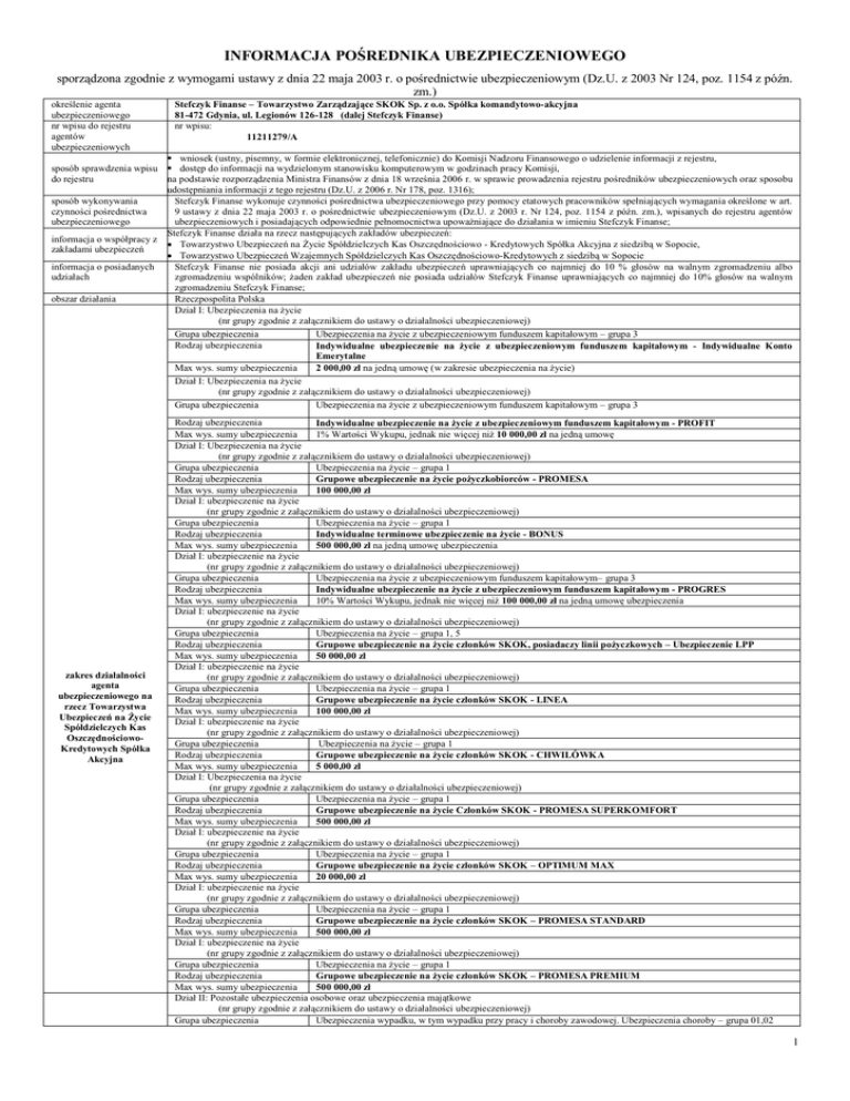INFORMACJA POŚREDNIKA UBEZPIECZENIOWEGO sporządzona zgodnie z wymogami ustawy z dnia 22 maja 2003 r. o pośrednictwie ubezpieczeniowym (Dz.U. z 2003 Nr 124, poz. 1154 z późn. zm.) określenie agenta ubezpieczeniowego nr wpisu do rejestru agentów ubezpieczeniowych Stefczyk Finanse – Towarzystwo Zarządzające SKOK Sp. z o.o. Spółka komandytowo-akcyjna 81-472 Gdynia, ul. Legionów 126-128 (dalej Stefczyk Finanse) nr wpisu: 11211279/A wniosek (ustny, pisemny, w formie elektronicznej, telefonicznie) do Komisji Nadzoru Finansowego o udzielenie informacji z rejestru, sposób sprawdzenia wpisu dostęp do informacji na wydzielonym stanowisku komputerowym w godzinach pracy Komisji, do rejestru na podstawie rozporządzenia Ministra Finansów z dnia 18 września 2006 r. w sprawie prowadzenia rejestru pośredników ubezpieczeniowych oraz sposobu udostępniania informacji z tego rejestru (Dz.U. z 2006 r. Nr 178, poz. 1316); sposób wykonywania Stefczyk Finanse wykonuje czynności pośrednictwa ubezpieczeniowego przy pomocy etatowych pracowników spełniających wymagania określone w art. czynności pośrednictwa 9 ustawy z dnia 22 maja 2003 r. o pośrednictwie ubezpieczeniowym (Dz.U. z 2003 r. Nr 124, poz. 1154 z późn. zm.), wpisanych do rejestru agentów ubezpieczeniowego ubezpieczeniowych i posiadających odpowiednie pełnomocnictwa upoważniające do działania w imieniu Stefczyk Finanse; Stefczyk Finanse działa na rzecz następujących zakładów ubezpieczeń: informacja o współpracy z Towarzystwo Ubezpieczeń na Życie Spółdzielczych Kas Oszczędnościowo - Kredytowych Spółka Akcyjna z siedzibą w Sopocie, zakładami ubezpieczeń Towarzystwo Ubezpieczeń Wzajemnych Spółdzielczych Kas Oszczędnościowo-Kredytowych z siedzibą w Sopocie informacja o posiadanych Stefczyk Finanse nie posiada akcji ani udziałów zakładu ubezpieczeń uprawniających co najmniej do 10 % głosów na walnym zgromadzeniu albo udziałach zgromadzeniu wspólników; żaden zakład ubezpieczeń nie posiada udziałów Stefczyk Finanse uprawniających co najmniej do 10% głosów na walnym zgromadzeniu Stefczyk Finanse; obszar działania Rzeczpospolita Polska Dział I: Ubezpieczenia na życie (nr grupy zgodnie z załącznikiem do ustawy o działalności ubezpieczeniowej) Grupa ubezpieczenia Ubezpieczenia na życie z ubezpieczeniowym funduszem kapitałowym – grupa 3 Rodzaj ubezpieczenia Indywidualne ubezpieczenie na życie z ubezpieczeniowym funduszem kapitałowym - Indywidualne Konto Emerytalne Max wys. sumy ubezpieczenia 2 000,00 zł na jedną umowę (w zakresie ubezpieczenia na życie) Dział I: Ubezpieczenia na życie (nr grupy zgodnie z załącznikiem do ustawy o działalności ubezpieczeniowej) Grupa ubezpieczenia Ubezpieczenia na życie z ubezpieczeniowym funduszem kapitałowym – grupa 3 zakres działalności agenta ubezpieczeniowego na rzecz Towarzystwa Ubezpieczeń na Życie Spółdzielczych Kas OszczędnościowoKredytowych Spółka Akcyjna Rodzaj ubezpieczenia Indywidualne ubezpieczenie na życie z ubezpieczeniowym funduszem kapitałowym - PROFIT Max wys. sumy ubezpieczenia 1% Wartości Wykupu, jednak nie więcej niż 10 000,00 zł na jedną umowę Dział I: Ubezpieczenia na życie (nr grupy zgodnie z załącznikiem do ustawy o działalności ubezpieczeniowej) Grupa ubezpieczenia Ubezpieczenia na życie – grupa 1 Rodzaj ubezpieczenia Grupowe ubezpieczenie na życie pożyczkobiorców - PROMESA Max wys. sumy ubezpieczenia 100 000,00 zł Dział I: ubezpieczenie na życie (nr grupy zgodnie z załącznikiem do ustawy o działalności ubezpieczeniowej) Grupa ubezpieczenia Ubezpieczenia na życie – grupa 1 Rodzaj ubezpieczenia Indywidualne terminowe ubezpieczenie na życie - BONUS Max wys. sumy ubezpieczenia 500 000,00 zł na jedną umowę ubezpieczenia Dział I: ubezpieczenie na życie (nr grupy zgodnie z załącznikiem do ustawy o działalności ubezpieczeniowej) Grupa ubezpieczenia Ubezpieczenia na życie z ubezpieczeniowym funduszem kapitałowym– grupa 3 Rodzaj ubezpieczenia Indywidualne ubezpieczenie na życie z ubezpieczeniowym funduszem kapitałowym - PROGRES Max wys. sumy ubezpieczenia 10% Wartości Wykupu, jednak nie więcej niż 100 000,00 zł na jedną umowę ubezpieczenia Dział I: ubezpieczenie na życie (nr grupy zgodnie z załącznikiem do ustawy o działalności ubezpieczeniowej) Grupa ubezpieczenia Ubezpieczenia na życie – grupa 1, 5 Rodzaj ubezpieczenia Grupowe ubezpieczenie na życie członków SKOK, posiadaczy linii pożyczkowych – Ubezpieczenie LPP Max wys. sumy ubezpieczenia 50 000,00 zł Dział I: ubezpieczenie na życie (nr grupy zgodnie z załącznikiem do ustawy o działalności ubezpieczeniowej) Grupa ubezpieczenia Ubezpieczenia na życie – grupa 1 Rodzaj ubezpieczenia Grupowe ubezpieczenie na życie członków SKOK - LINEA Max wys. sumy ubezpieczenia 100 000,00 zł Dział I: ubezpieczenie na życie (nr grupy zgodnie z załącznikiem do ustawy o działalności ubezpieczeniowej) Grupa ubezpieczenia Ubezpieczenia na życie – grupa 1 Rodzaj ubezpieczenia Grupowe ubezpieczenie na życie członków SKOK - CHWILÓWKA Max wys. sumy ubezpieczenia 5 000,00 zł Dział I: Ubezpieczenia na życie (nr grupy zgodnie z załącznikiem do ustawy o działalności ubezpieczeniowej) Grupa ubezpieczenia Ubezpieczenia na życie – grupa 1 Rodzaj ubezpieczenia Grupowe ubezpieczenie na życie Członków SKOK - PROMESA SUPERKOMFORT Max wys. sumy ubezpieczenia 500 000,00 zł Dział I: ubezpieczenie na życie (nr grupy zgodnie z załącznikiem do ustawy o działalności ubezpieczeniowej) Grupa ubezpieczenia Ubezpieczenia na życie – grupa 1 Rodzaj ubezpieczenia Grupowe ubezpieczenie na życie członków SKOK – OPTIMUM MAX Max wys. sumy ubezpieczenia 20 000,00 zł Dział I: ubezpieczenie na życie (nr grupy zgodnie z załącznikiem do ustawy o działalności ubezpieczeniowej) Grupa ubezpieczenia Ubezpieczenia na życie – grupa 1 Rodzaj ubezpieczenia Grupowe ubezpieczenie na życi