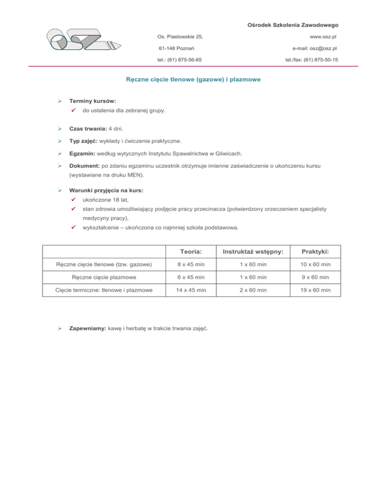 Ośrodek Szkolenia Zawodowego Os. Piastowskie 25, www.osz.pl 61-148 Poznań e-mail: [email protected] tel.: (61) 875-56-65 tel./fax: (61) 875-50-15 Ręczne cięcie tlenowe (gazowe) i plazmowe Terminy kursów: do ustalenia dla zebranej grupy. Czas trwania: 4 dni. Typ zajęć: wykłady i ćwiczenia praktyczne. Egzamin: według wytycznych Instytutu Spawalnictwa w Gliwicach. Dokument: po zdaniu egzaminu uczestnik otrzymuje imienne zaświadczenie o ukończeniu kursu (wystawiane na druku MEN). Warunki przyjęcia na kurs: ukończone 18 lat, stan zdrowia umożliwiający podjęcie pracy przecinacza (potwierdzony orzeczeniem specjalisty medycyny pracy), wykształcenie – ukończona co najmniej szkoła podstawowa. Teoria: Instruktaż wstępny: Praktyki: Ręczne cięcie tlenowe (tzw. gazowe) 8 x 45 min 1 x 60 min 10 x 60 min Ręczne cięcie plazmowe 6 x 45 min 1 x 60 min 9 x 60 min Cięcie termiczne: tlenowe i plazmowe 14 x 45 min 2 x 60 min 19 x 60 min Zapewniamy: kawę i herbatę w trakcie trwania zajęć.