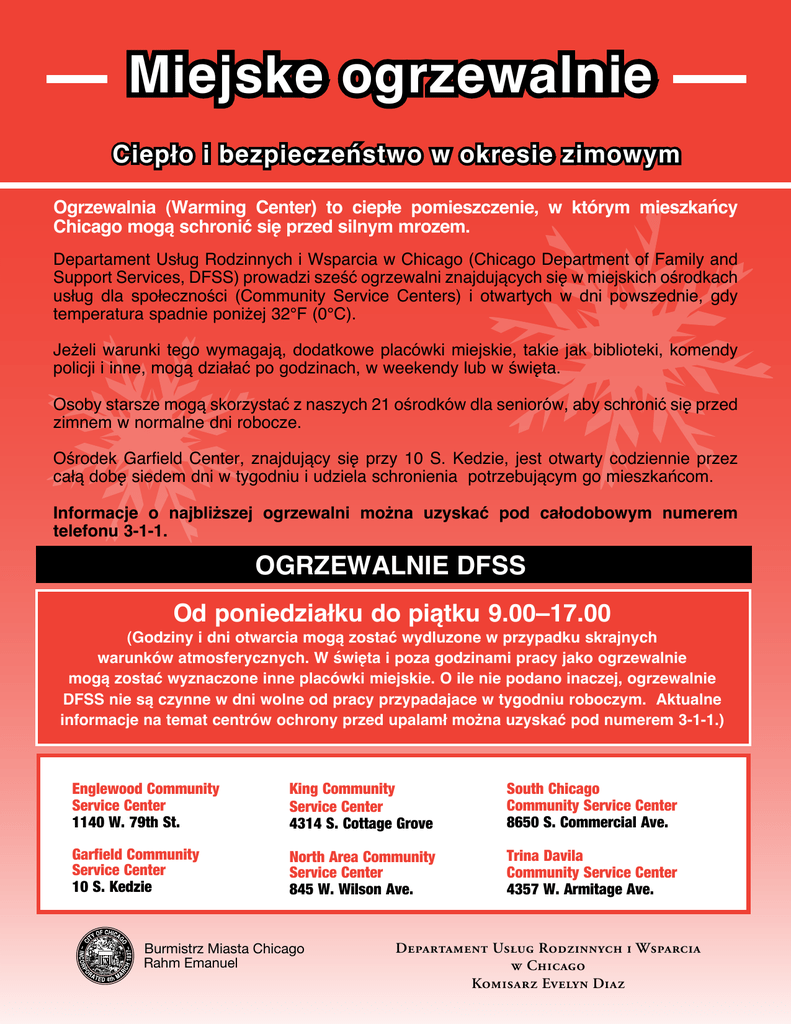 Miejske ogrzewalnie Ciepło i bezpieczeństwo w okresie zimowym Ogrzewalnia (Warming Center) to ciepłe pomieszczenie, w którym mieszkańcy Chicago mogą schronić się przed silnym mrozem. Departament Usług Rodzinnych i Wsparcia w Chicago (Chicago Department of Family and Support Services, DFSS) prowadzi sześć ogrzewalni znajdujących się w miejskich ośrodkach usług dla społeczności (Community Service Centers) i otwartych w dni powszednie, gdy temperatura spadnie poniżej 32°F (0°C). Jeżeli warunki tego wymagają, dodatkowe placówki miejskie, takie jak biblioteki, komendy policji i inne, mogą działać po godzinach, w weekendy lub w święta. Osoby starsze mogą skorzystać z naszych 21 ośrodków dla seniorów, aby schronić się przed zimnem w normalne dni robocze. Ośrodek Garfield Center, znajdujący się przy 10 S. Kedzie, jest otwarty codziennie przez całą dobę siedem dni w tygodniu i udziela schronienia potrzebującym go mieszkańcom. Informacje o najbliższej ogrzewalni można uzyskać pod całodobowym numerem telefonu 3-1-1. OGRZEWALNIE DFSS Od poniedziałku do piątku 9.00–17.00 (Godziny i dni otwarcia mogą zostać wydluzone w przypadku skrajnych warunków atmosferycznych. W święta i poza godzinami pracy jako ogrzewalnie mogą zostać wyznaczone inne placówki miejskie. O ile nie podano inaczej, ogrzewalnie DFSS nie są czynne w dni wolne od pracy przypadajace w tygodniu roboczym. Aktualne informacje na temat centrów ochrony przed upalamł można uzyskać pod numerem 3-1-1.) Englewood Community Service Center 1140 W. 79th St. King Community Service Center 4314 S. Cottage Grove South Chicago Community Service Center 8650 S. Commercial Ave. Garfield Community Service Center 10 S. Kedzie North Area Community Service Center 845 W. Wilson Ave. Trina Davila Community Service Center 4357 W. Armitage Ave. Burmistrz Miasta Chicago Rahm Emanuel Departament Uslug Rodzinnych i Wsparcia w Chicago Komisarz Evelyn Diaz Nie daj sie mrozom! Ciepło i bezpieczeństwo w okresie zimowym Ostry mróz to nie tylko niedogodność, ale także poważne zagrożenie dla zdrowia i bezpieczeństwa. Miasto Chicago oferuje mieszkańcom szereg usług, pomagając im bezpiecznie przetrwać skrajne warunki atmosferyczne. Pod numerem 311 można: • Znaleźć najbliższą ogrzewalnię. • Poprosić o sprawdzenie stanu zdrowia osoby, która mogła ucierpieć na skutek mrozów. • Zgłosić niedostateczne ogrzewanie budynku mieszkalnego. • Uzyskać informacje na temat programów pozwalających obniżyć koszty ogrzewania domu. • Skontaktować się z Departamenten Uslug Rodzinnych I Wsparcia w chicago zajmujacym sie noclegami I schroniskami. Chroń siebie i rodzinę: • Noś kilka warstw luźnej, ciepłej odzieży, a podczas przebywania na zewnątrz zabezpiecz głowę, ręce i stopy przed zimnem. • Unikaj napojów alkoholowych. • Naucz się rozpoznawać oznaki wyziębienia: sztywne mięśnie, dreszcze, opuchnięta twarz, zimna skóra, powolny oddech i dezorientacja. • Podczas korzystania z grzejnika nigdy nalezy nie używać przedłużaczy. • Należy nie dogrzewać domu za pomocą piekarnika. • Właściciele nieruchomości muszą zapewnić w budynkach mieszkalnych ogrzewanie wynoszące co najmniej 68°F (20°C) w ciągu dnia i 66°F (19°C) w nocy. Jeśli nie można rozwiązać problemu dotyczącego ogrzewania z właścicielem nieruchomości, należy zadzwonić pod numer 3-1-1. Buristrz Miasta Chicago Rahm Emanuel Departament Uslug Rodzinnych i Wsparcia w Chicago Komisarz Evelyn Diaz