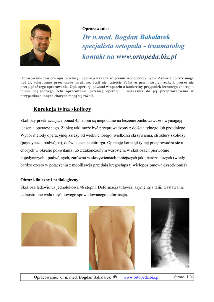 Opracowanie zawiera opis przebiegu operacji wraz ze zdjęciami śródoperacyjnymi. Zawarte obrazy mogą być źle tolerowane przez osoby wrażliwe. Jeśli nie jesteście Państwo pewni swojej reakcji, proszę nie przeglądać tego opracowania. Opis operacji powstał w oparciu o konkretny przypadek leczonego chorego i mimo poglądowego celu opracowania przebieg operacji i wskazania do jej przeprowadzenia w przypadkach innych chorych mogą się różnić. Korekcja tylna skoliozy Skoliozy przekraczające ponad 45 stopni są niepodatne na leczenie zachowawcze i wymagają leczenia operacyjnego. Zabieg taki może być przeprowadzony z dojścia tylnego lub przedniego. Wybór metody operacyjnej zależy od wieku chorego, wielkości skrzywienia, struktury skoliozy (pojedyncza, podwójna), doświadczenia chirurga. Operację korekcji tylnej przeprowadza się u chorych w okresie pokwitania lub z zakończonym wzrostem, w skoliozach pierwotnie pojedynczych i podwójnych, zarówno w skrzywieniach mniejszych jak i bardzo dużych (wtedy bardzo często w połączeniu z mobilizacją przednią kręgosłupa tj.wielopoziomową dyscektomią). Obraz kliniczny i radiologiczny: Skolioza lędźwiowa jednołukowa 46 stopni. Deformacja tułowia: asymentria talii, wystawanie jednostronne wału mięśniowego spowodowanego deformacją. Opracowanie: dr n. med. Bogdan Bakalarek © www.ortopeda.biz.pl Strona: 1 /4 Wskazania do przeprowadzenia operacji: ➔ skoliozy u chorych wieku pokwitania i późniejszym ➔ skrzywienia pierwotnie pojedyncze, podwójne ➔ skrzywienia o każdym stopniu skrzywienia Cel zabiegu: ➔ korekcja skoliozy i poprawa sylwetki ➔ zabezpieczenie przed bólami zwyrodnieniowymi kręgosłupa w wieku wczesnodorosłym Uwagi: ➔ korekcja tylna skoliozy w połączeniu ze spondylodezą jest wykonywana u młodzieży w wieku pokwitania i z zakończonym wzrostem. Czas wykonania operacji warunkuje prognozowany okres do zakończenia wzrostu (radiologiczny test Rissera). W przypadku konieczności korekcji tylnej kręgosłupa u dzieci wykonuje się korekcje bez spondylodezy (w razie potrzeby z dodatkowymi korekcjami co pewien czas), lub korekcje w połączeniu ze spondylodezą przednią ➔ w trakcie operacji z dojścia tylnego poza samym skorygowaniem kręgosłupa można dodatkowo wykonać zabieg plastyki żeber- resekcji garbu po stronie wypukłej (gibbektomii) i podniesienia żeber po stronie wklęsłej (torakoplastyki) ➔ jeśli skolioza w dziecka rosnącego jest duża i narasta, wtedy błędem jest czekanie na okres zakończenia wzrostu i doprowadzenie do bardzo dużego skrzywienia, które źle się koryguje i stanowi wyższe ryzyko powikłań neurologicznych ➔ jeśli zabieg korekcji i spondylodezy tylnej jest konieczny do przeprowadzenia u dzieci w trakcie wzrostu, to pod warunkiem wykonania jednoczesnej spondylodezy przedniej z obawy o powstanie zespołu skręcenia . Zespół skręcenia polega na dalszej progresji skrzywienia (głównie narastaniu torsji i rotacji kręgów) u dziecka jeszcze rosnącego po wykonanej wcześniej operacji spondylodezy tylnej ➔ aby uzyskać zadowalające korekcje w dużych sztywnych skoliozach (powyżej 80 stopni) przed właściwą korekcją tylną trzeba wykonać mobilizację kręgosłupa (wielopoziomowe dyscektomie przednie np. endoskopowo) Dowiedz się o operacji kręgosłupa z dojścia przedniego Opracowanie: dr n. med. Bogdan Bakalarek © www.ortopeda.biz.pl Strona: 2 /4 Zakres koniecznej instrumentacji podemuje się na podstawie rtg elongacyjnego kręgosłupa (wykonanego w pozycji wyciągu ręcznego). Na podstawie tego zdjęcia można też prognozować korekcję operacyjną. Tutaj kąt skoliozy w elongacji wynosi 25 stopni. W razie wątpliwości w wyznaczeniu kręgów granicznych instrumentacji, dodatkowo uzupełnia się o rtg w przechyłach. Tutaj zakres operacji jest mały i ogranicza się do 5 kręgów. Odsłonięcie łuków z cięcia tylnego w koniecznym zakresie. Na leżąco samoistna korekcja skrzywienia (jak na rtg elongacyjnym). Linia łuków jest prawie prosta, lecz ze względu na skręcenie kręgosłupa (torsję i rotację kręgów) skolioza nie jest skorygowana (byłoby to widoczne w rtg) W trakcie wprowadzania śrub transpedikularnych. Inna anatomii pedikulum strony wypukłej i wklęsłej wymaga różnych kątów ich wprowadzania. Przebieg pedikulum i poprawność wprowadzonych śrub kontroluje się śródoperacyjnie manualnie i radiologicznie Właściwa korekcja skoliozy polega na derotacji na prętach a następnie odcinkowej dystrakcji i kompresji wg ustalonego przedoperacyjnie planu Po stabilizacji kręgosłup obkłada się przeszczepami celem uzyskania spondylodezy Mogą to być własne kości z wyrostków kręgosłupa, talerza, z banku kości albo sztuczne Opracowanie: dr n. med. Bogdan Bakalarek © www.ortopeda.biz.pl Strona: 3 /4 Kontrola rtg po operacji- kręgosłup prosty 0 stopni Sylwetka po operacji- symetria talii i mięśniowych wałów lędźwiowych Dowiedz się o skoliozie: rodzajach, przebiegu i sposobach leczenia: Opracowanie: dr n. med. Bogdan Bakalarek © www.ortopeda.biz.pl Strona: 4 /4