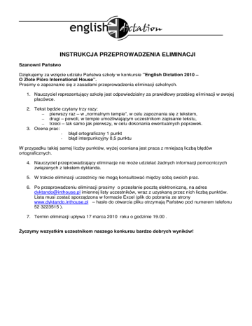 INSTRUKCJA PRZEPROWADZENIA ELIMINACJI Szanowni Państwo Dziękujemy za wzięcie udziału Państwa szkoły w konkursie ”English Dictation 2010 – O Złote Pióro International House”. Prosimy o zapoznanie się z zasadami przeprowadzenia eliminacji szkolnych. 1. Nauczyciel reprezentujący szkołę jest odpowiedzialny za prawidłowy przebieg eliminacji w swojej placówce. 2. Tekst będzie czytany trzy razy: – pierwszy raz – w „normalnym tempie”, w celu zapoznania się z tekstem, – drugi – powoli, w tempie umożliwiającym uczestnikom zapisanie tekstu, – trzeci – tak samo jak pierwszy, w celu dokonania ewentualnych poprawek. 3. Ocena prac: - błąd ortograficzny 1 punkt - błąd interpunkcyjny 0,5 punktu W przypadku takiej samej liczby punktów, wyżej oceniana jest praca z mniejszą liczbą błędów ortograficznych. 4. Nauczyciel przeprowadzający eliminacje nie może udzielać żadnych informacji pomocniczych związanych z tekstem dyktanda. 5. W trakcie eliminacji uczestnicy nie mogą konsultować między sobą swoich prac. 6. Po przeprowadzeniu eliminacji prosimy o przesłanie pocztą elektroniczną, na adres [email protected] imiennej listy uczestników, wraz z uzyskaną przez nich liczbą punktów. Lista musi zostać sporządzona w formacie Excel (plik do pobrania ze strony www.dyktando.inthouse.pl – hasło do otwarcia pliku otrzymają Państwo pod numerem telefonu 52 3223515 ). 7. Termin eliminacji upływa 17 marca 2010 roku o godzinie 19.00 . Życzymy wszystkim uczestnikom naszego konkursu bardzo dobrych wyników! REGULAMIN KONKURSU 1. Konkurs English Dictation 2010 – O Złote Pióro International House jest wojewódzką imprezą edukacyjną dla uczniów szkół podstawowych (klasy IV-VI), gimnazjalnych oraz ponadgimnazjalnych organizowaną przez Szkoły Języka Angielskiego International House oraz Gimnazjum i Liceum Towarzystwa Salezjańskiego w Bydgoszczy. 2. W konkursie może brać udział młodzież reprezentująca trzy odrębne kategorie wiekoweuczniowie szkół podstawowych (klasy IV-VI), gimnazjów oraz szkół ponadgimnazjalnych. 3. Konkurs polega na napisaniu dyktanda w języku angielskim. Zwycięzcą zostaje ten uczestnik, który zrobi najmniej błędów. W przypadku, gdy więcej niż jedna osoba popełni tę samą, najmniejszą liczbę błędów, nastąpi dogrywka przeprowadzona przez jurorów. 4. Konkurs składa się z eliminacji i finału. 5. Eliminacje odbędą się w rodzimych szkołach uczestników dyktanda do dnia 17.03.2010 i przeprowadzone zostaną przez nauczycieli języka angielskiego w trzech odrębnych grupach wiekowych, wśród uczniów szkół podstawowych (klasy IV-VI), gimnazjalnych oraz ponadgimnazjalnych. 6. Eliminacje odbywają się przy wykorzystaniu przesłanych tekstów lub/i pobranych plików audio (pliki – nagrane teksty eliminacji można pobrać ze strony www.dyktando.inthouse.pl Hasło dostępu do plików otrzymają Państwo pod numerem telefonu 52 3223515. 7. Po przeprowadzeniu eliminacji listy imienne uczestników wraz z uzyskaną przez nich liczbą punktów muszą zostać przesłane pocztą elektroniczną, na adres [email protected] . Lista musi zostać sporządzona w formacie Excel (plik do pobrania ze strony www.dyktando.inthouse.pl , hasło do otwarcia pliku otrzymają Państwo pod numerem telefonu 52 3223515 ). 8. Termin eliminacji upływa 17 marca 2010 roku o godzinie 19.00 . 9. Finał konkursu odbędzie się w Bydgoszczy 27 marca 2010 r. w budynku Gimnazjum i Liceum Towarzystwa Salezjańskiego w Bydgoszczy, ulica Pod Reglami 1, o godzinie 11.00. Ogłoszenie wyników o godzinie 14.00. Miejsce ogłoszenia wyników: Gimnazjum i Liceum Towarzystwa Salezjańskiego w Bydgoszczy. 10. Prace z finału English Dictaton zostaną sprawdzone przez komisję konkursu. W skład komisji wejdą wybrani nauczyciele ze szkół International House Bydgoszcz i International House Toruń, a także nauczyciel Collegium Salesianum. Werdykt jury jest ostateczny. 11. Zwycięzcy konkursu trzymają atrakcyjne nagrody rzeczowa oraz książkowe.