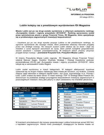 INFORMACJA PRASOWA 24 lutego 2015 r. Lublin kolejny raz z prestiżowym wyróżnieniem fDi Magazine Miasto Lublin już po raz drugi zostało wyróżnione w elitarnym zestawieniu rankingu „Europejskie miasta i regiony przyszłości 2015/2016”. Ranking opracowany został przez opiniotwórcze pismo z grupy Financial Times, fDi Magazine, które specjalizuje się w problematyce zagranicznych inwestycji bezpośrednich. - Uzyskana już po raz drugi wysoka pozycja Lublina w tak prestiżowym rankingu, to ogromne wyróżnienie dla naszego miasta, które potwierdza właściwy kierunek przyjętej przez nas strategii rozwoju. Na naszych oczach Lublin otwiera się na świat i staje się miastem o coraz lepszych warunkach do życia, które potrafi rozsądnie gospodarować swoimi zasobami i rozwijać przedsiębiorczość. W kolejnych latach chcemy utrzymać przyjęte tempo rozwoju – powiedział Krzysztof Żuk, Prezydent Miasta Lublin. W imieniu Prezydenta Miasta Lublin nagrodę fDi Magazine (Grupa Financial Times) odebrał Mariusz Sagan, Dyrektor Wydziału Strategii i Obsługi Inwestorów podczas poniedziałkowej (23.02) gali „Europejskie miasta i regiony przyszłości 2015/2016”, która odbyła się w warszawskim hotelu Regent. Lublin został wyróżniony w trzech kategoriach. W kategorii efektywność kosztowa uplasował się na drugim miejscu deklasując takie miasta jak Szczecin, czy Kraków. Czwarte miejsce zajął natomiast w kategorii kapitał ludzki i styl życia, wyprzedzając m.in. Poznań i Łódź. Lublin znalazł się także wśród 15 miast rankingu TOP 15 Strategii Miast Polskich fDi, stworzonym na podstawie strategii przyciągania bezpośrednich inwestycji zagranicznych w poszczególnych miastach, który jako jedyny w całym zestawieniu ma charakter jakościowy. W branżach priorytetowych dla rozwoju gospodarczego Lublina funkcjonuje ponad 500 firm z kapitałem zagranicznym. Wśród nowo powstałych, działających na terenie miasta od 2014 roku, możemy wymienić firmę Mobica, brytyjską spółkę informatyczną czy austriacką firmę Trimetis, specjalizującą się m.in. w usługach informatycznych i konsultingowych, która otworzyła swój pierwszy oddział w Polsce, wybierając na jego lokalizację właśnie Lublin. Spośród globalnie rozpoznawalnych firm swoje centrum usług biznesowych utworzyła tu w 2014 roku firma Convergys obsługująca niemieckojęzycznych klientów telekomunikacyjnej spółki Telefonica. Natomiast w branży logistycznej wymienić należy firmę Millennium Logistic Park, a także spółkę Goodman Albertic Logistics, która kończy już budowę imponującego centrum w Lublinie. - Przypływ nowych firm z kapitałem zagranicznym świadczy o stale rosnącym potencjale miasta. Położenie geograficzne Lublina, młode, dobrze wykształcone kadry oraz prężnie rozwijające się zaplecze akademickie, a do tego niskie koszty prowadzenia działalności gospodarczej tworzą dogodny klimat do inwestowania przez zagraniczne firmy – podkreślił Mariusz Sagan, Dyrektor Wydziału Strategii i Obsługi Inwestorów Urzędu Miasta Lublin. Ranking fDi "Europejskie miasta i regiony przyszłości 2015/2016" ocenia potencjał ekonomiczny, atrakcyjność dla biznesu, kapitał ludzki, koszty prowadzenia działalności gospodarczej oraz jakość życia. Tegoroczna edycja rankingu objęła 468 europejskich miast i regionów. Ranking powstał w oparciu o dane z użycie specjalistycznych narzędzi, jak rynki fDi i fDi Benchmark. Dalsze informacje: Mariusz Sagan Dyrektor Wydział Strategii i Obsługi Inwestorów, Urząd Miasta Lublin tel: 81 466 25 00 [email protected]
